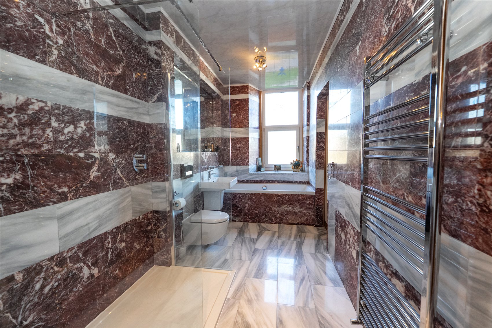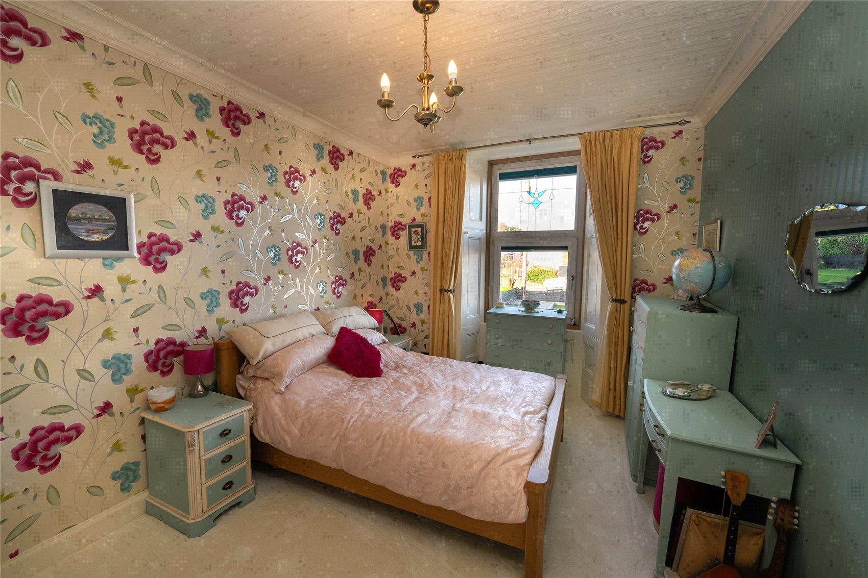 Outer door with stained glass window detail to entrance vestibule, period reception hallway with detailed cornice and corbels, cloakroom and wc with tiled floor and walls and neat inset downlighters. Stylish open plan sitting room and dining room with open Edinburgh press, feature marble fireplace and hearth incorporating contemporary living flame effect fire, 2 x ceiling roses and detailed cornicework, contemporary styled kitchen in contrasting white and red with Corian worktops and full white goods integration, inset downlights, glazed door to rear gardens and slim access corridor to sitting room, bedroom 1 with bay window formation and bespoke fitted furniture, a beautifully finished en suite bath and shower room is completed in contrasting pink and white marble with large glass shower enclosure, upright slimline stainless steel towel rail/radiator, inset downlighters and opaque and stained glass window to side, bedroom 2 has quality fitted bedroom furniture, cornice and a stained glass window to the side.