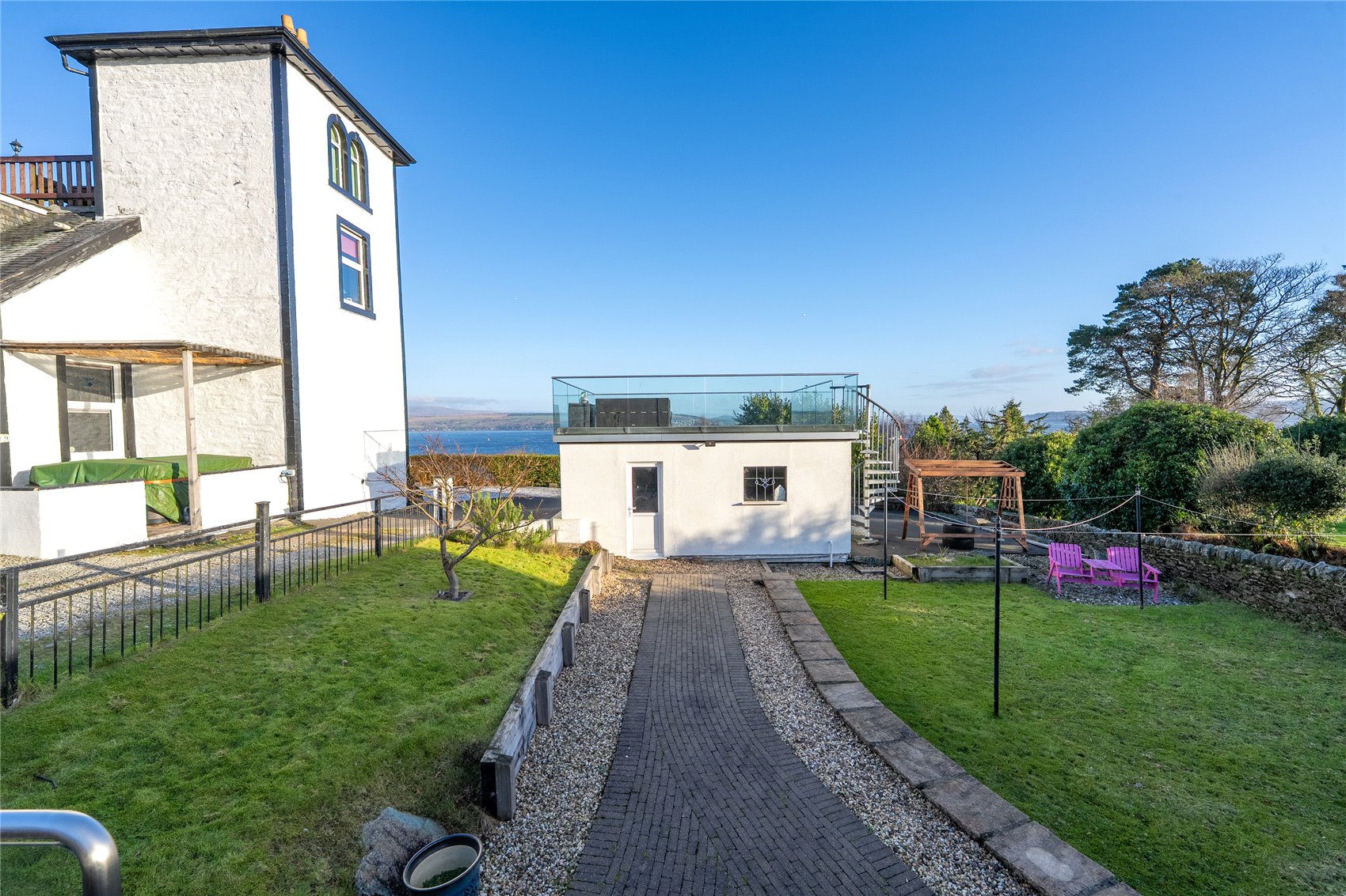 Shared black asphalt, hedge lined driveway terminating at the front of the house with good vehicle turning and hardstanding areas to white gravel and flagstones. The blacktop wraps around the garage and leads to the rear gardens which have been landscaped, small bloc paving pathway with honey gravel inserts and neat low level retaining walls to lawns, drying green and garden shed at the extreme rear. Rustic timber steps lead to a raised deck with stainless steel and glass balustrading and on to the BBQ hut. A galvanised steel spiral staircase leads to the roof terrace above the garage where there is an extensive raised terrace bounded by glass and stainless steel and from where there are wonderful views out across the adjacent sea and landscape. Directly behind the house is a canopy under which sits the hot tub, bounded by a low level white painted wall.