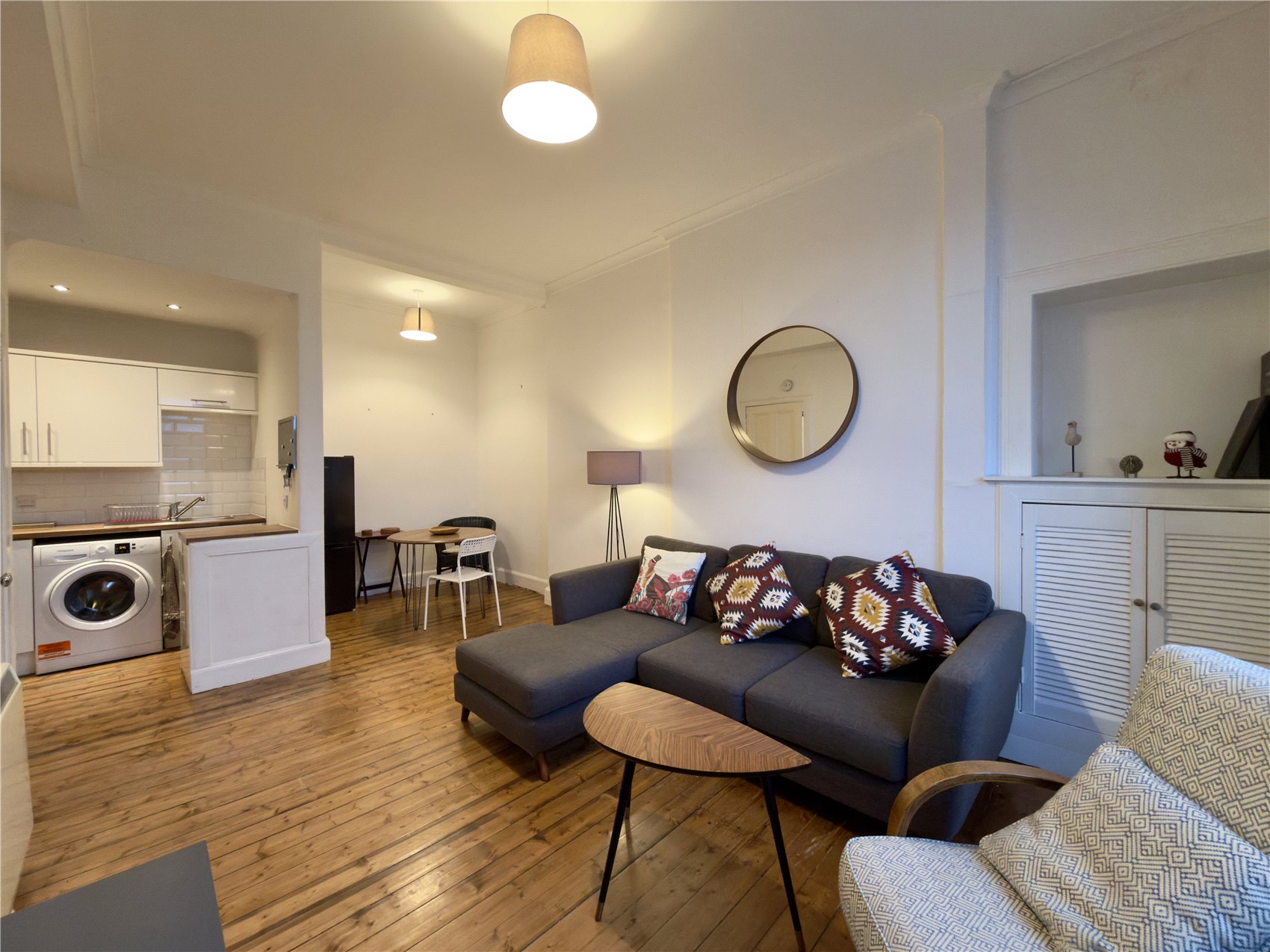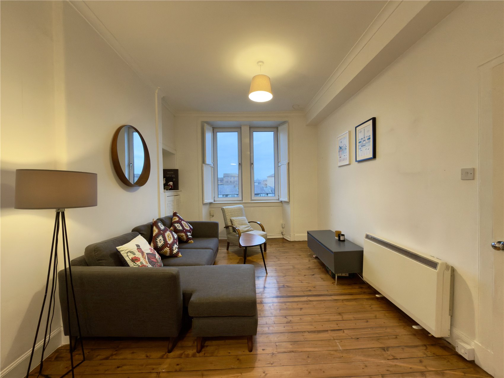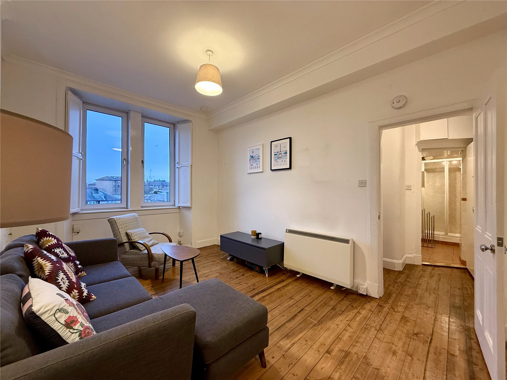 Door to the apartment with glazed fanlight above, entrance reception hallway with electrical switchgear cupboard. Stylish open plan sitting room with two west facing windows with working window shutters, half Edinburgh press with louvre doors concealing the domestic hot water tank, cornice, open plan to neat dining area and open plan fitted galley style kitchen with base and wall units completed with butcher’s block effect worktops and smart white metro style splashback tiling and inset downlighters. A double bedroom has a west facing window and features two sets fitted bedroom furniture one with mirror doors the second with opaque glazed doors. A shower room is fully tiled and has a wet wall and glass screen shower enclosure, tiling to full height and terra cotta floor tile, separate wc with west facing opaque glazed window and white painted wood panelling.
