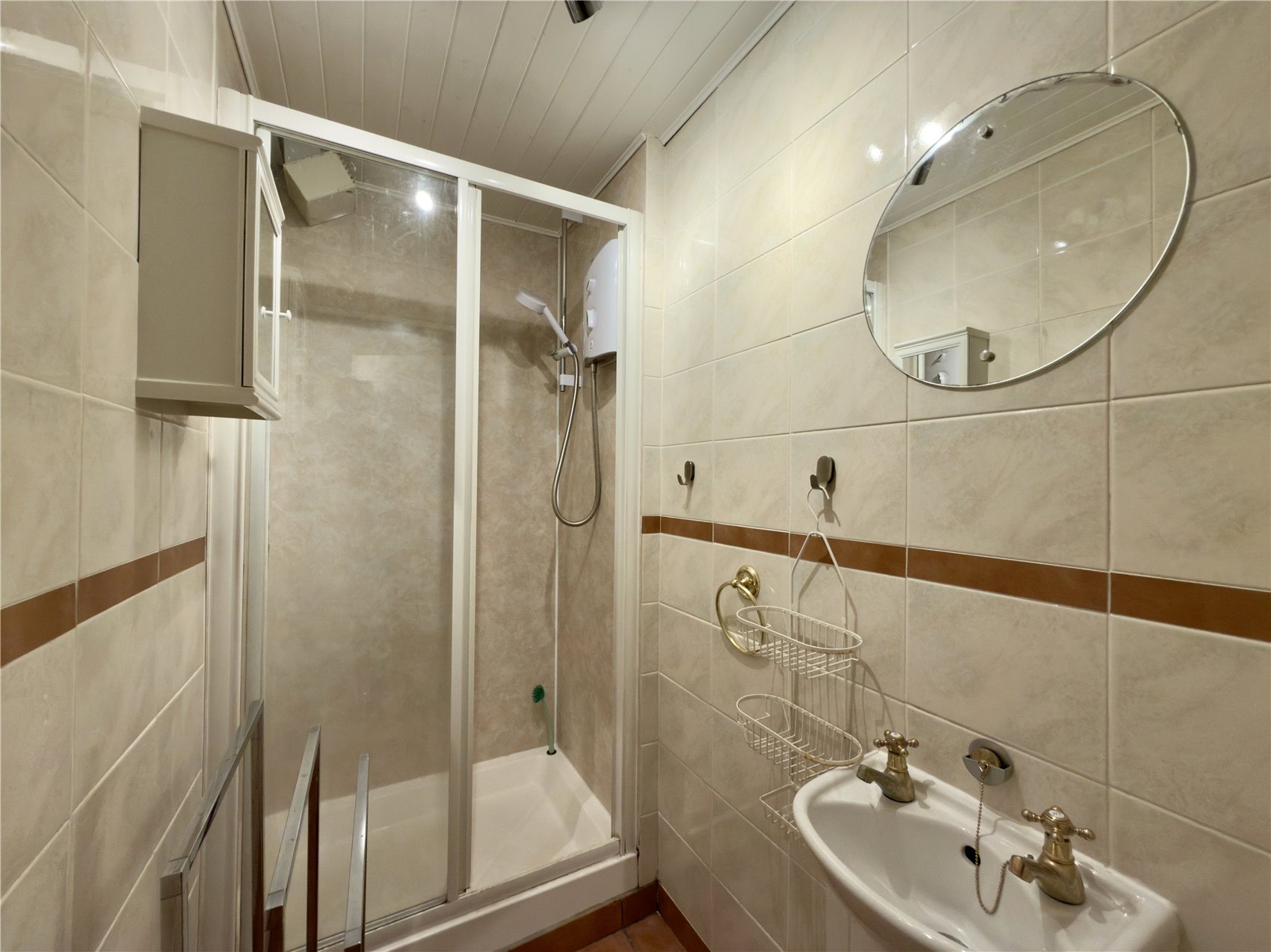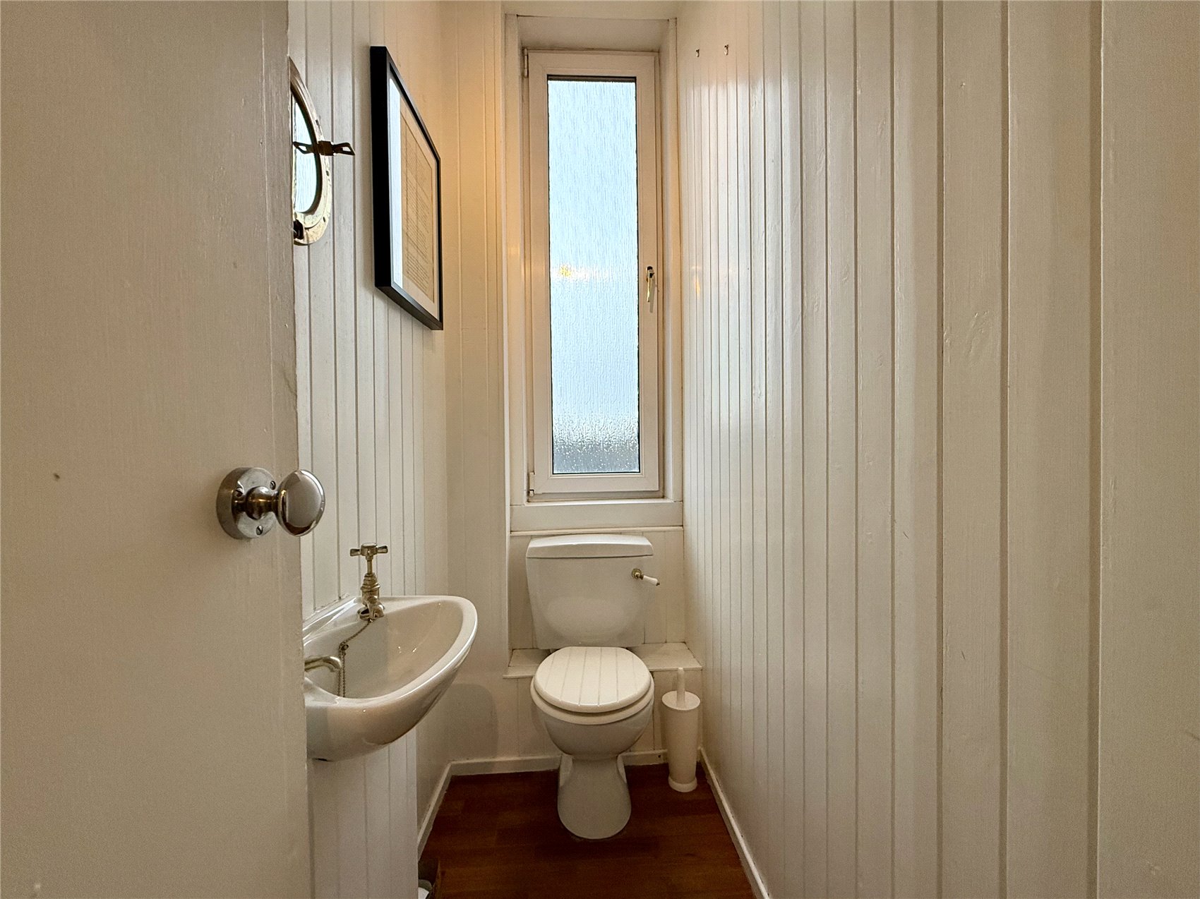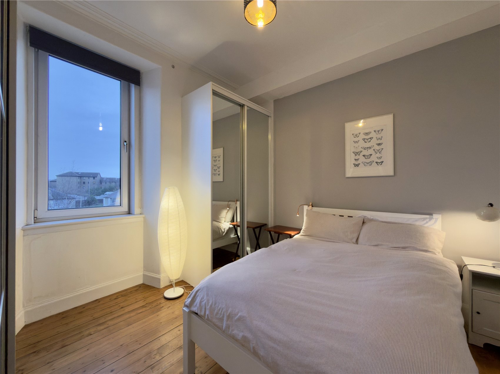 Door to the apartment with glazed fanlight above, entrance reception hallway with electrical switchgear cupboard. Stylish open plan sitting room with two west facing windows with working window shutters, half Edinburgh press with louvre doors concealing the domestic hot water tank, cornice, open plan to neat dining area and open plan fitted galley style kitchen with base and wall units completed with butcher’s block effect worktops and smart white metro style splashback tiling and inset downlighters. A double bedroom has a west facing window and features two sets fitted bedroom furniture one with mirror doors the second with opaque glazed doors. A shower room is fully tiled and has a wet wall and glass screen shower enclosure, tiling to full height and terra cotta floor tile, separate wc with west facing opaque glazed window and white painted wood panelling.