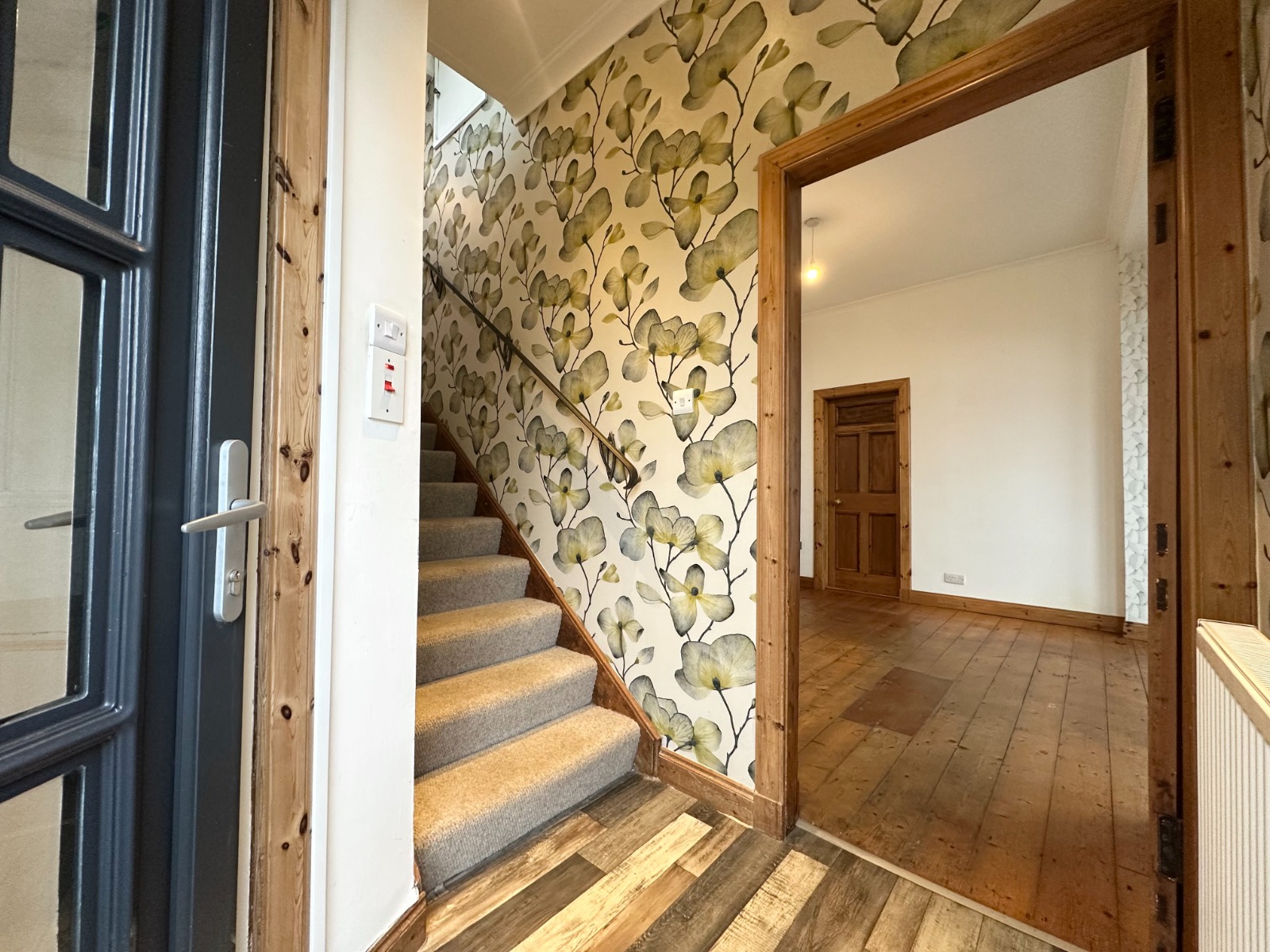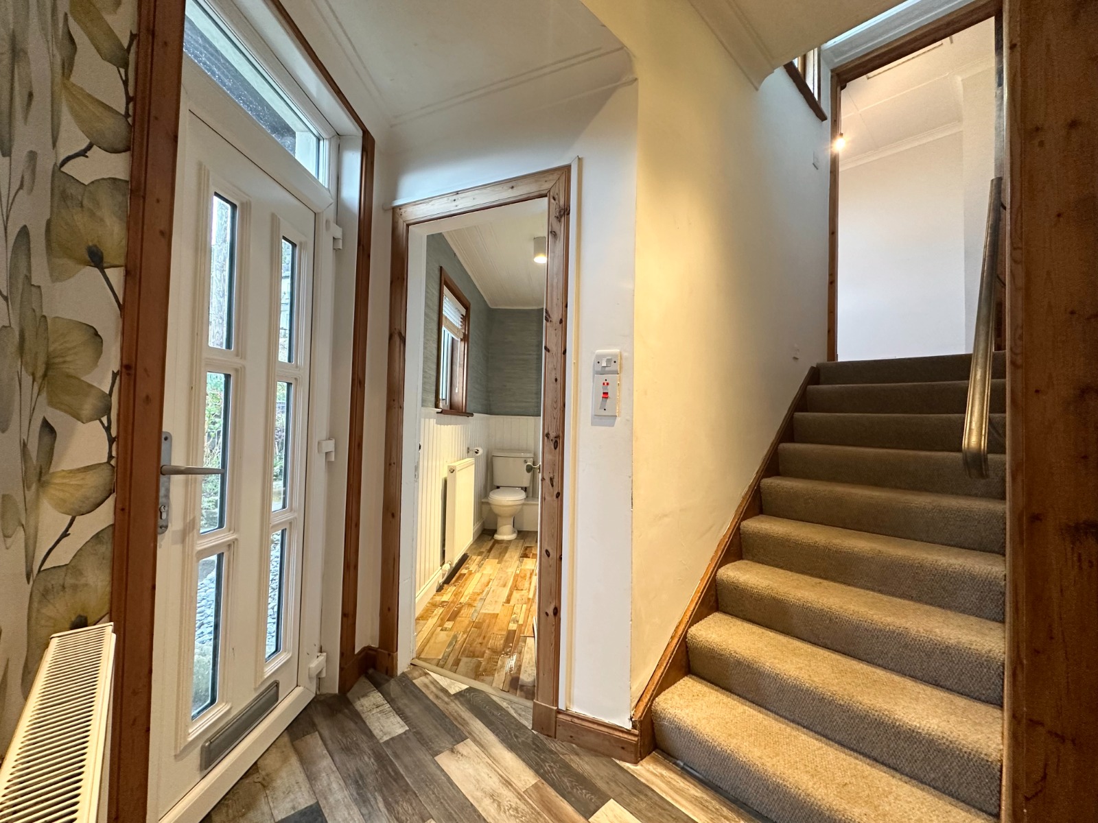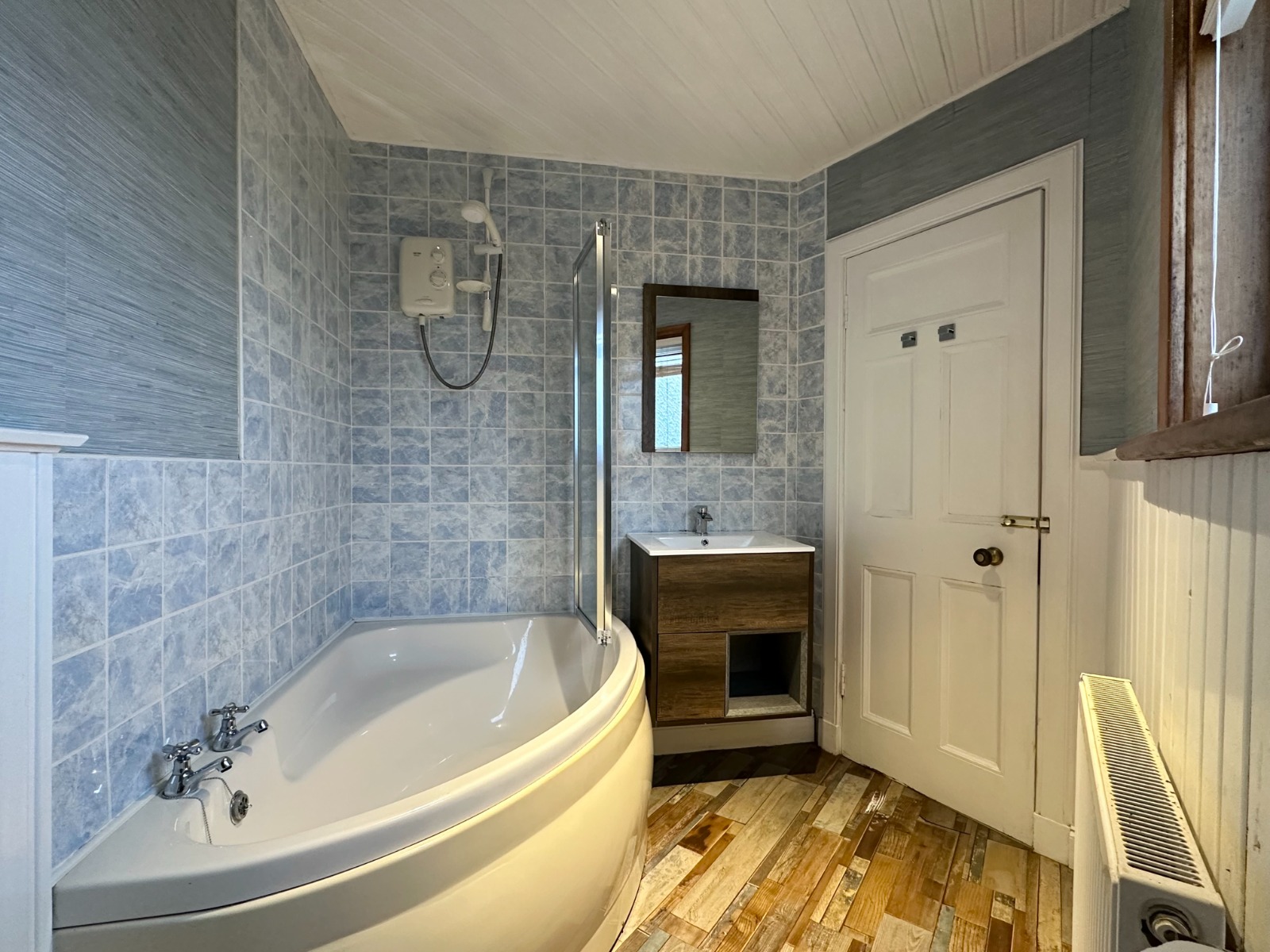This south facing property has been finished to a high standard with timber varnished floors throughout and consists of: a spacious lounge with brick built fire surround with an efficient Nordpeis wood burner and spectacular views of the water and the community gardens. A modern styled kitchen with wall and base kitchen units with integrated electric oven and gas hob and yet more amazing views of the water and hills in the distance. Two double bedrooms with original cast iron fire surrounds and spectacular water views. The family bathroom is spacious with a corner bath with electric shower above, toilet and modern wash-hand basin in a vanity unit.