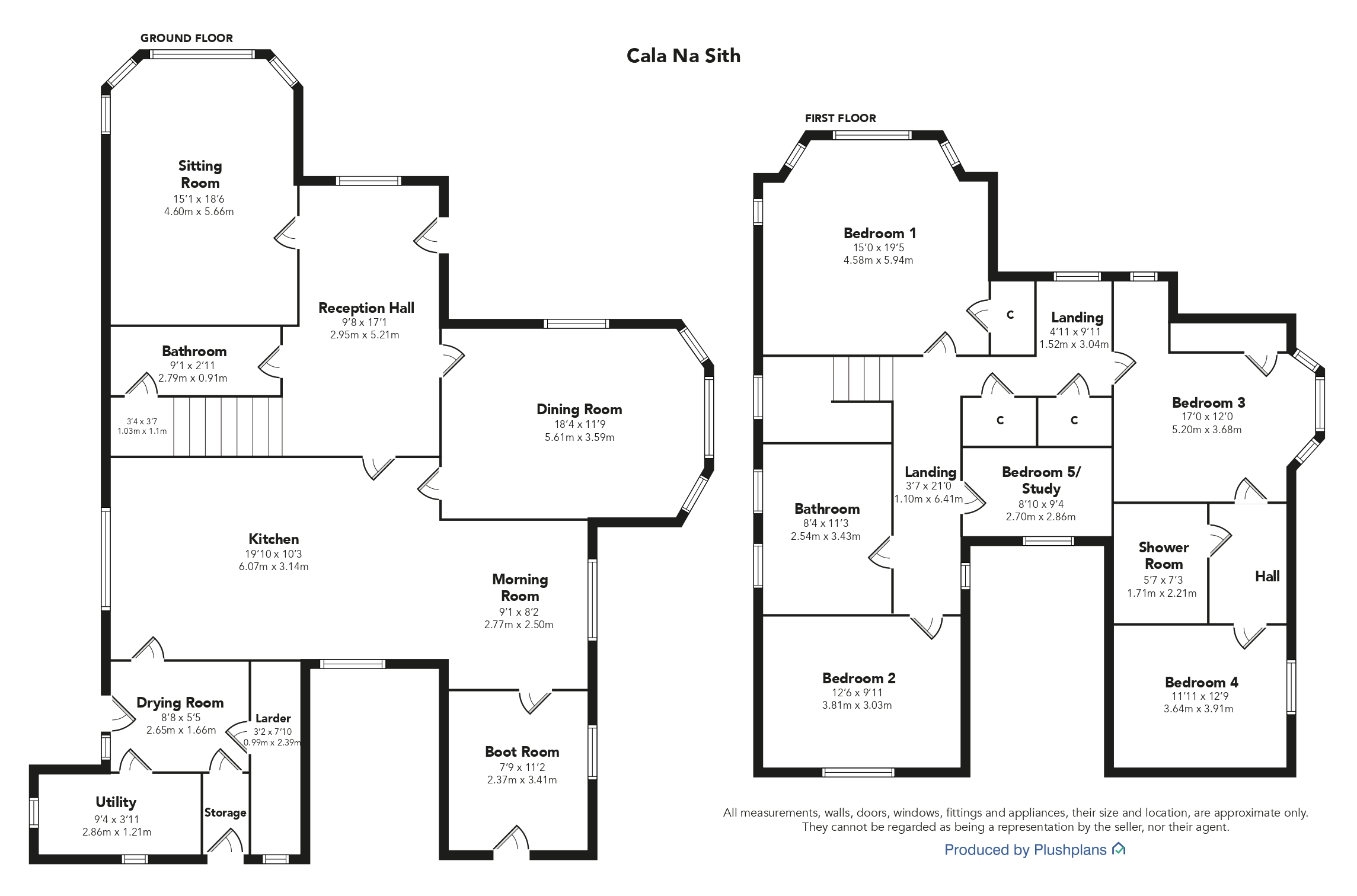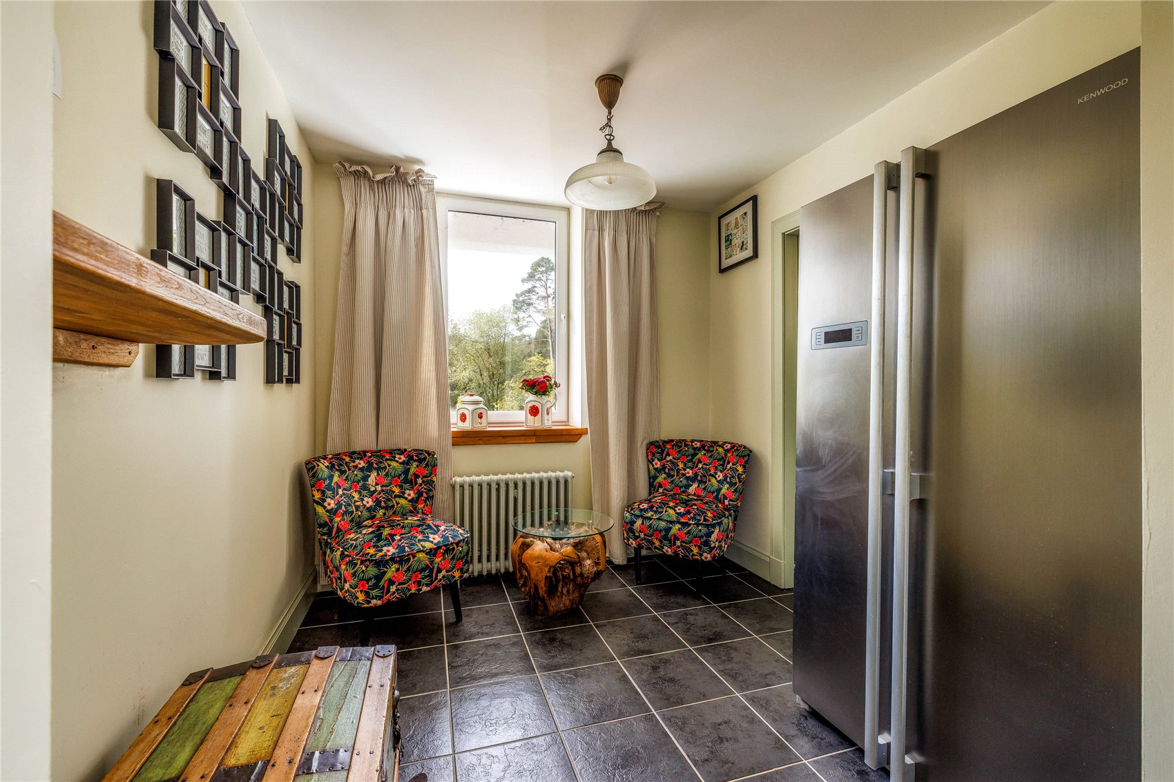 Staircase to the first floor, with natural timber handrail and newel post tops, painted spindles, turned at half landing with side window to woodlands and gardens, upper hallway with neat open plan study zone and window box seating, 2 x general purpose stores, both shelved, one with slatted shelving, bedroom 1 (master) with dual aspects and deep bay picture window, walk in fitted wardrobe, painted timber panel relief to two walls, principal bathroom, refitted to an exceptional standard with hi-end bathroom ware and deluxe ceramics, French style bath and instant shower, his and hers wash hand basins, heritage heated towel rail/radiator, access hatch to attic, bedroom 2 window to rear, Edinburgh press, bedroom 3 a dual aspect room with dormer to front and bay window to side, fitted wardrobe, communicating door to small inner hallway with long term eves stores and access to Jack & Jill refitted wet style shower room, heritage style heated towel rail/radiator, bedroom 4 with painted wood panel relief to rear wall, fitted wardrobes, single bedroom 5 or study.
