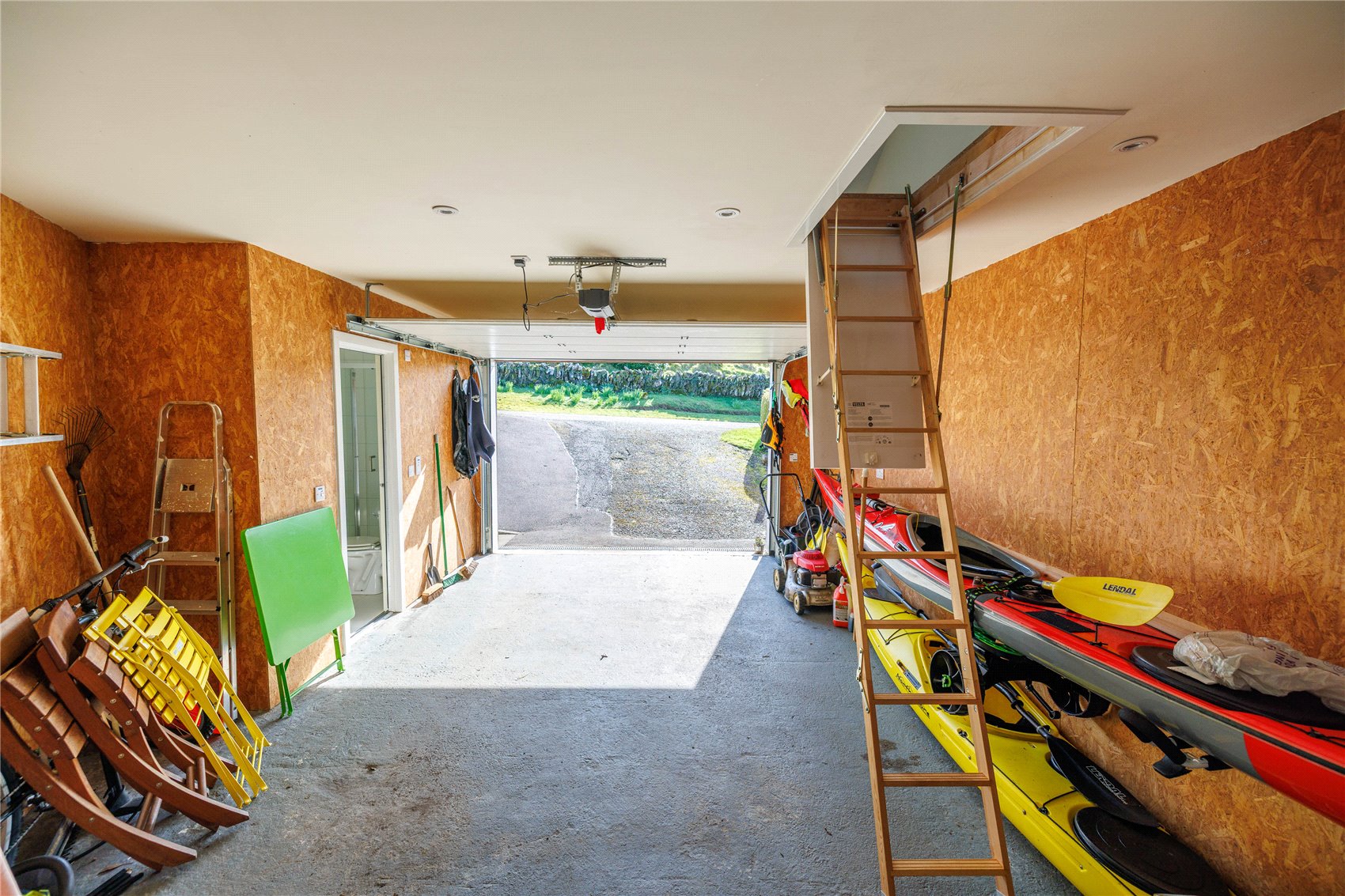 Attached recently- and traditionally-constructed, Siberian larch-clad garage with remotely-operated Hörmann up-and-over sectional door; personal door access; concrete floor; light and power supply; shower room. Access via wooden ladder to loft space with 2x Velux windows and access to eaves. Lean-to ‘greenhouse’, sub-floor storage.