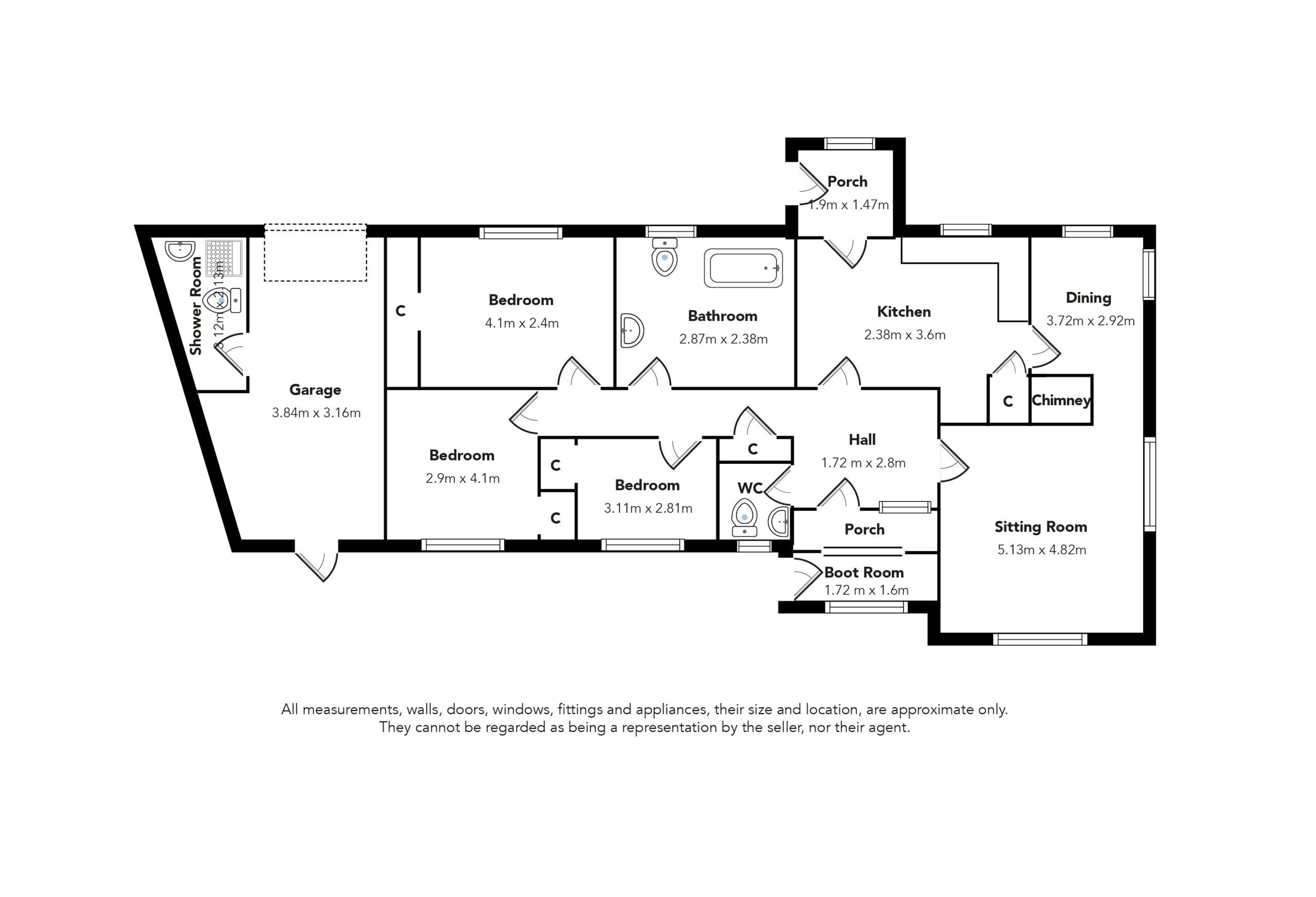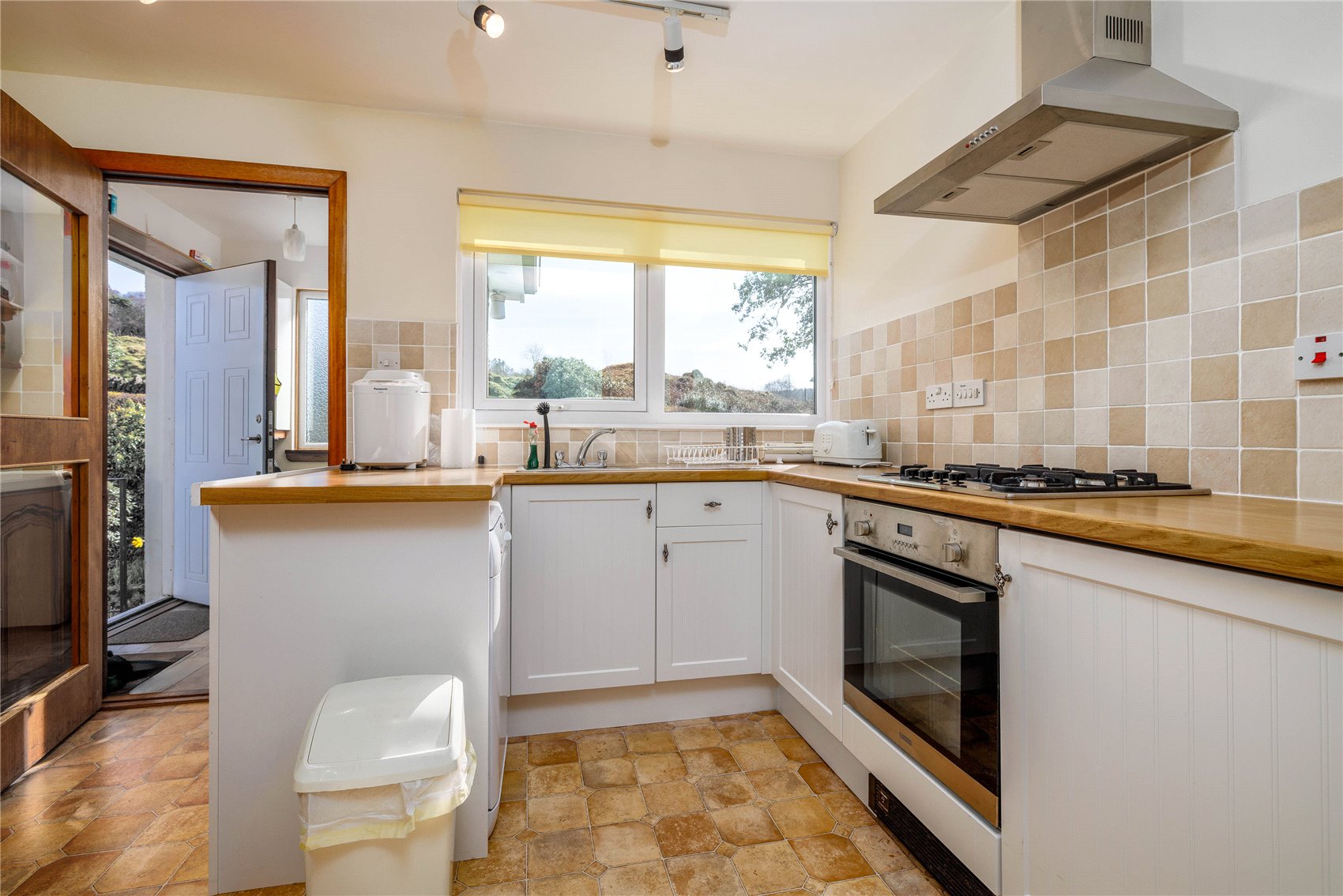 Outer front door to entrance vestibule/cloaks, housing the electrical switch gear; inner front door with glass insert to kitchen with window to gardens, cupboard housing the hot water tank; hallway to formal and generous sitting-cum-dining area with gas-lit fireplace, windows to all garden areas and partial waterscape views; wc with 2x heated towel rails; hallway stores; bedrooms 1, 2 and 3 with double fitted wardrobes and windows to gardens; family bath- and shower room with 2x heated towel rails; door to rear hall and porch; rear door to gardens.