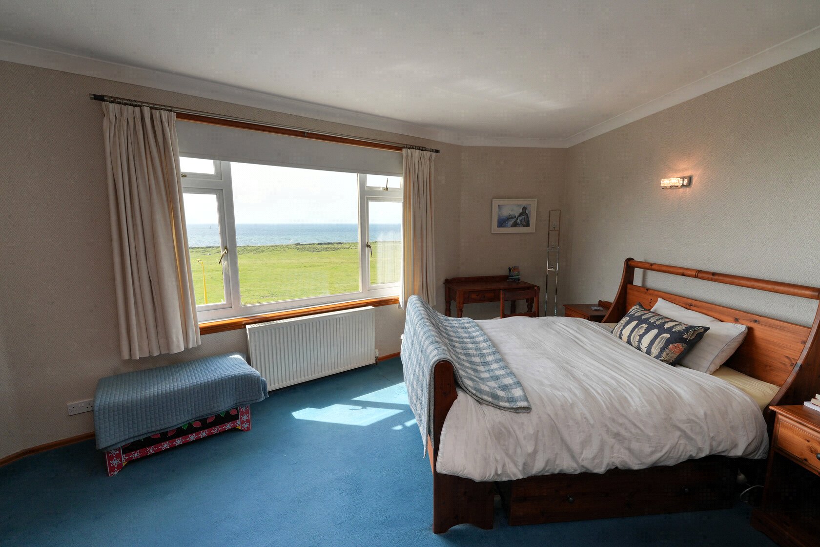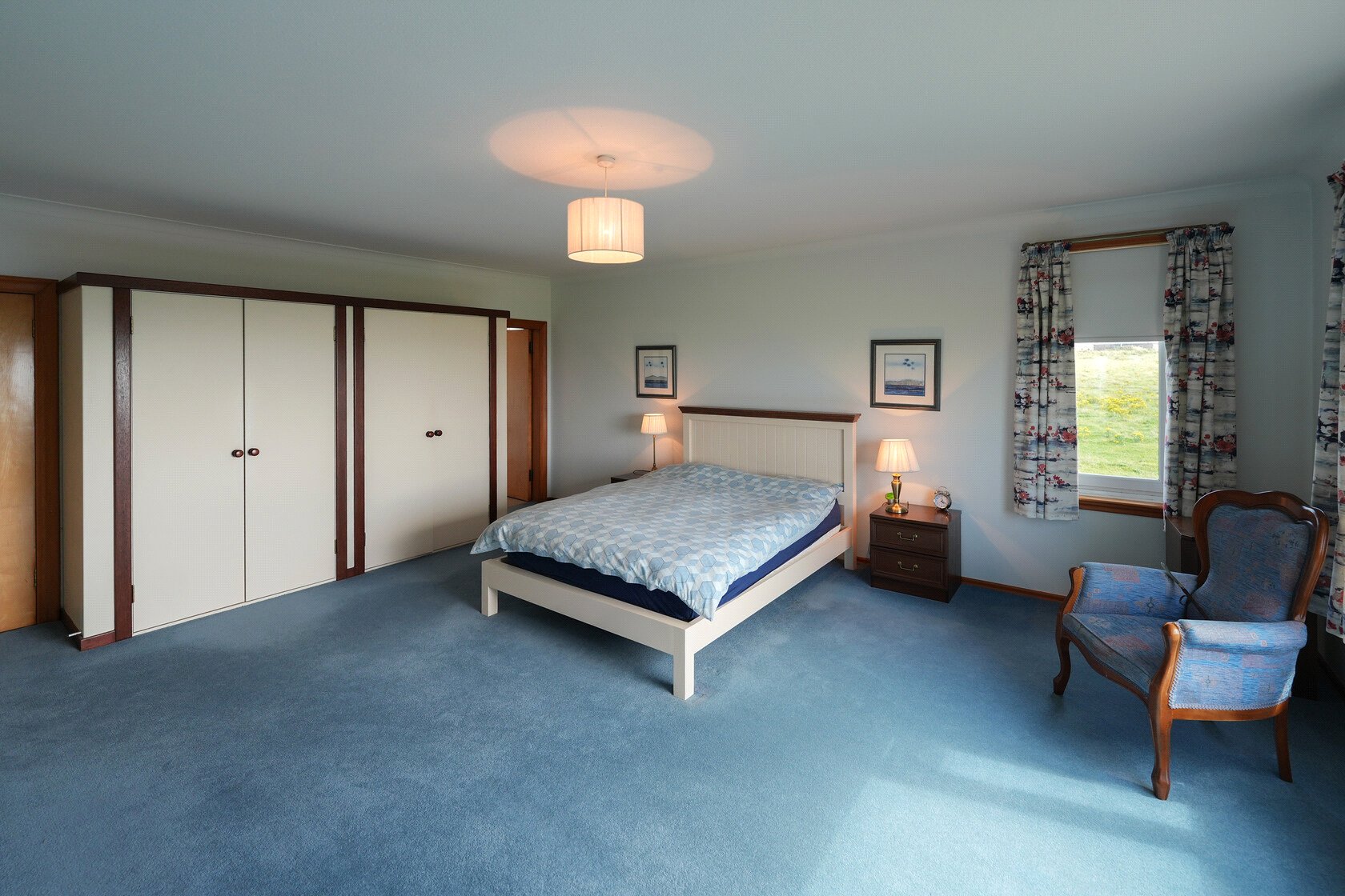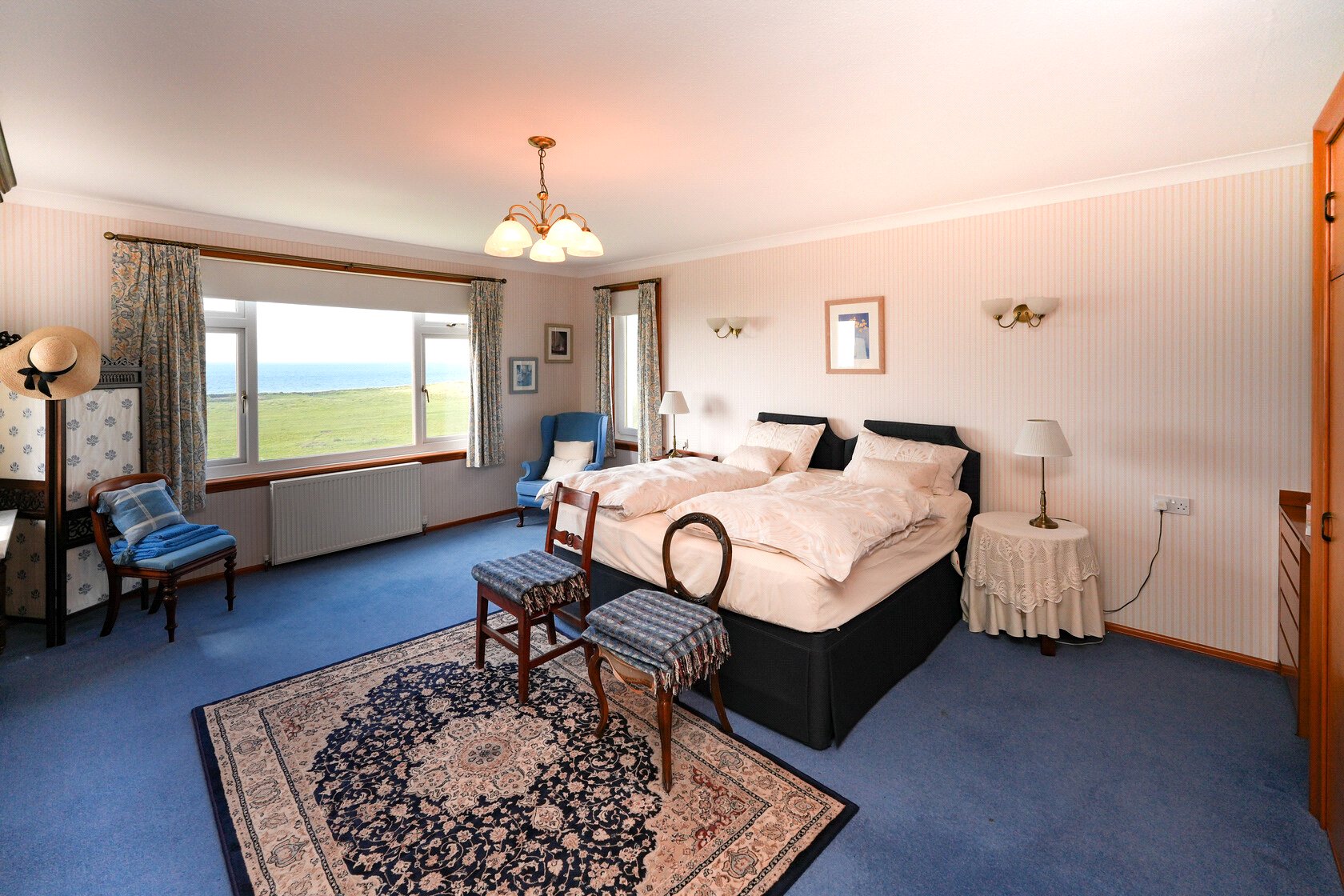 Via broad fitted staircase with carpet runner to half landing, windows overlooking front gardens and rolling countryside views, first floor landing, bedroom 1 (principal) with uninterrupted waterscape views, en suite shower room, bedroom 2 with window to waterscape views, bedroom 3 with 2 sets of fitted wardrobes and windows showcasing uninterrupted waterscape views. Linen stores with laundry pulley, housing the hot water tank, bedroom 4 with fitted wardrobes, countryside views, access to floored loft space, wc, family bathroom with bath and separate shower enclosure, window with views to Turnberry and the lighthouse.