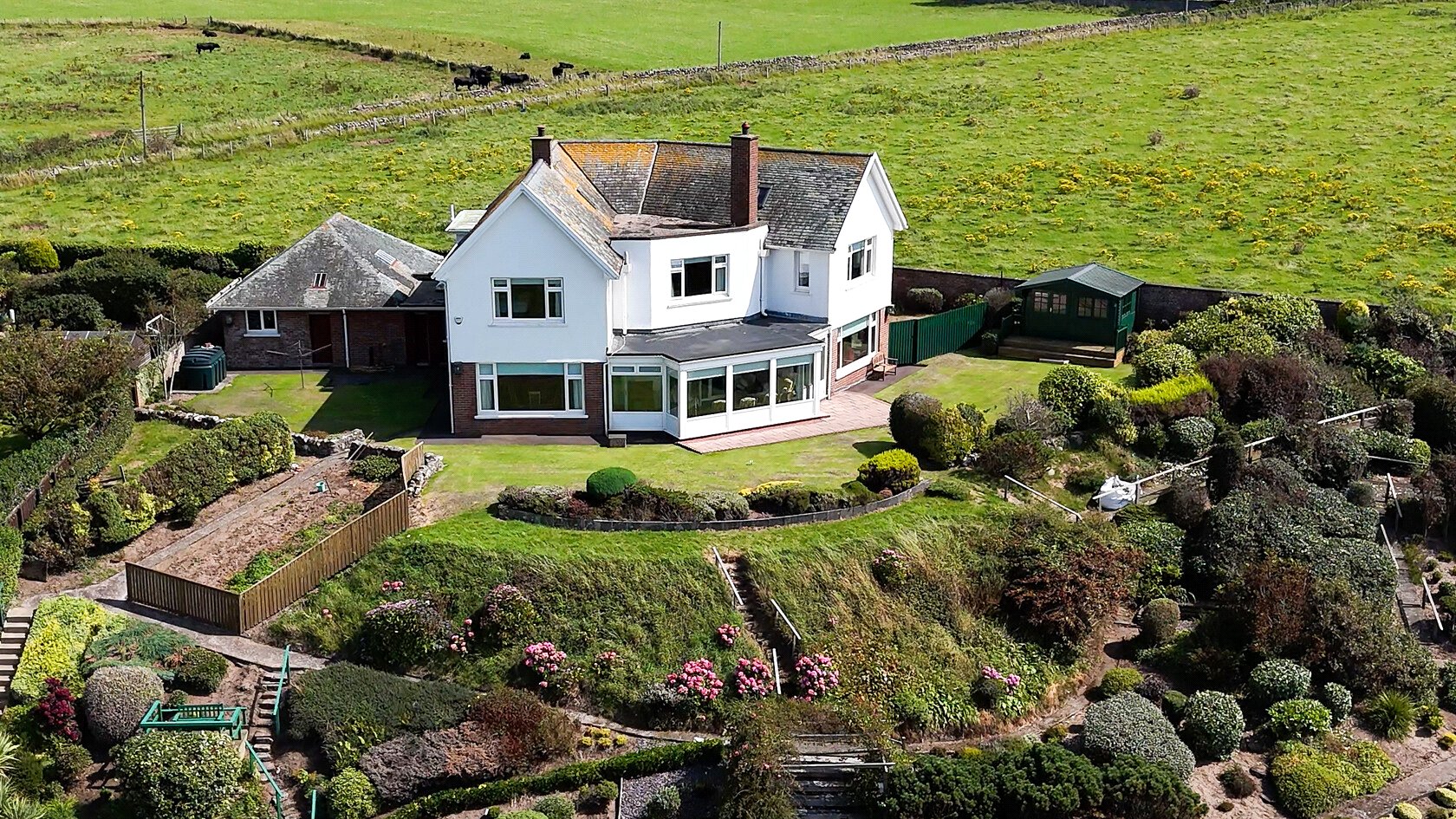Via twin leaf wrought iron gates to private driveway flanked either side by colourful flower beds and bushes, leading to ample vehicular hard standing, parking and turning apron. The front gardens at Fairlight are mainly laid to concrete and are bounded by a brick-built wall and hedging, two personal gates either side of the property provide access to rear gardens. Via the southern gate there is a small area of lawn with the greenhouse, a further gate provides access to the property’s main gardens. A well-maintained level lawn wraps around the rear of the property to a drying green, bordered by an array of planted beds and bushes, a paved patio area is located at the foot of the property and is ideally placed to enjoy alfresco sitting, dining, and evening sundowners and from where there are some of the finest views over the lower reaches of the Firth of Clyde. Well placed pathways laid to a combination of concrete, timber and stone steps wend their way through the lower rear gardens, all of which have been beautifully landscaped and stocked to bring all year-round interest. The gardens have been wonderfully zoned and include soft fruit and vegetable beds, apple and plum trees, oak and chestnut trees, to name a few. There are various timber seating areas staggered throughout the gardens and from where vast views can be enjoyed. The gardens are bounded by a brick built wall with a personal door providing access at the western boundary.