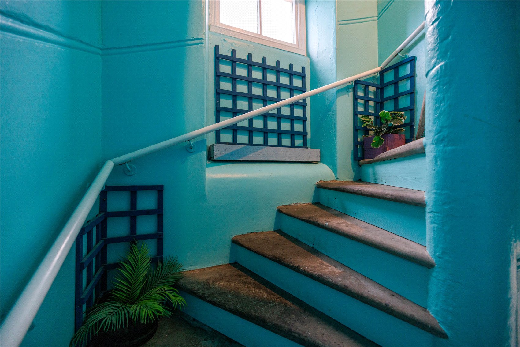 Tidy common entrance close to the rear of the building, stone staircase leading to the second floor.