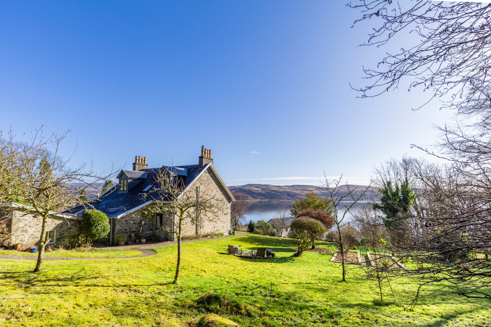 Hillside occupies beautifully stocked, gently sloping, well-tended and productive kitchen gardens and from its slightly elevated vantage point there are sublime views to the west Kyles of Bute, The Isle of Bute, Inchmarnock and south to Arran.