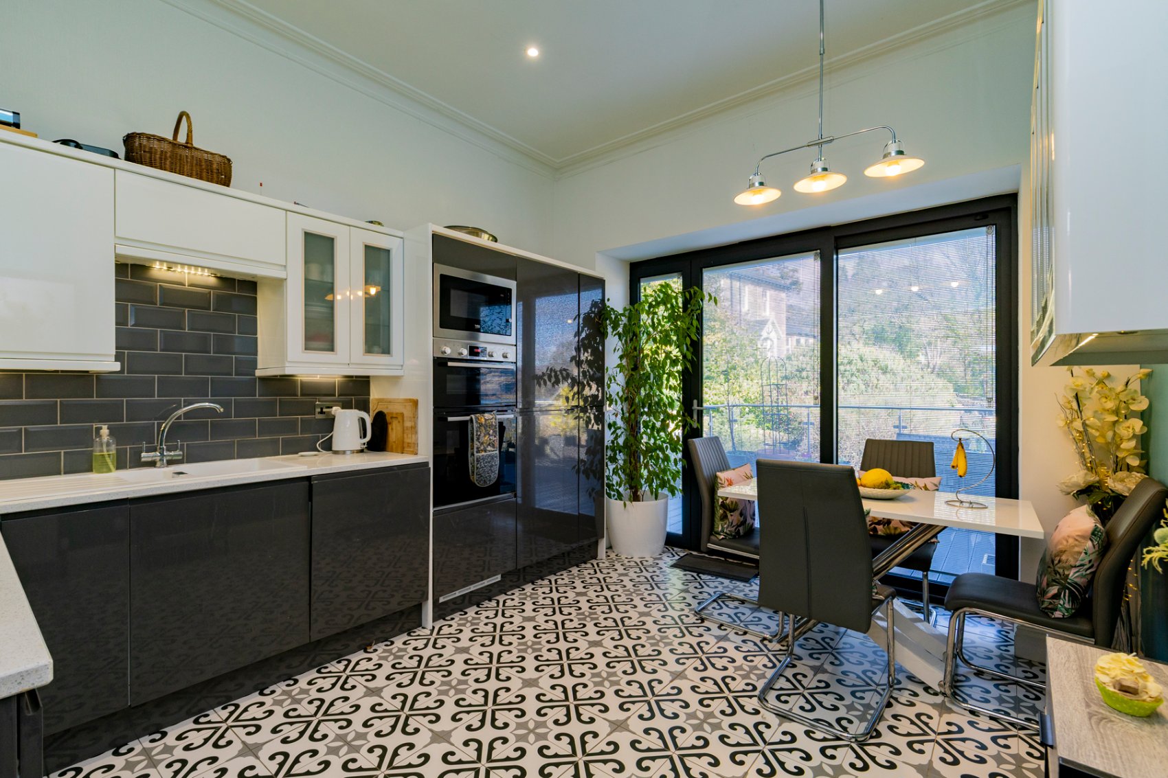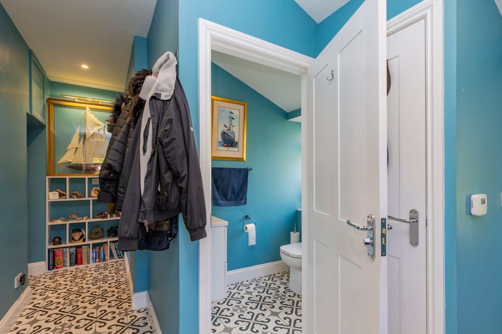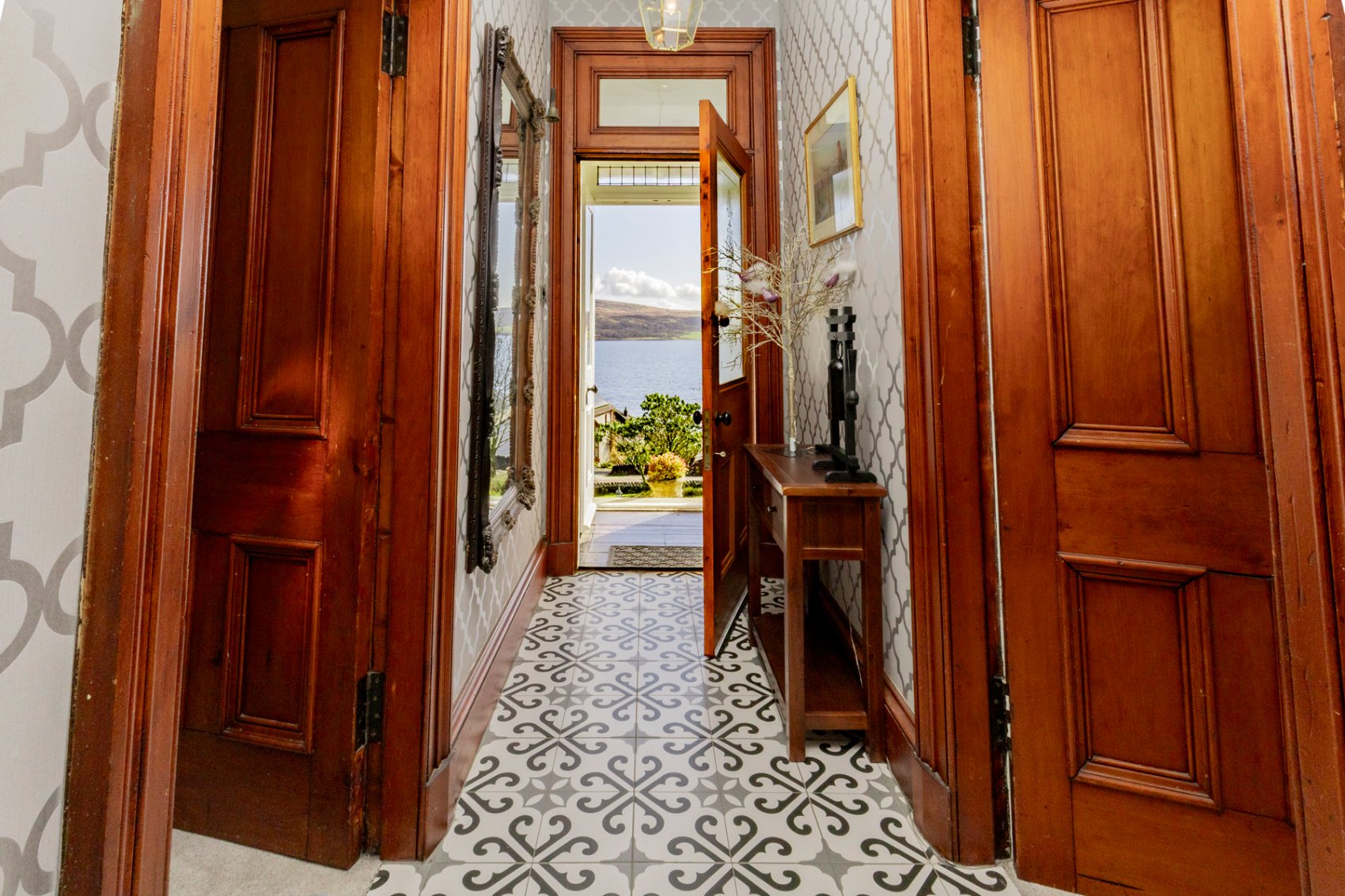 Outer twin leaf doors with stained glass panels to entrance vestibule, electrical switch gear, floor hatch leading to subcellar, inner front door with glass insert lead to welcoming entrance hall with striking floor tiles, formal sitting room with warming dual fuel stove, enclosed Edinburgh press, box window formation overlooking front gardens and waterscape views. Formal dining room with exposed illuminated press, box window formation to front gardens and waterscape views. Stylish integrated kitchen come informal breakfasting and dining area, sliding doors lead to generous decking ideal for alfresco sitting and dining, bringing the outside in and vice versa. Under stair store cupboard, bedroom 1 with fitted cupboard and enclosed Edinburgh press, window to rear gardens, contemporary en suite bath and shower room with walk in shower enclosure, heated towel rail. Rear hall leading to cloaks area, utility/boot room with laundry pulley, wc, cupboard housing the hot water tank, laundry cupboard, door to rear gardens.