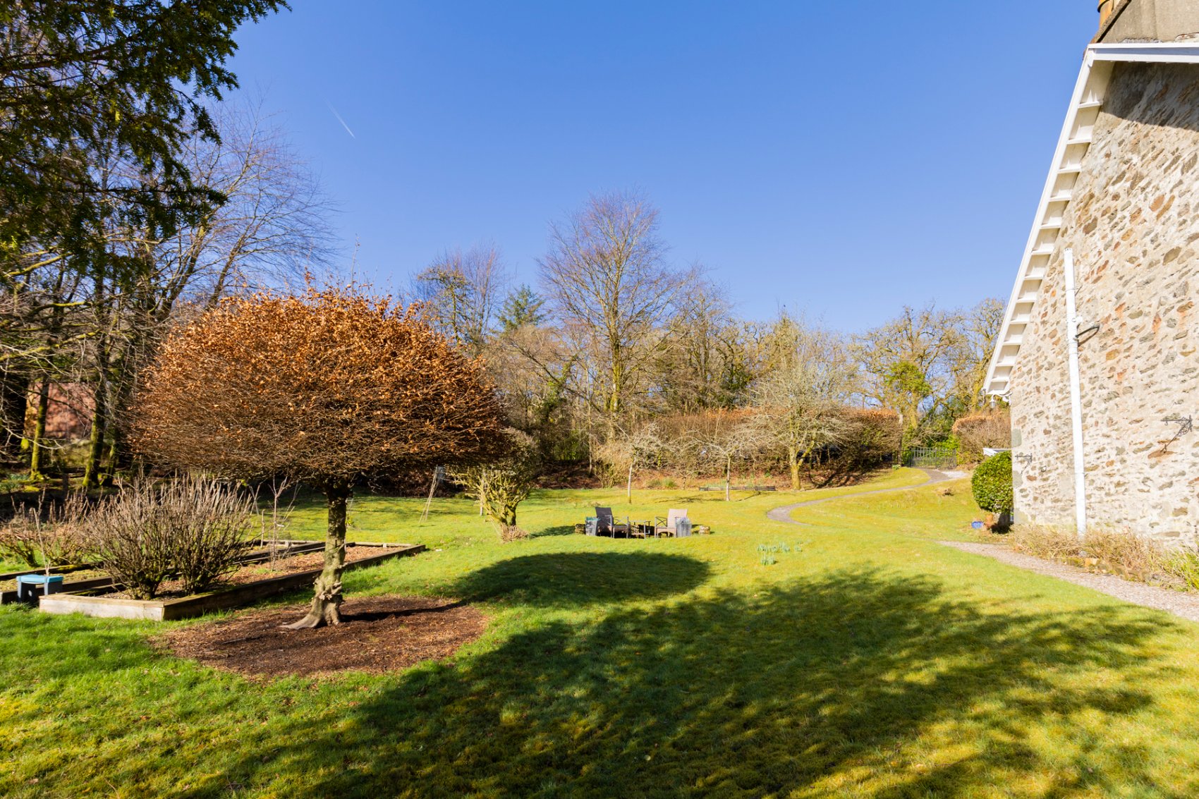 Steel gates from quiet rear access lane with vehicular parking and hard standing to concrete access pathway with evening spot lighting to rear door. Gardens are screened at the rear by a mature beech hedge. The gardens are laid mainly to grass with a variety of mature trees and bushes which include Laburnum, Cotoneaster, Hazels, numerous fruit bearing trees, copper and green beeches, evergreens, Fuschias. Soft fruit and vegetable garden along with a paved patio area, ideal for enjoying evening sundowners. There is a generous decking area with glass risers. This is an ideal space for alfresco sitting, dining and entertaining guests. A gravel pathway leads to the front gardens and to the property’s front door. The front gardens are gently sloping to grass with natural exposed rocky outcrops and where there are further specimen trees and bushes. A gravel pathway with evening spot lighting leads to the bottom of the gardens which are bounded by a stone wall and via a gate with convenient access directly to the B8000.