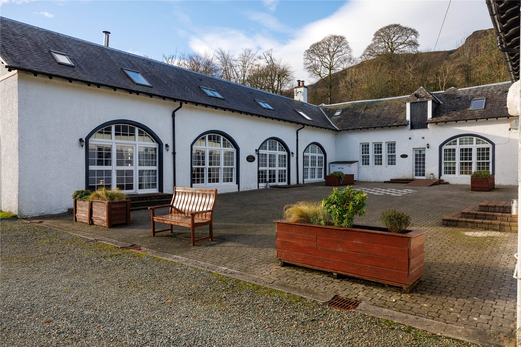 The nine properties are formed by the former farmhouse and steadings buildings; they are in two separate structures and are of white painted harled exterior finish under slated roofs. A particular feature is the former cart sheds which have been beautifully incorporated within the development, the access arches of which now feature immediately appealing fenestration and some with natural exposed stone.