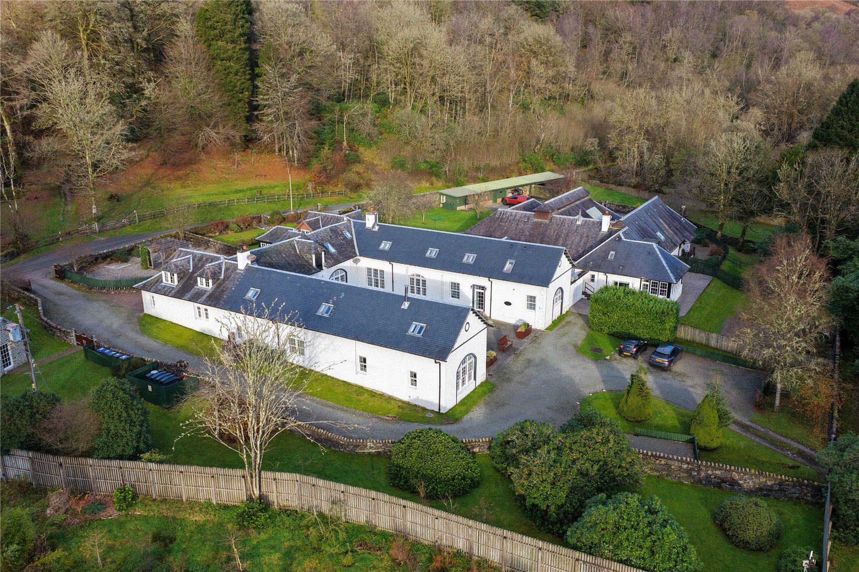 A fully restored combination of income producing courtyard cottages, ancillary buildings and about 20 acres gardens and semi ancient native woodland.