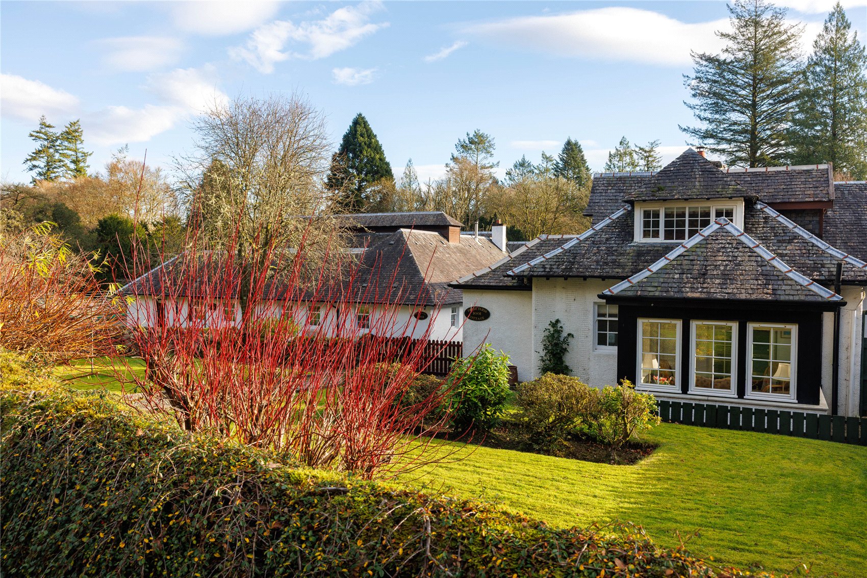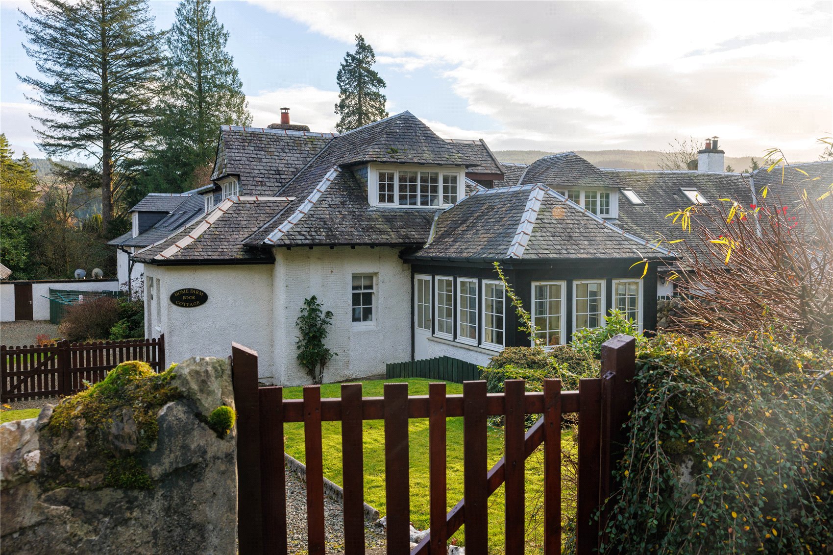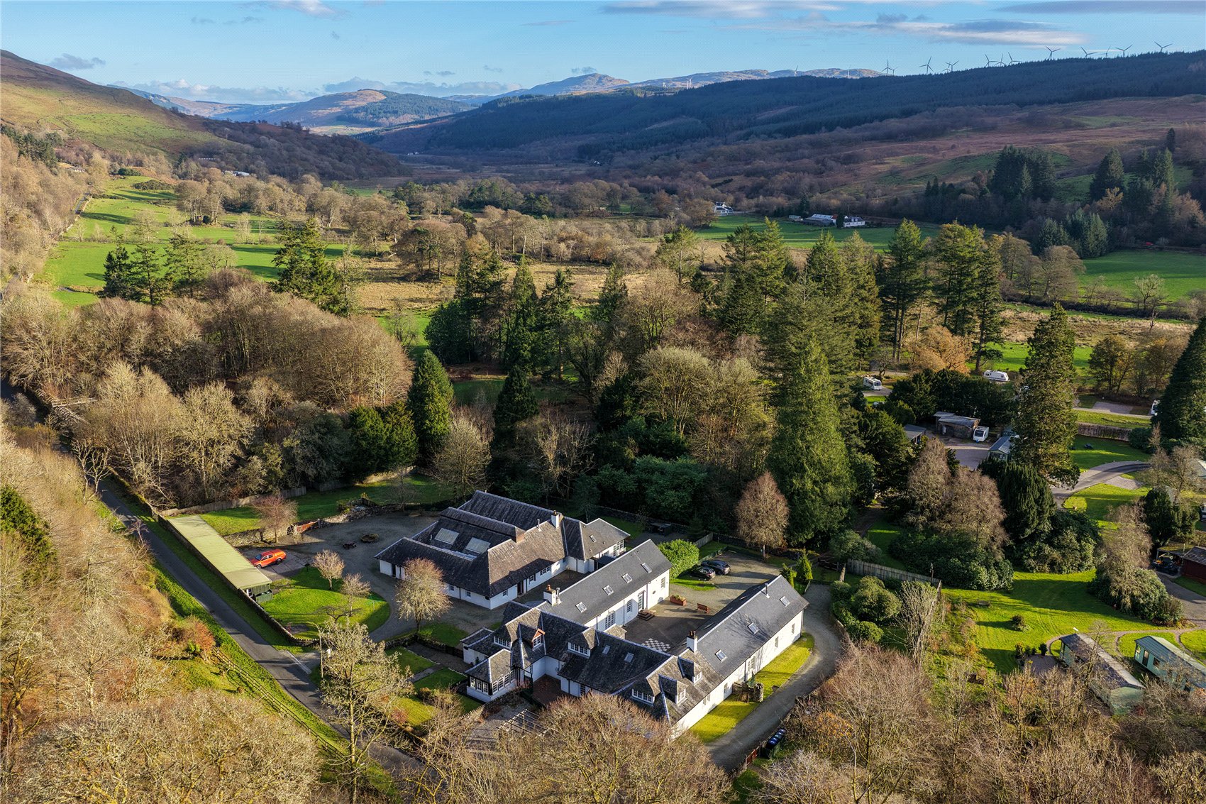 Home Farm Cottages are set in Glendaruel, a classic west highland Scottish glen with its high sided mountains and lower plains which form the banks of the river Ruel, the river which flows through the glen to the sea at Loch Riddon. Cruach Chuilceachan is the craggy rocky high top which forms the backdrop to the west and Cruach Nan Cuilean is the high top to the east. The parcel of assets enjoys a leafy and bucolic situation and are set just off the minor road with passing places, that connects the top and the bottom sides of the glen on its western side.
