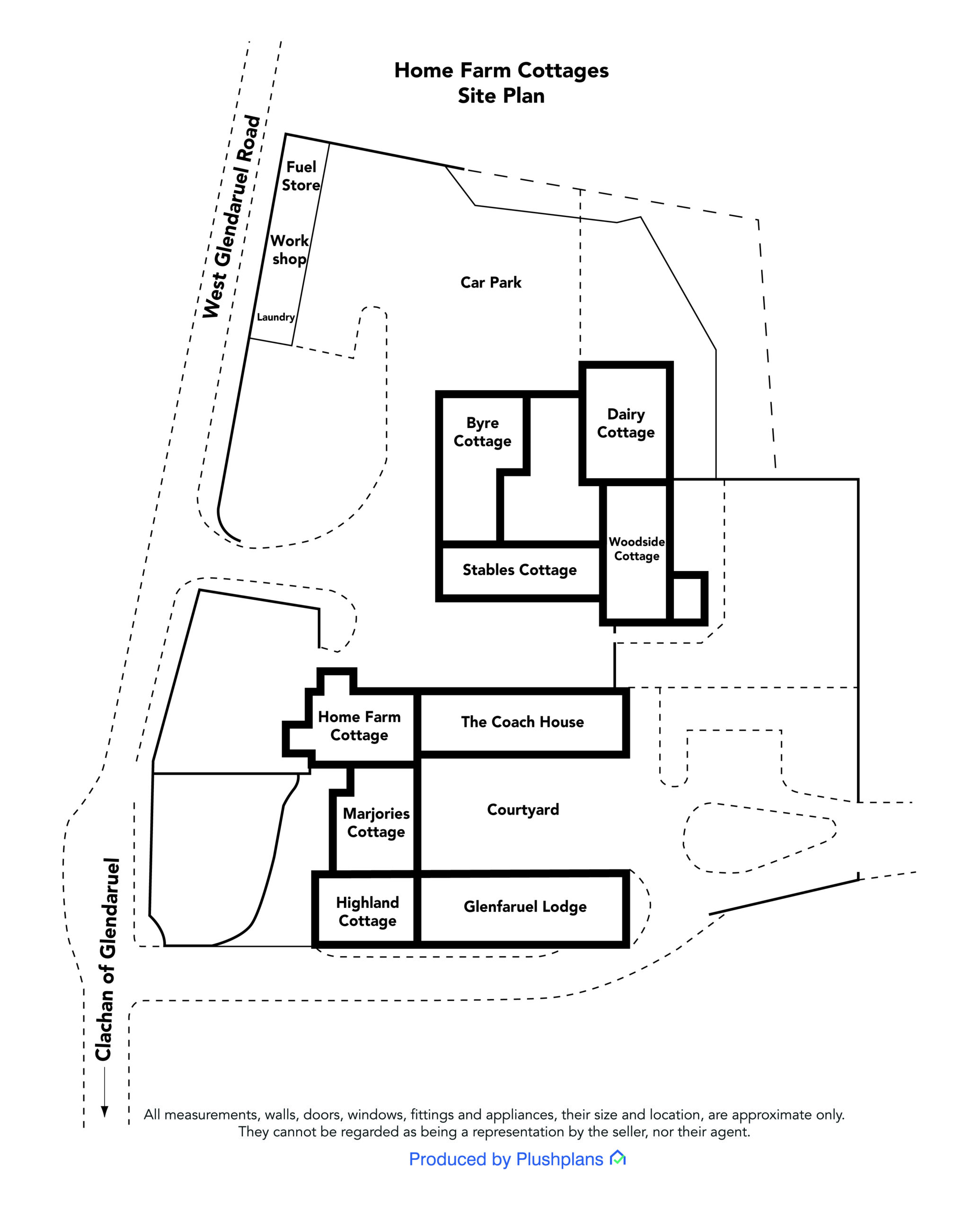 The grounds at Home Farm Cottages have been beautifully maintained, on arrival, mown grass verges are fringed with stone built exterior walls and post and rail fencing. Twin leaf county gates at the south lead to a gravel surfaced driveway and a block paved apron in front of Highland Cottage, The drive continues beyond circular twin gate piers terminating at a gravel surfaced parking and vehicle turning area at the rear. The structures form a rear inner courtyard set to block paving with black and white external chess board. Twin leaf gates off the drive lead to gardens beside the water plant building which are bounded by stone walls and close board fencing, discreet oil tank and refuse bin stores. Twin leaf gates at the northern side lead to a generous gravel surfaced yard leading to northern properties and terminating at the range of outbuildings. The grounds are part compartmentalised, some of the properties having their own dedicated gardens. 1.78 acres (0.72Ha)