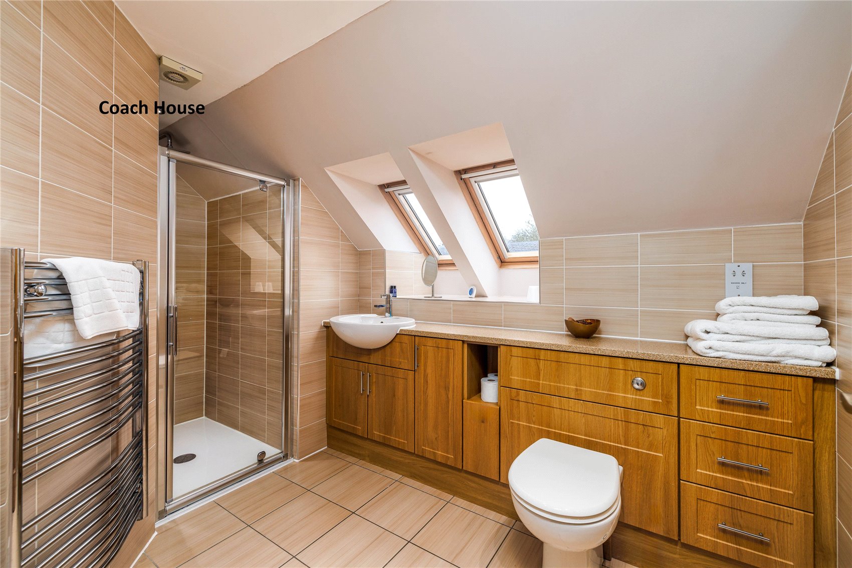 Staircase to upper hallway with 2 x velux windows, bedroom 1 with 3 x velux windows, eves stores, twin leaf door fronted fitted wardrobes, en suite shower room, bedroom 2 with 7 x velux windows twin leaf door fronted fitted wardrobes, en suite shower room.