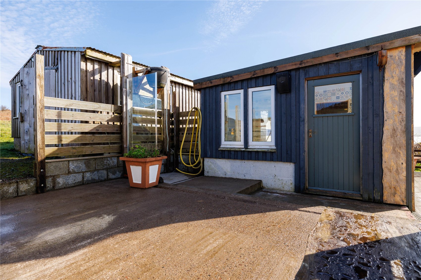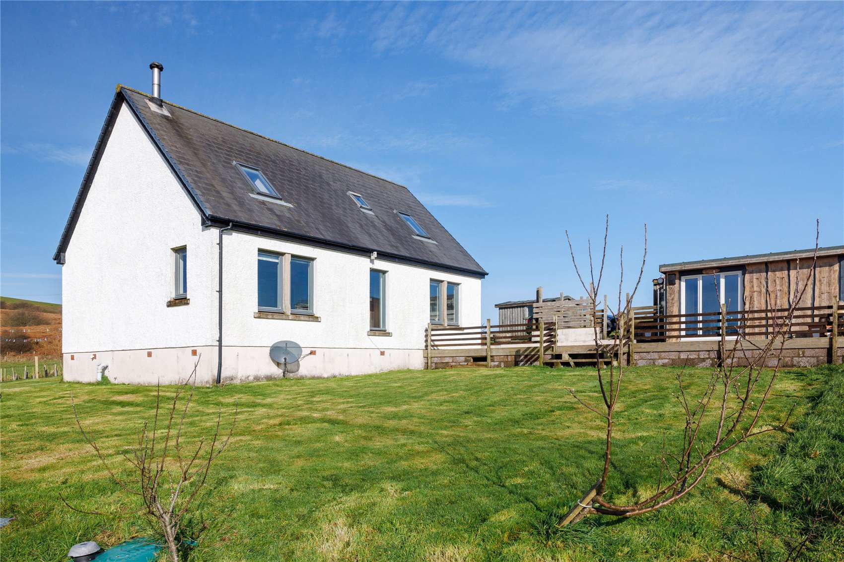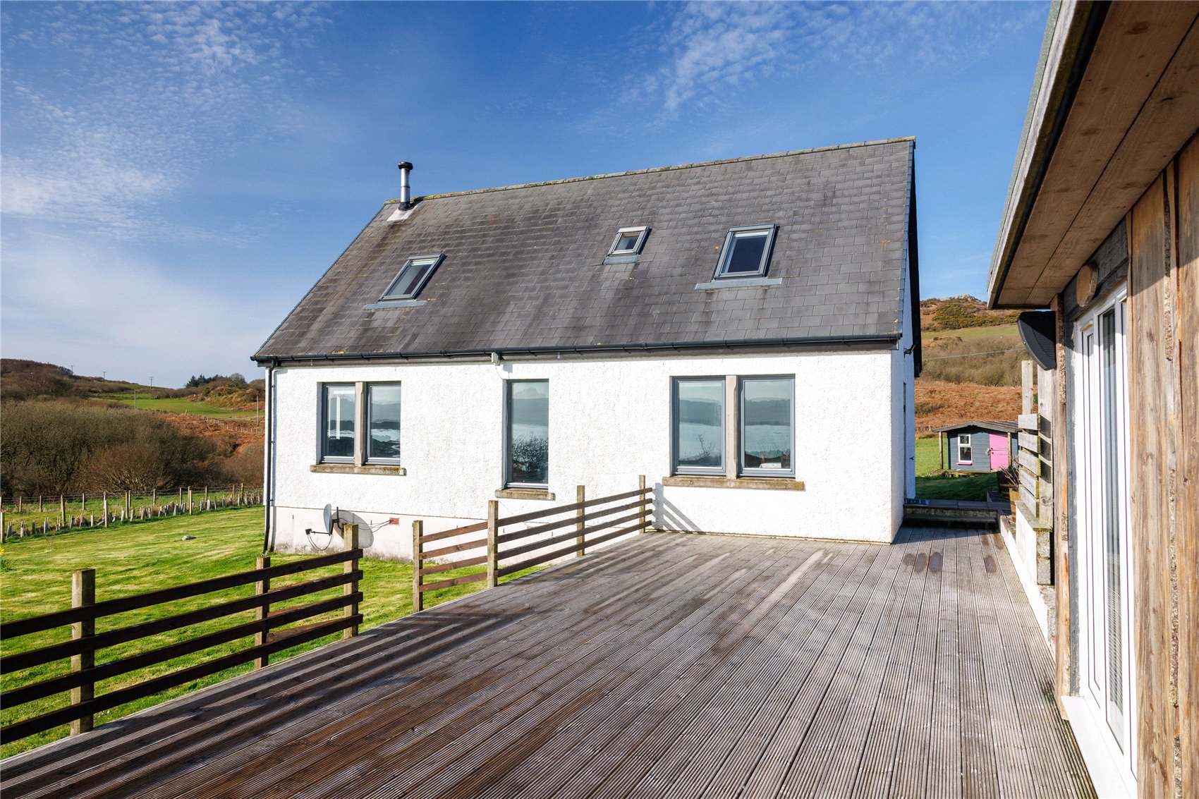 Via a steel swing gate to gravel driveway leading to ample vehicular hard standing and parking area. The gardens at Millstone Cottage are relatively low maintenance by design and broadly laid to lawn with an assortment of specimen planted trees and with a drying green. A generous timber decking which connects to the property is an excellent space for alfresco sitting, dining and entertaining guests, and from where there are sublime views across the sound of Gigha to the mainland adjacent. A further concrete patio area which connects to the outdoor spa facilities such as the cold-water ice bucket and outbuilding housing the relaxation room, sauna and shower facility. The gardens extend to circa 0.25 and are bound by a Rylock fence.