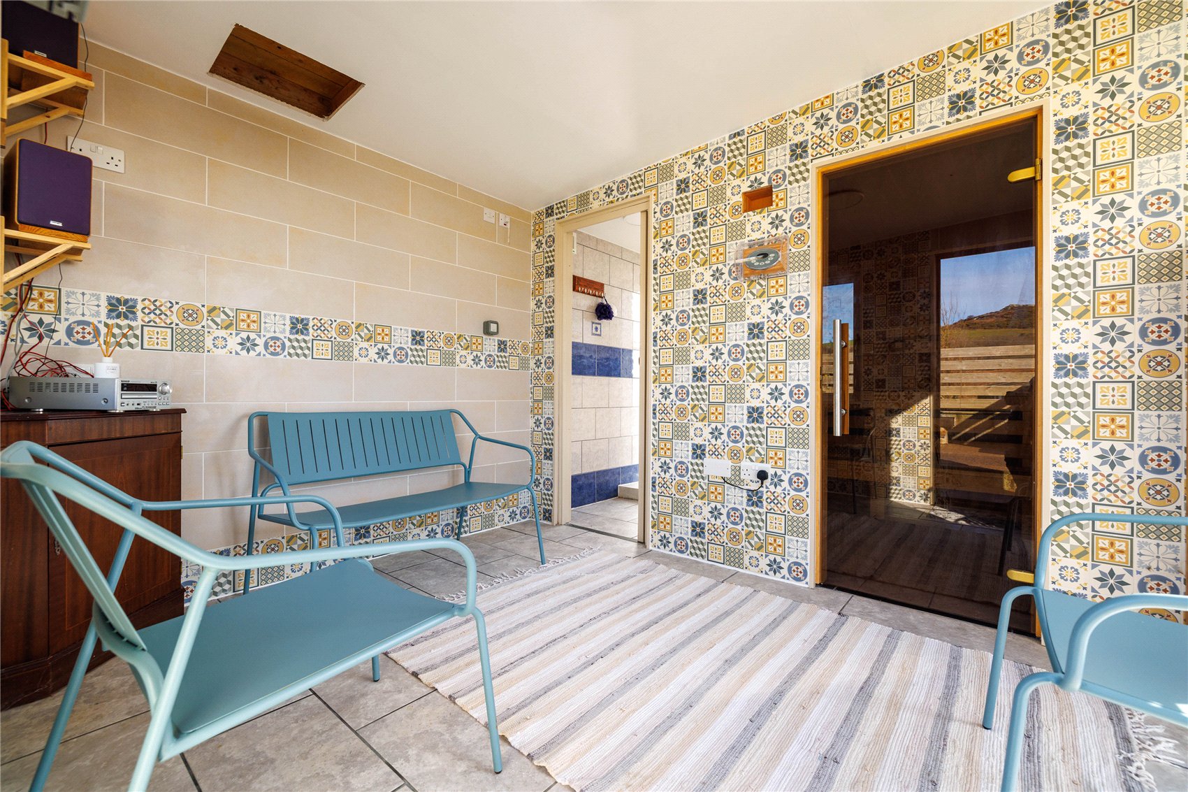 The house is set amid relatively low maintenance by design gardens which are mainly to lawn, a generous timber decking offers an excellent space for summer furniture, alfresco dining and entertaining. Millstone Cottage has a unique health offering with an outdoor cold water ice bucket, and outbuilding housing a relaxation room, sauna and shower facility.