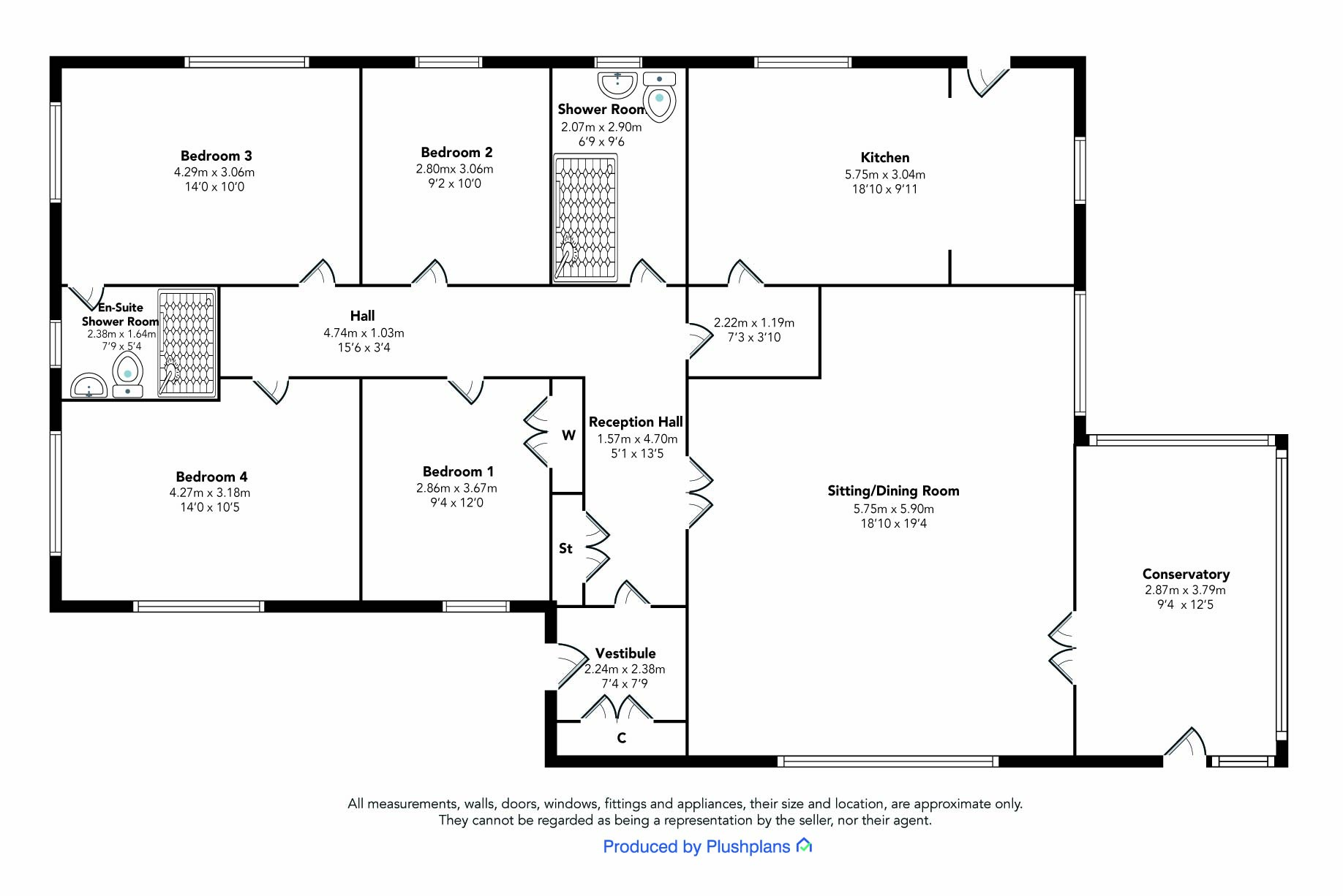Glazed outer door with side screens to entrance vestibule with fitted outer wear stores, multi glazed door and side screen to entrance reception hallway, golden maple hard wood flooring, twin leaf pine doors to general purpose store and electrical switchgear, sub floor access hatch, twin leaf multi glazed doors to open plan sitting and dining room, a dual aspect room with golden maple hardwood floor, inset downlighters, focal point pine fireplace with 5kW log burner inset on a black polished marble hearth and slips, twin leaf multi glass doors to glazed triple aspect conservatory, inset downlighters door to gardens, hardwood effect laminate floor with electric trace underfloor heating. From reception hall, door to refitted Howdens kitchen with base and wall units and marble fleck worktops, timber effect laminate flooring, dual aspect and door to side gardens. Refitted shower room (retained bath plumbing), opaque glass window to side, timber effect laminate floor, large slab marble effect splashback and glass shower screen, vanity set wash hand basin, WC, extractor fan. Multi glazed door to inner hallway with golden maple hardwood floor, access hatch and retractable ladder to floored and insulated attic space, bedroom 1 with side windows, twin leaf glass fronted wardrobes, bedroom 2 (currently set up as home office) with side window, bedroom 3 (guest bedroom) a dual aspect room with en suite shower room completed with wet wall splashback, opaque glazed window to rear, hardwood floor, vanity set wash hand basin and stores, WC, white tile splashback, bedroom 4 a further dual aspect room with fitted bedroom furniture.