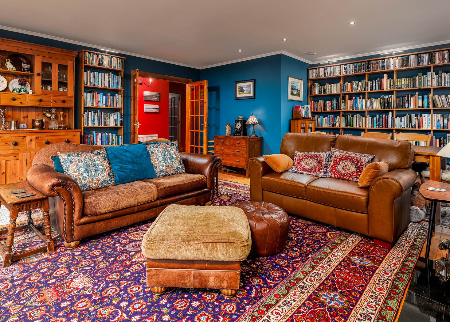 The house is of painted harled exterior with blue painted cedar relief; the house is over a facing brick base course with additional facing brick relief at window cills and the whole is under a new tiled roof. Internally the house is well finished with all rooms on a single, light and bright and easily managed level.