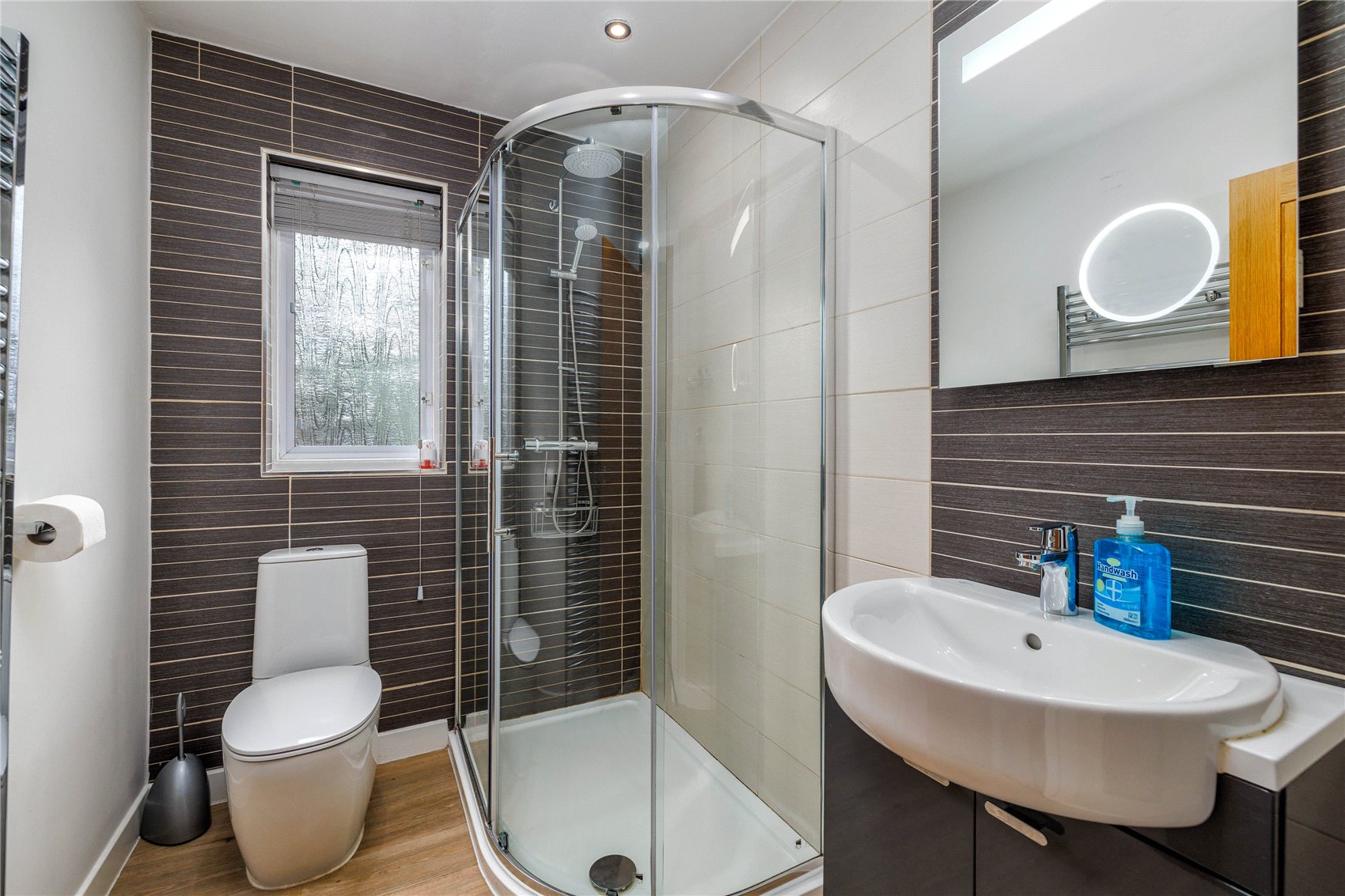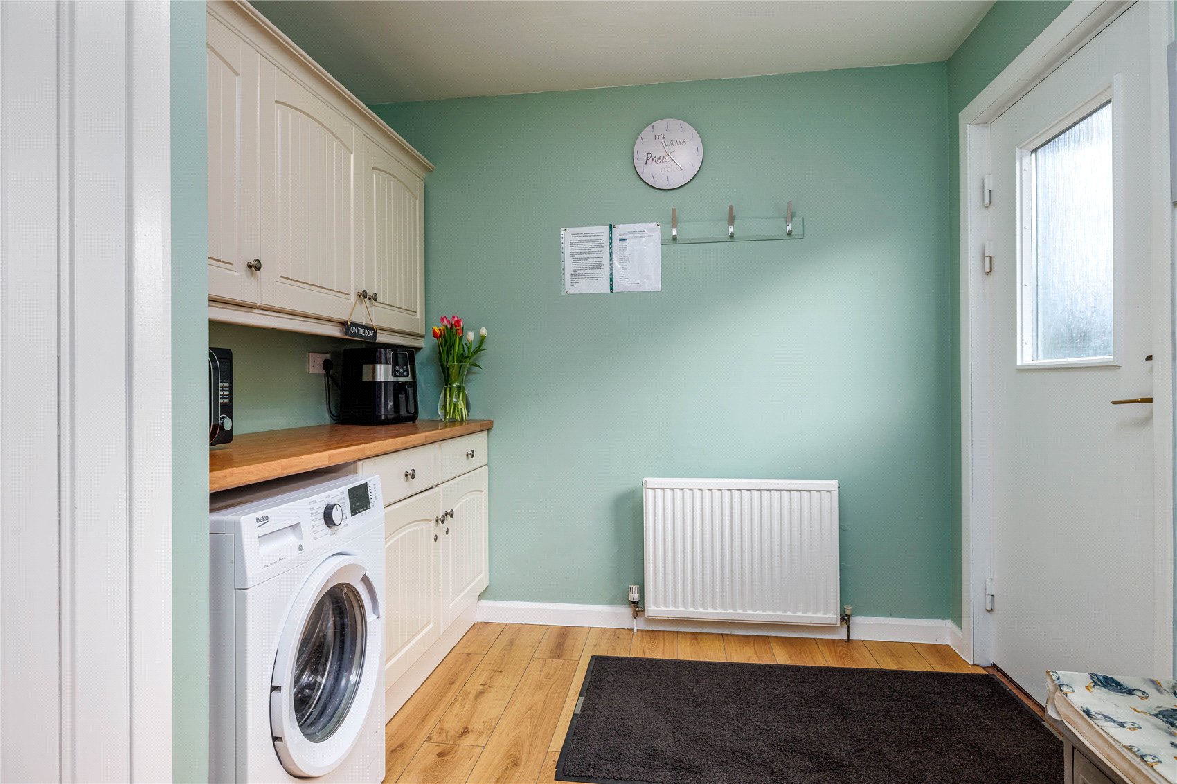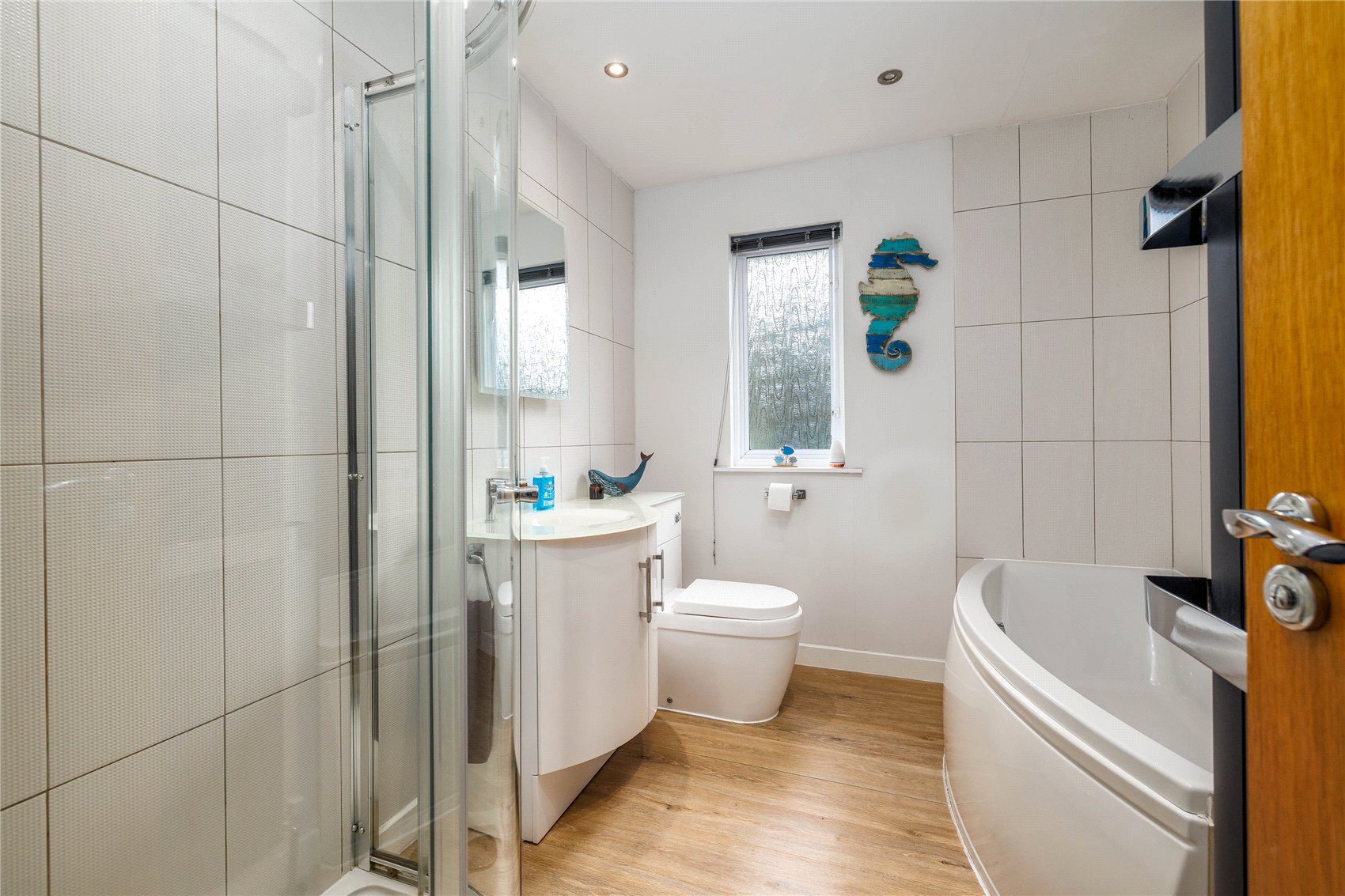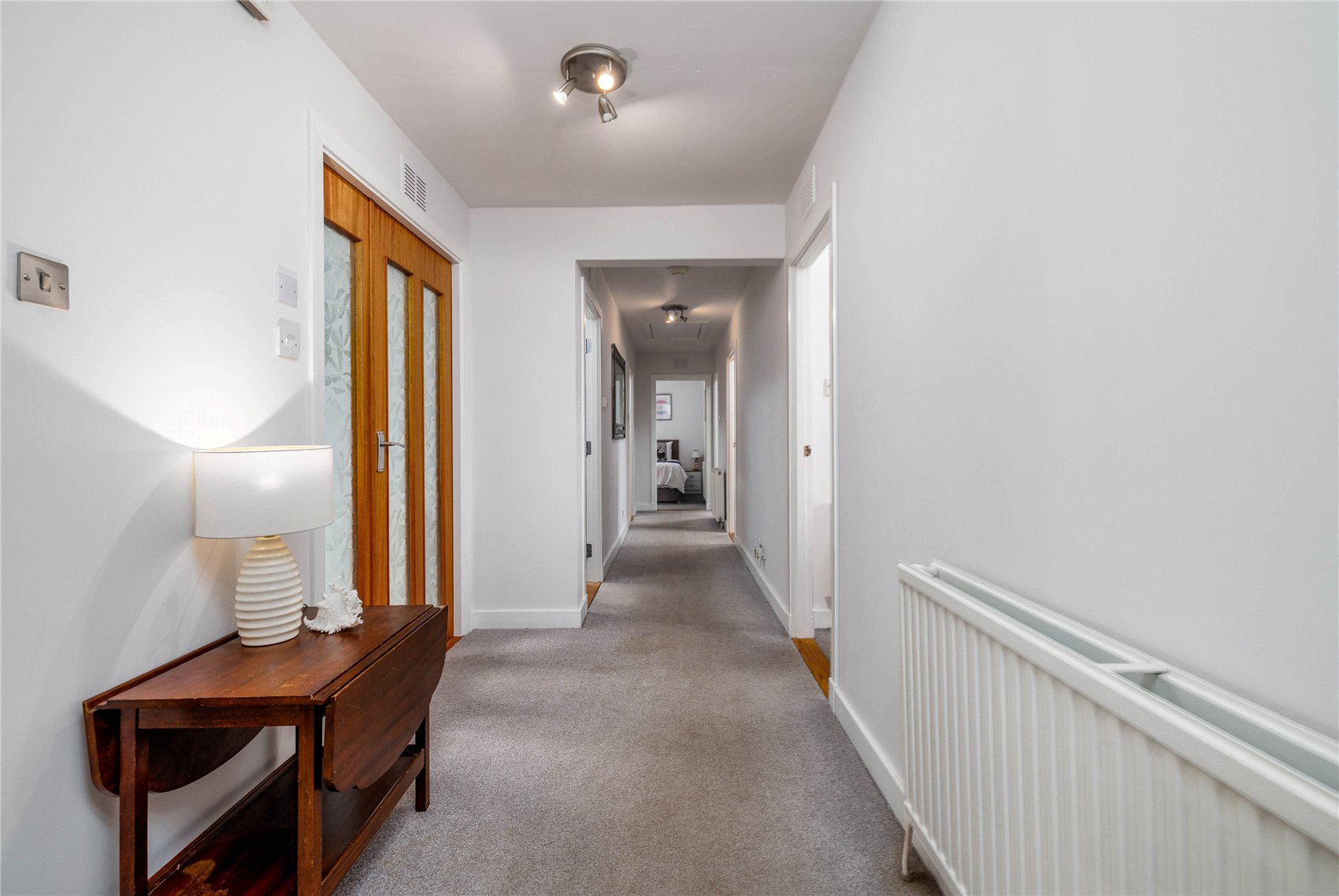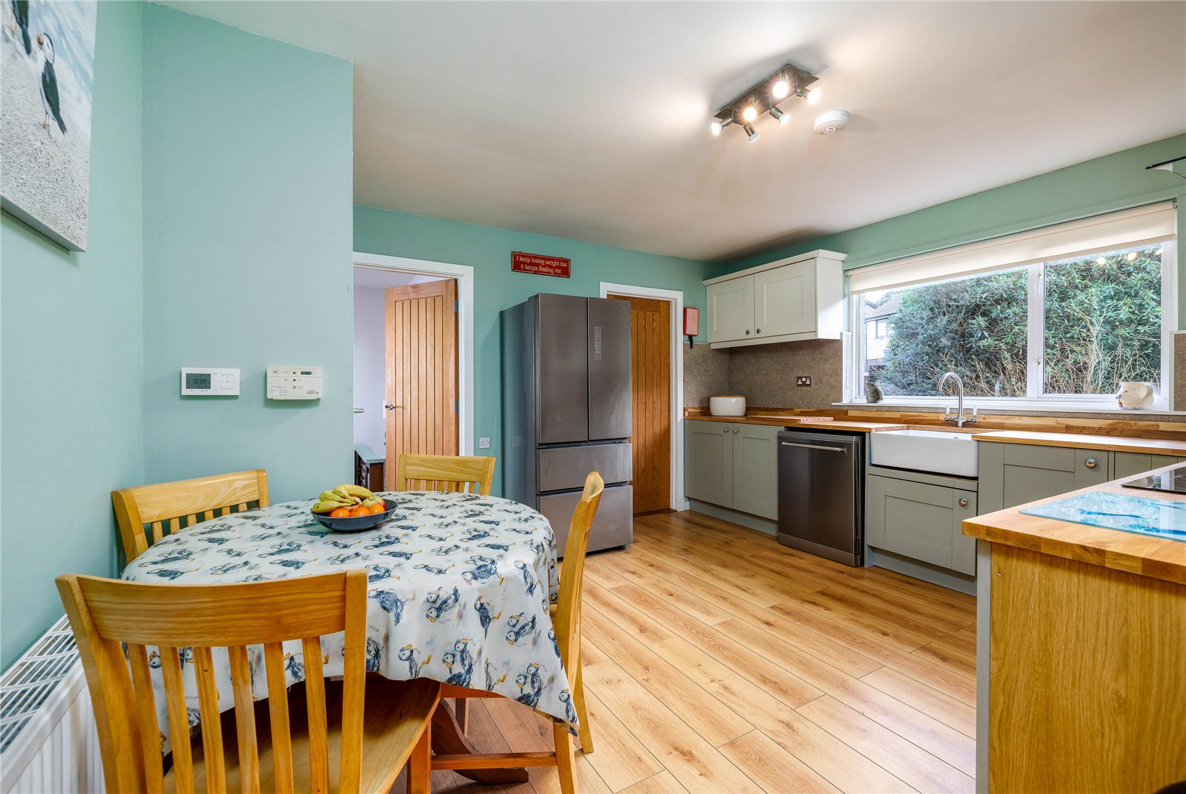 Twin leaf glazed outer doors to the entrance vestibule with outer wear coat hooks, opaque glazed door and side screens to the reception hall with attic space access via retractable ladder, shower room and wc with opaque window, stainless steel upright radiator/towel rail, inset downlights, and vanity set wash hand basin, expansive sitting room with shallow bay window formation with spectacular waterscape aspects, patio doors with access to side terrace, warming log burner inset to timber mantle and on a slate hearth, open arch to formal dining room with patio doors leading to the terrace, refitted kitchen (December 2025) with matching base and wall units, Belfast sink, butchers block work tops, induction hob, oven and overhead canopy extractor,glass splashback, granite effect wall boards, hardwood effect laminate flooring, store with domestic hot water tank. Utility room with door to gardens and driveway, hardwood effect laminate flooring and lockable general-purpose store. From the reception hallway, bedroom 1, bedroom 2, bedroom 3 with mirror fronted fitted wardrobes, bedroom 4 with mirror fronted fitted wardrobes, refitted bath and shower room with opaque window, corner shower with glass enclosure, vanity set wash hand basin and contemporary styled upright radiator/towel rail.