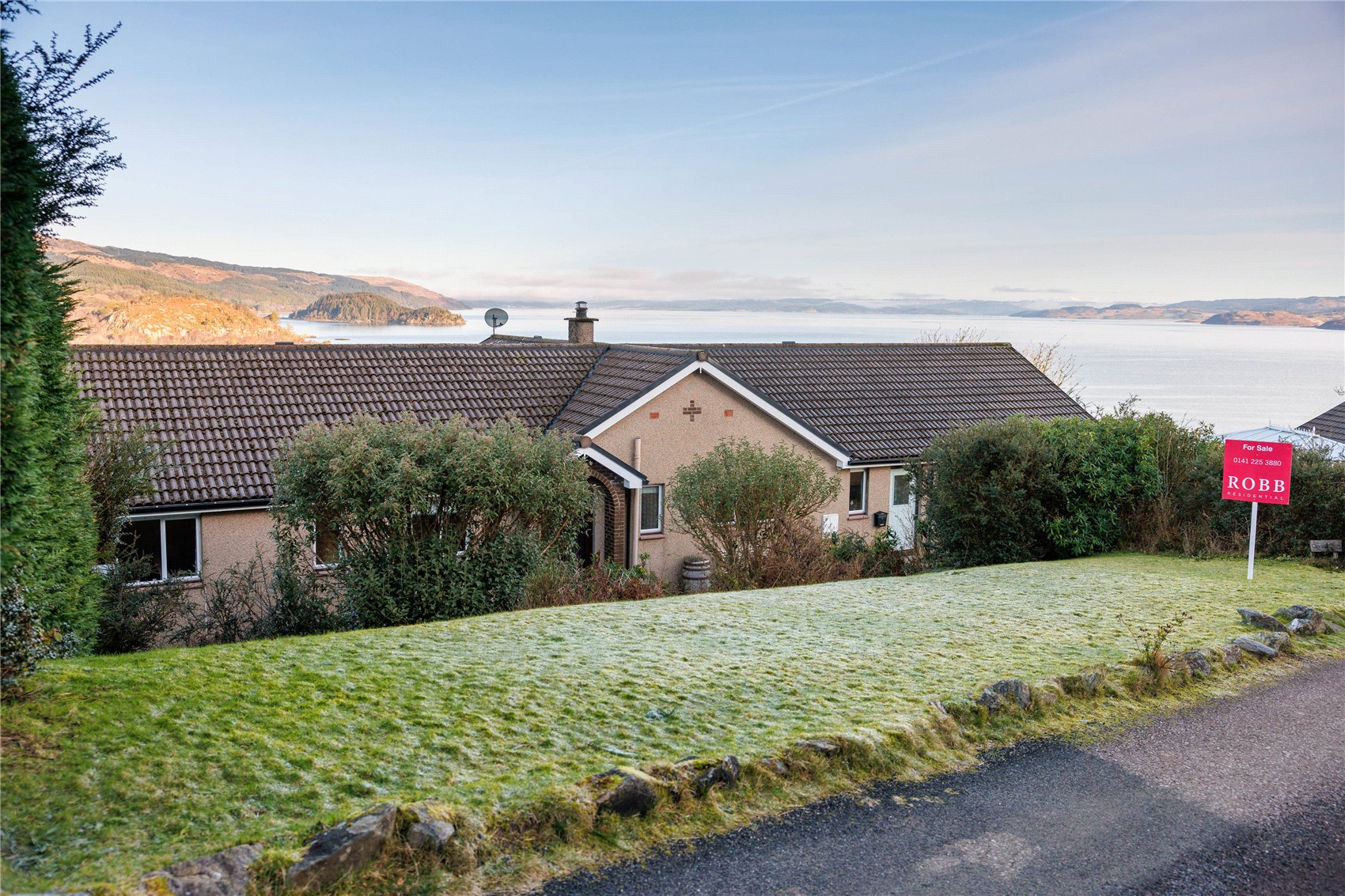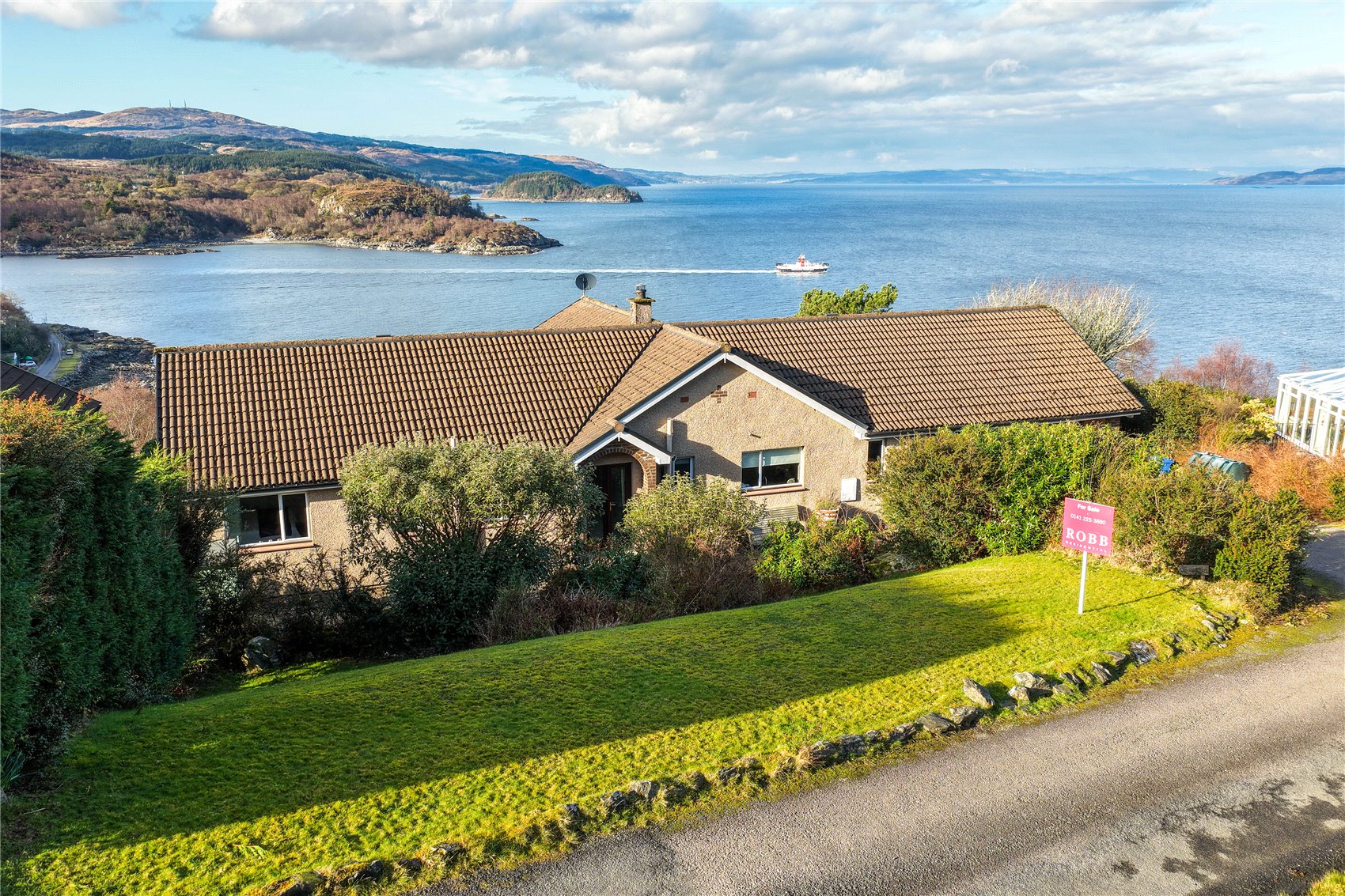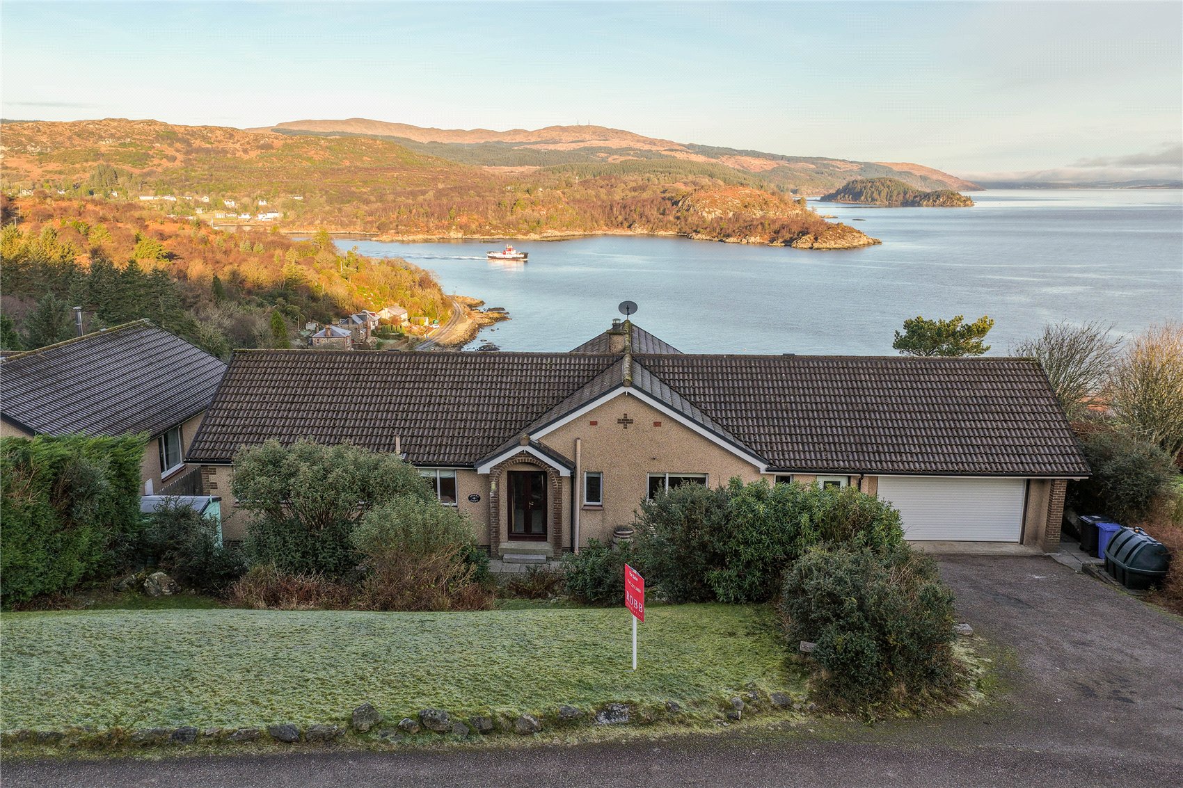 A generously proportioned detached bungalow with spectacular panoramic views across the entrance to Tarbert harbour and north over Loch Fyne.