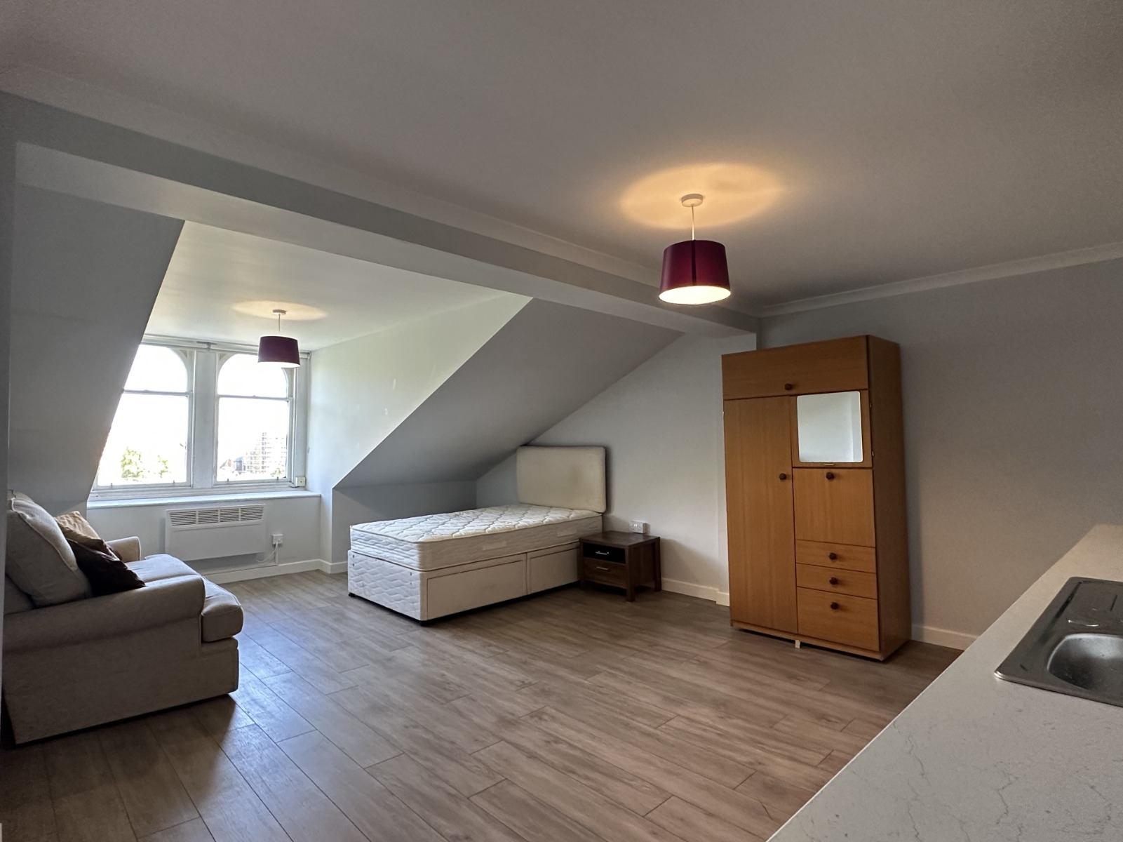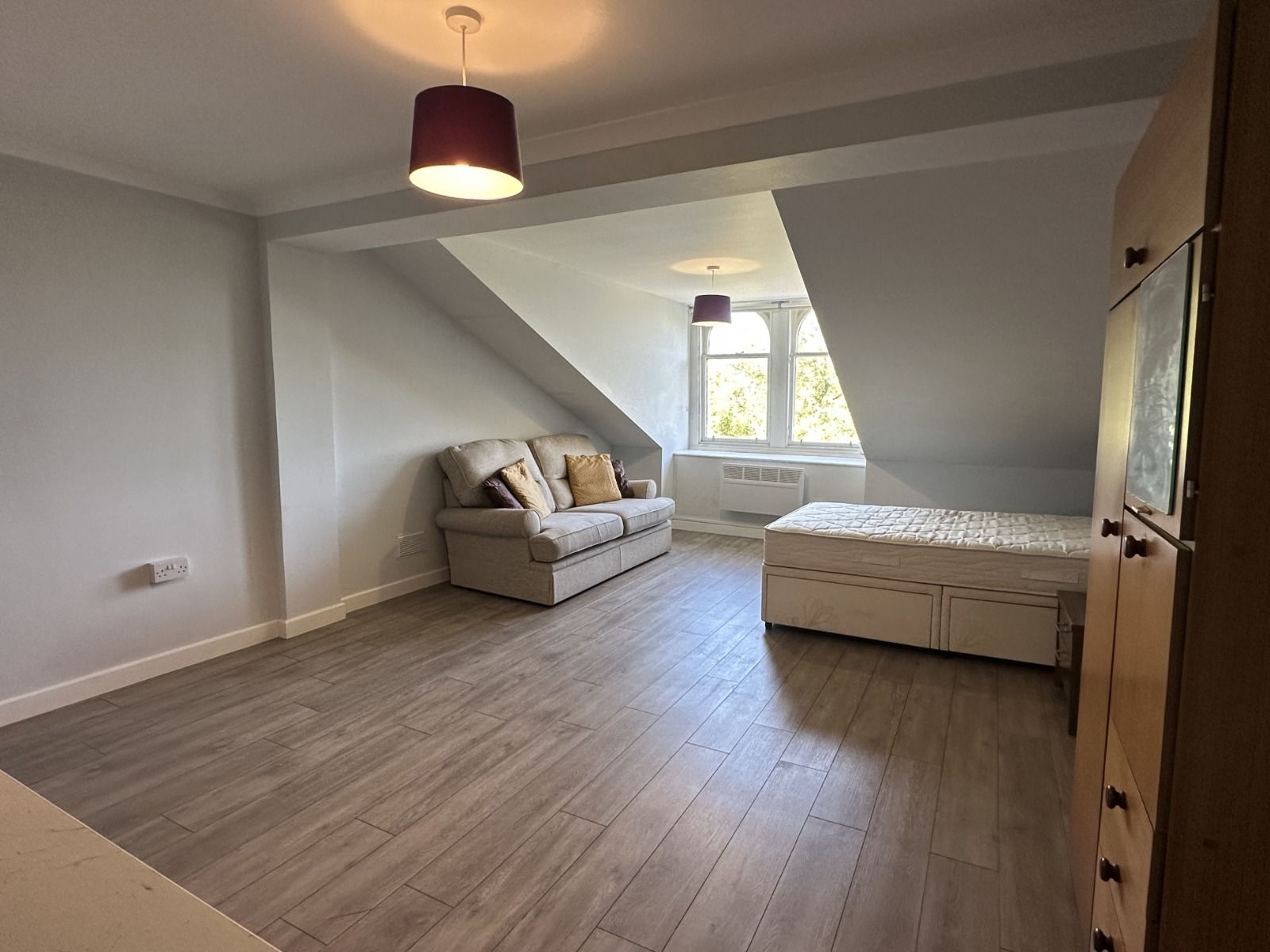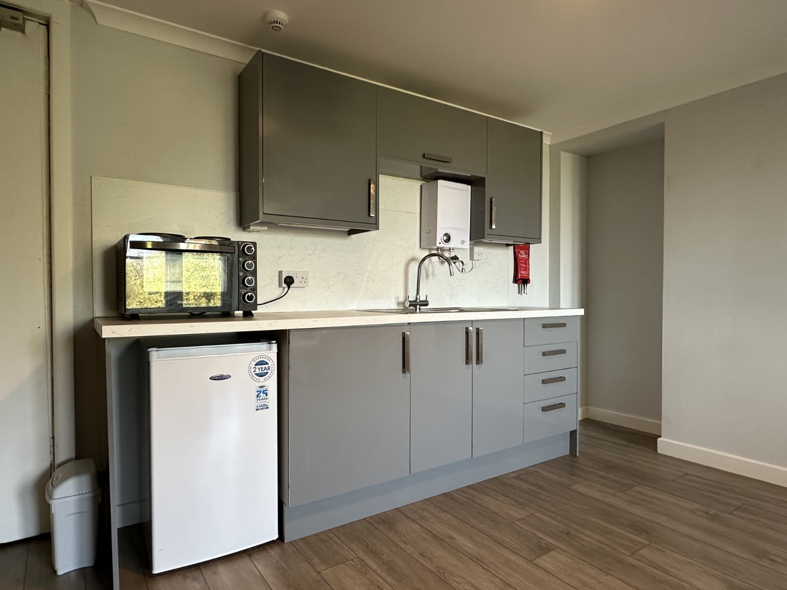 The style is self-contained entirely with a sitting/bedroom, and small kitchen area with fridge freezer and microwave. The bathroom is located with the entire property.