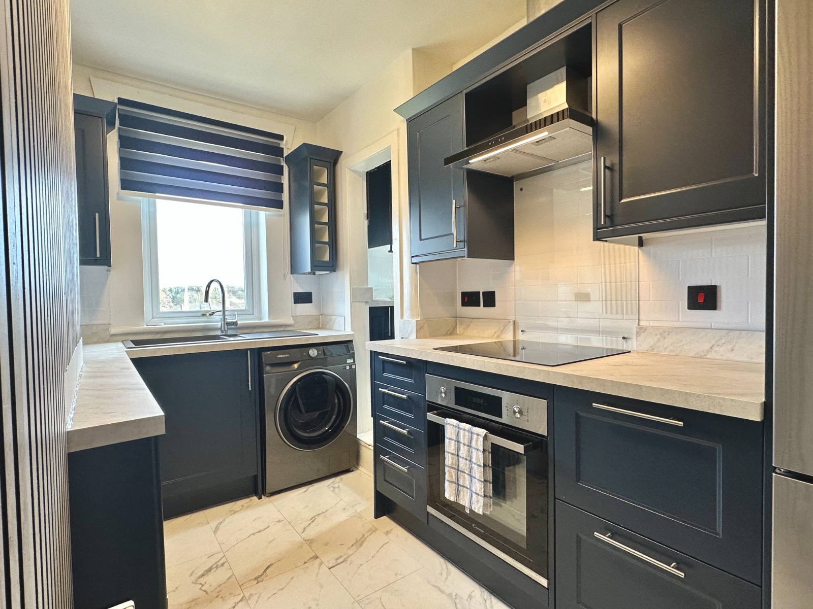 At the heart of the home lies a stunning, contemporary kitchen, complete with sleek midnight blue base and wall units, integrated oven, hob and hood, washing machine, and a large fridge freezer. Just off the kitchen, a cleverly designed utility room provides additional storage and practicality, finished to the same high standard.