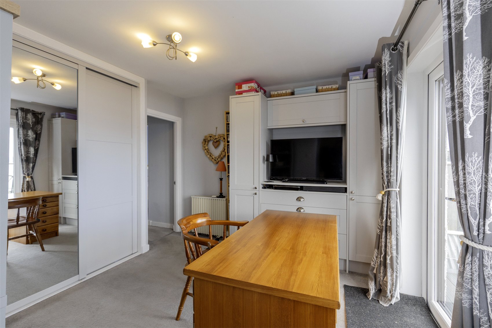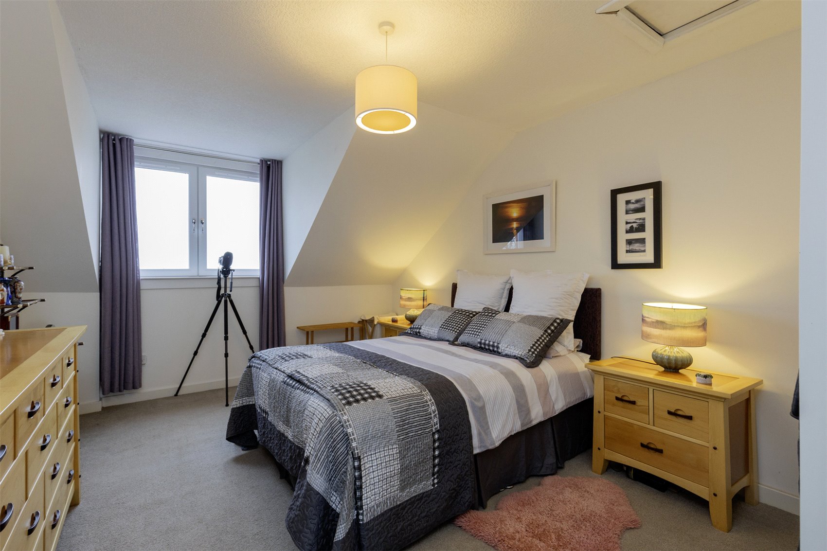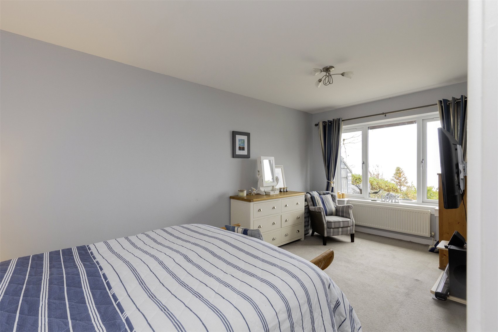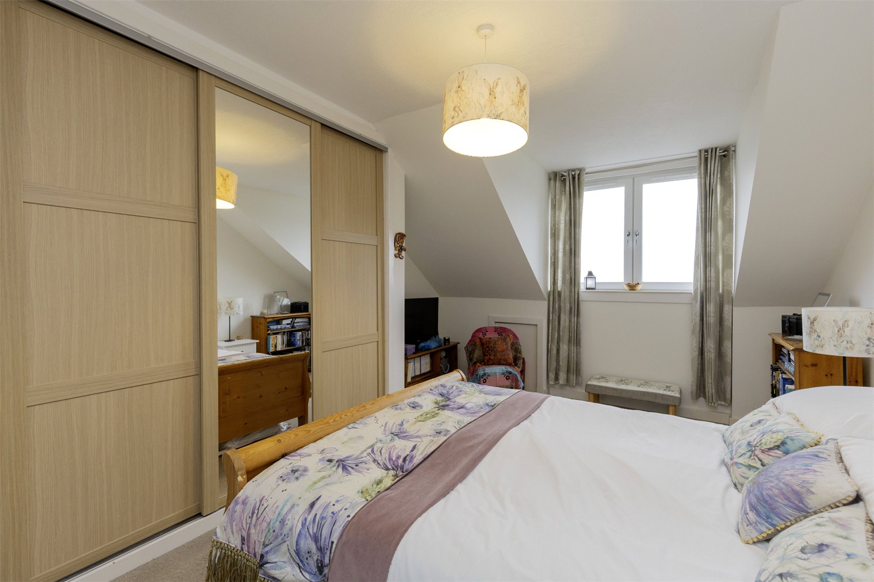 Via carpeted staircase to first floor, velux window, access to property eaves, bedroom 2 with part mirrored fitted wardrobes, cupboard housing the hot water tank and air source switch gear, windows to waterscape views, bedroom 3 with fitted cupboard, window to rear garden and waterscape views.
