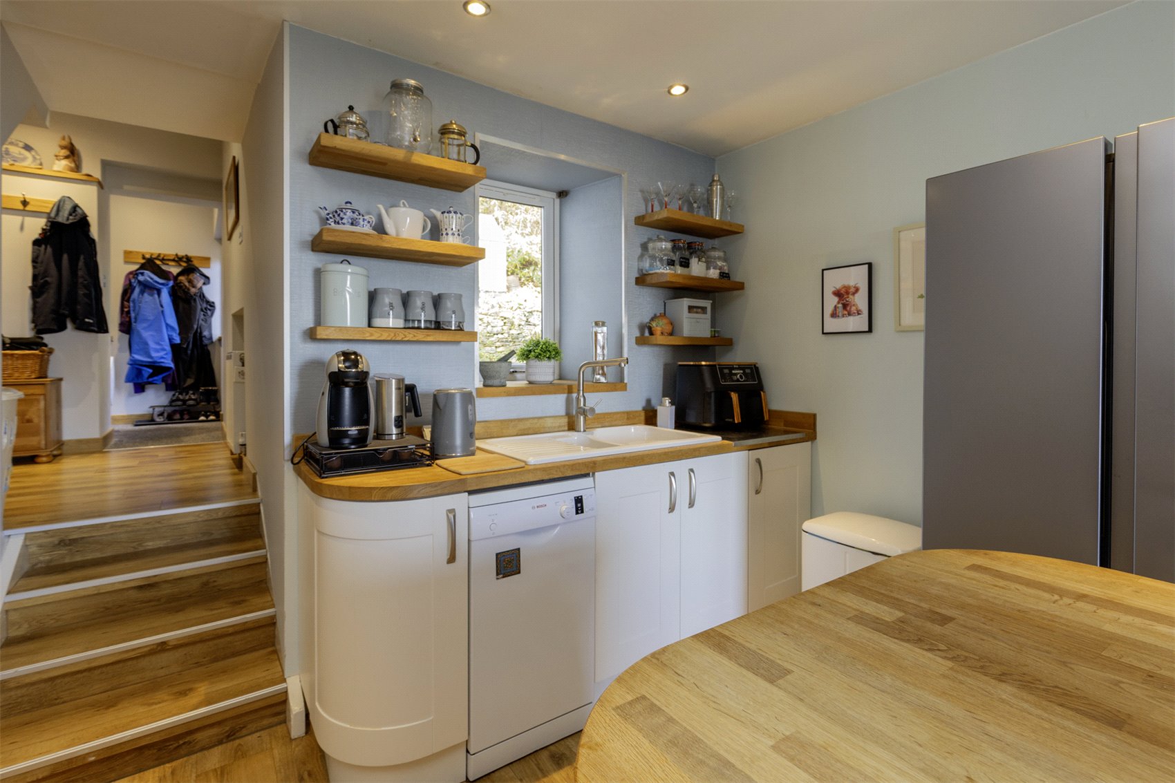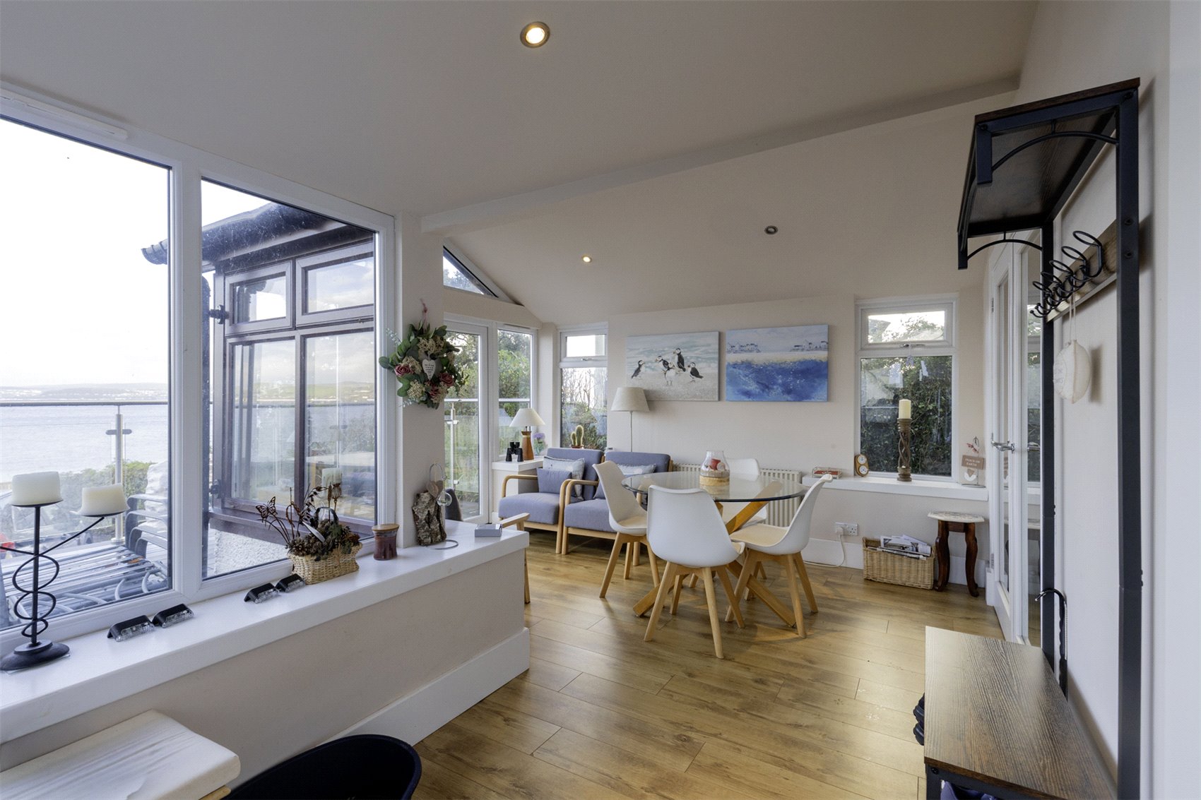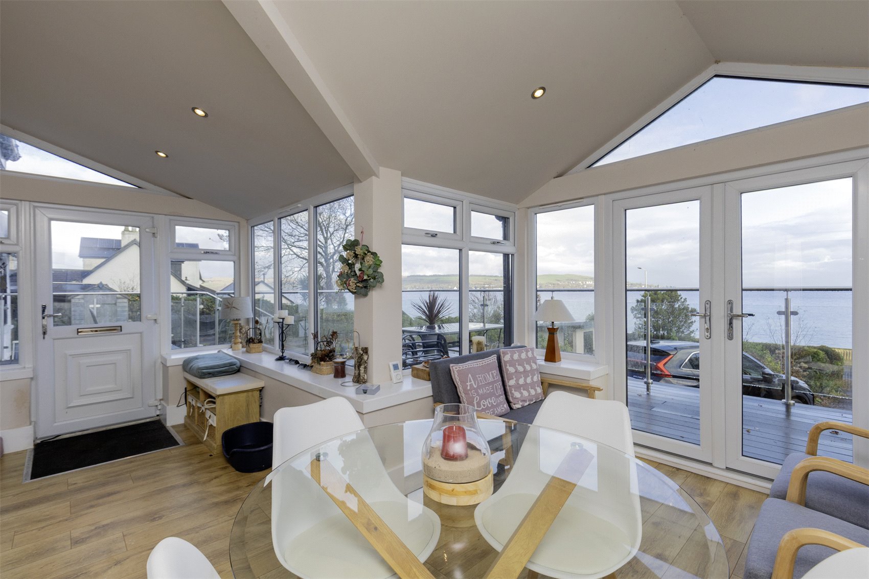 Outer front door to welcoming sunroom set up as informal sitting cum dining with uninterrupted waterscape views, cloaks cupboard, twin leaf glass insert doors to formal sitting room with warming multifuel burner, vertical wall radiators, kitchen with window to front and rear gardens and waterscape views, central island with informal breakfasting and dining bar, dining room with part mirrored fitted wardrobes, twin leaf doors to gardens, family shower room, bedroom 1 with window to front gardens and waterscape views, utility with velux windows, door to gardens, family shower room with heated towel rail, hall store cupboard.