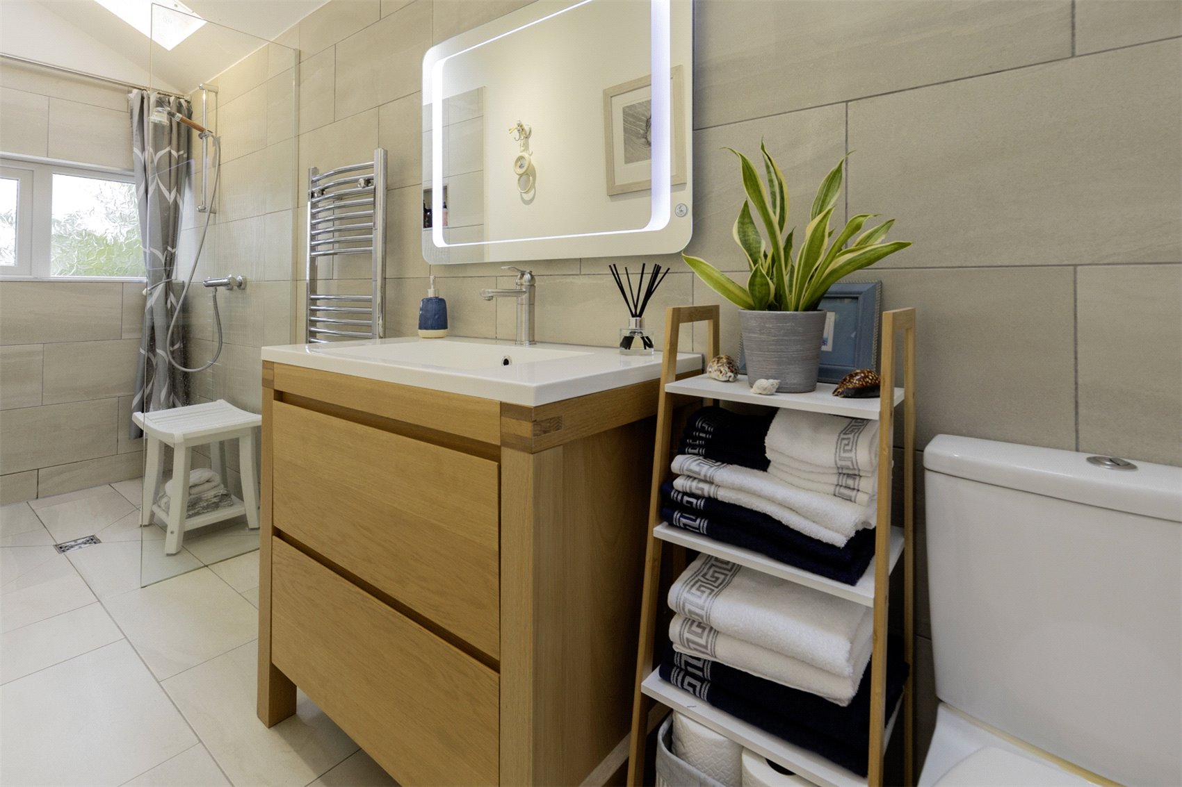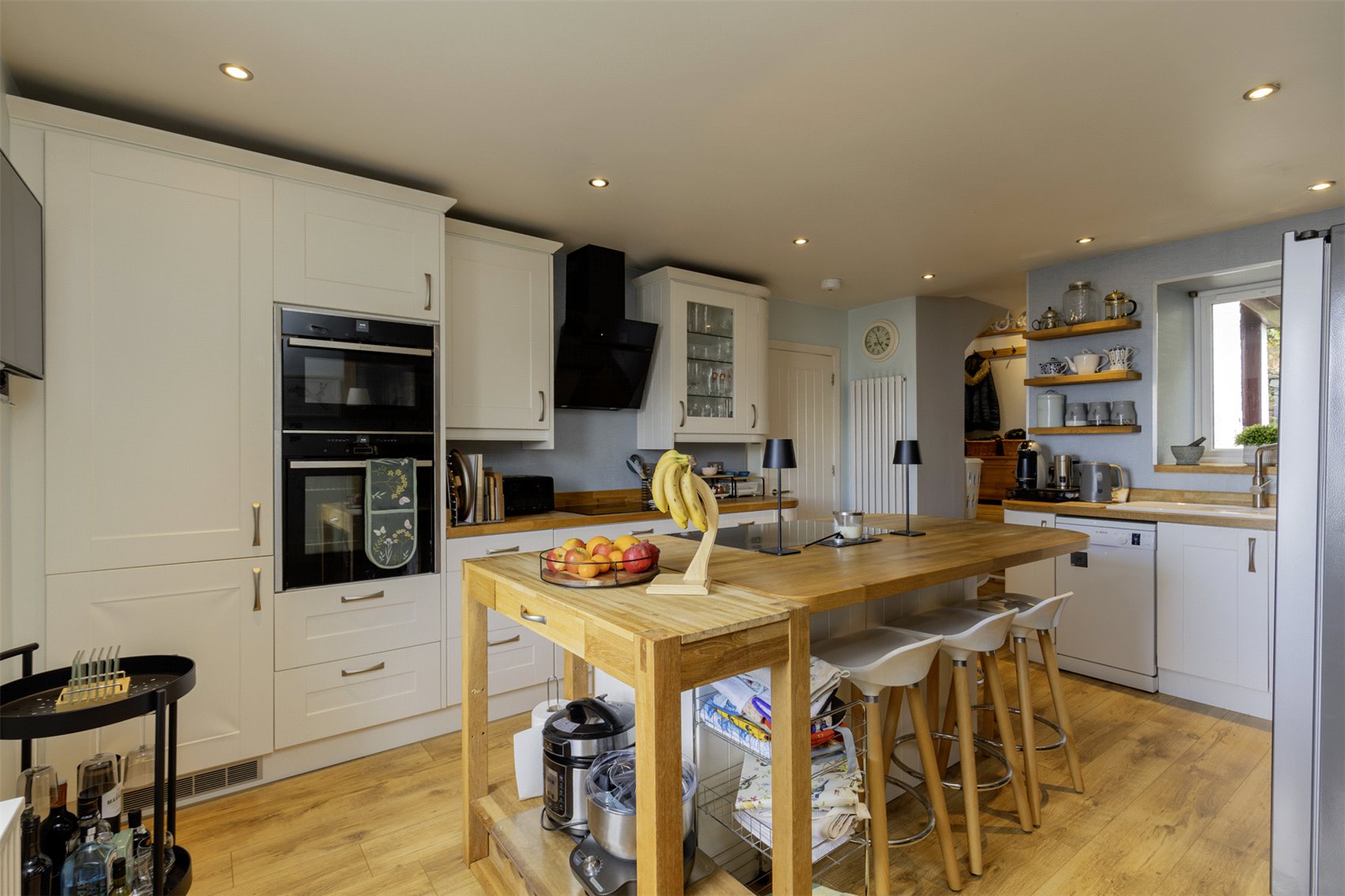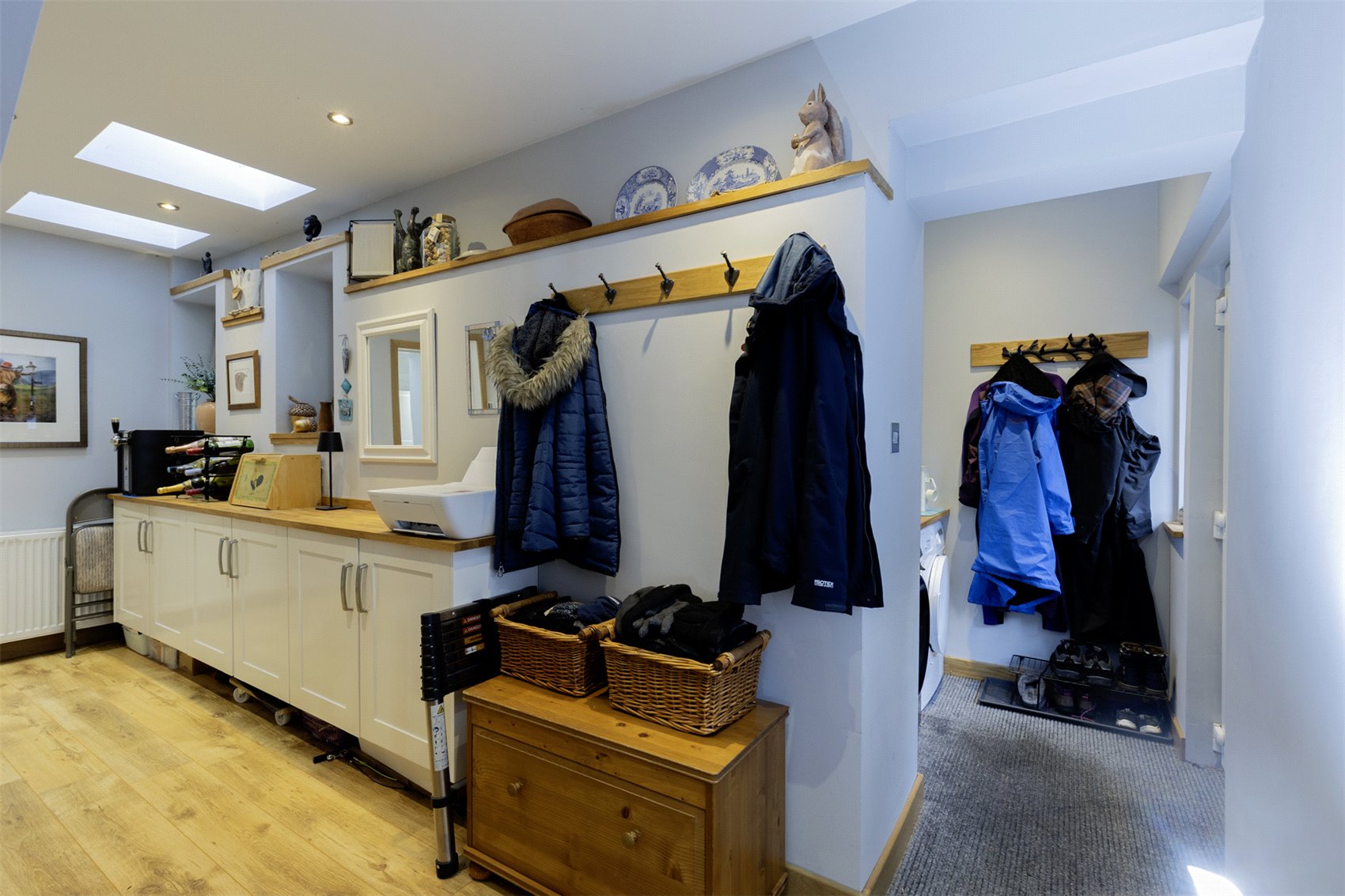 Outer front door to welcoming sunroom set up as informal sitting cum dining with uninterrupted waterscape views, cloaks cupboard, twin leaf glass insert doors to formal sitting room with warming multifuel burner, vertical wall radiators, kitchen with window to front and rear gardens and waterscape views, central island with informal breakfasting and dining bar, dining room with part mirrored fitted wardrobes, twin leaf doors to gardens, family shower room, bedroom 1 with window to front gardens and waterscape views, utility with velux windows, door to gardens, family shower room with heated towel rail, hall store cupboard.