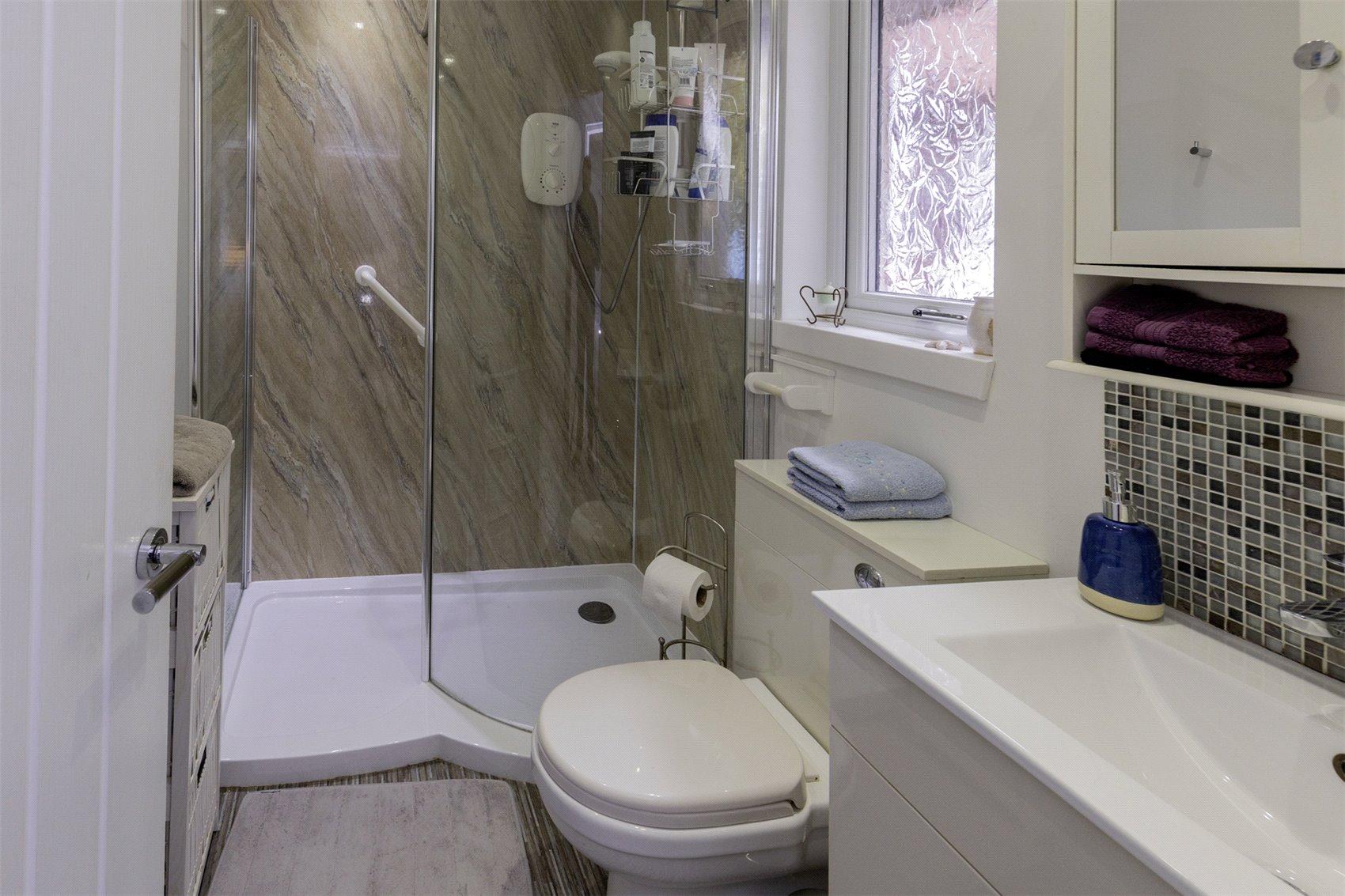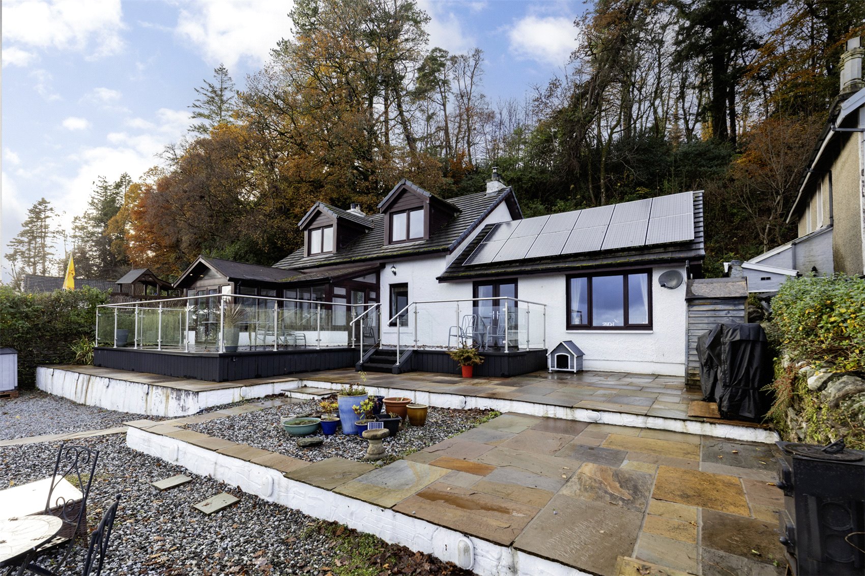 Lochiel Cottage is completed in white painted render, all neatly presented under a dark grey tiled roof. A good-sized raised composite decking area is located at the front of the property and from where there are breath-taking views across the Firth of Clyde and the entrance to Loch Long.