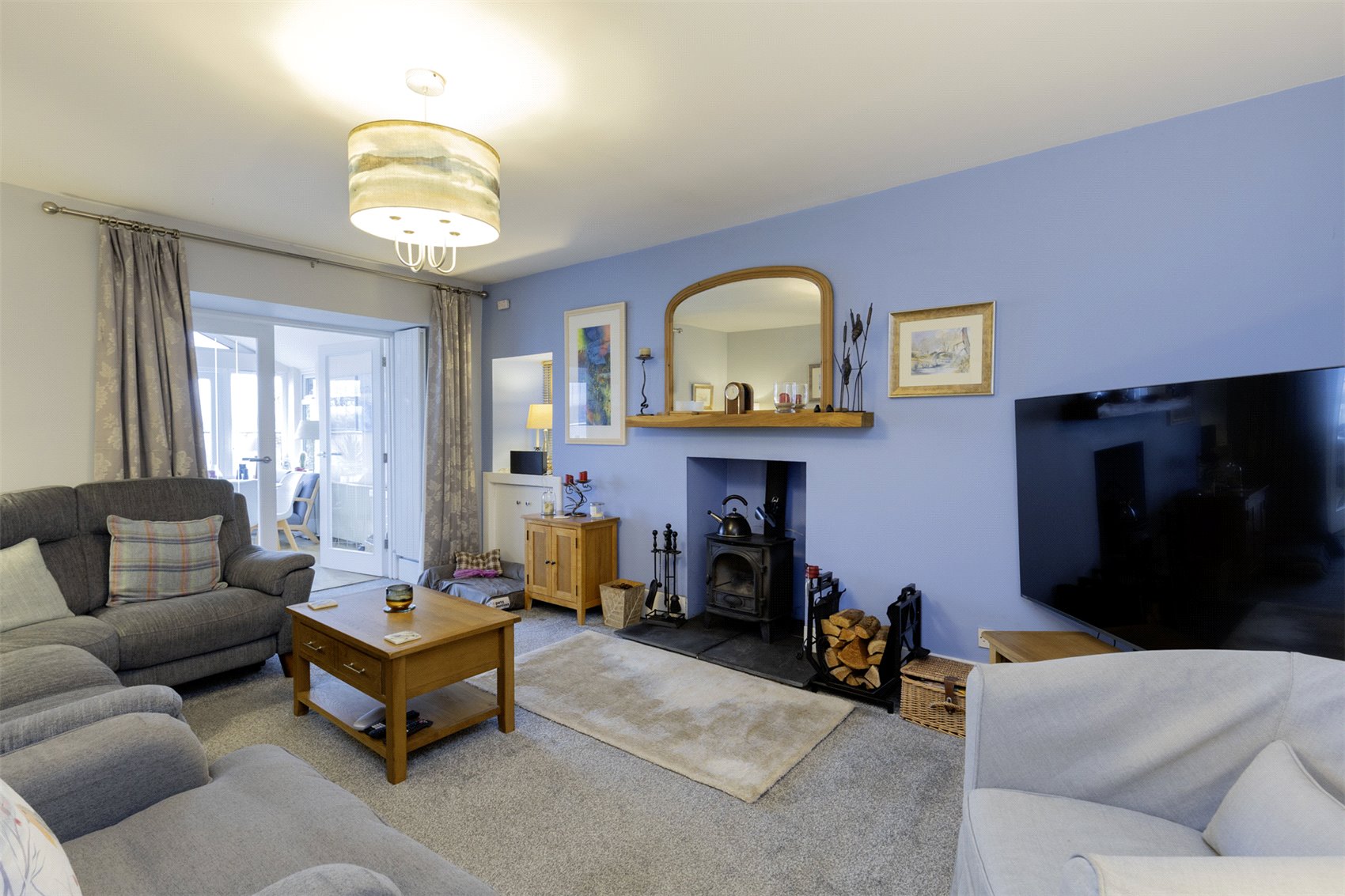 Mains water supply, mains drainage, air source heat pump supported by a warming multifuel burning stove, double glazed. There are 12 solar panels on the roof.