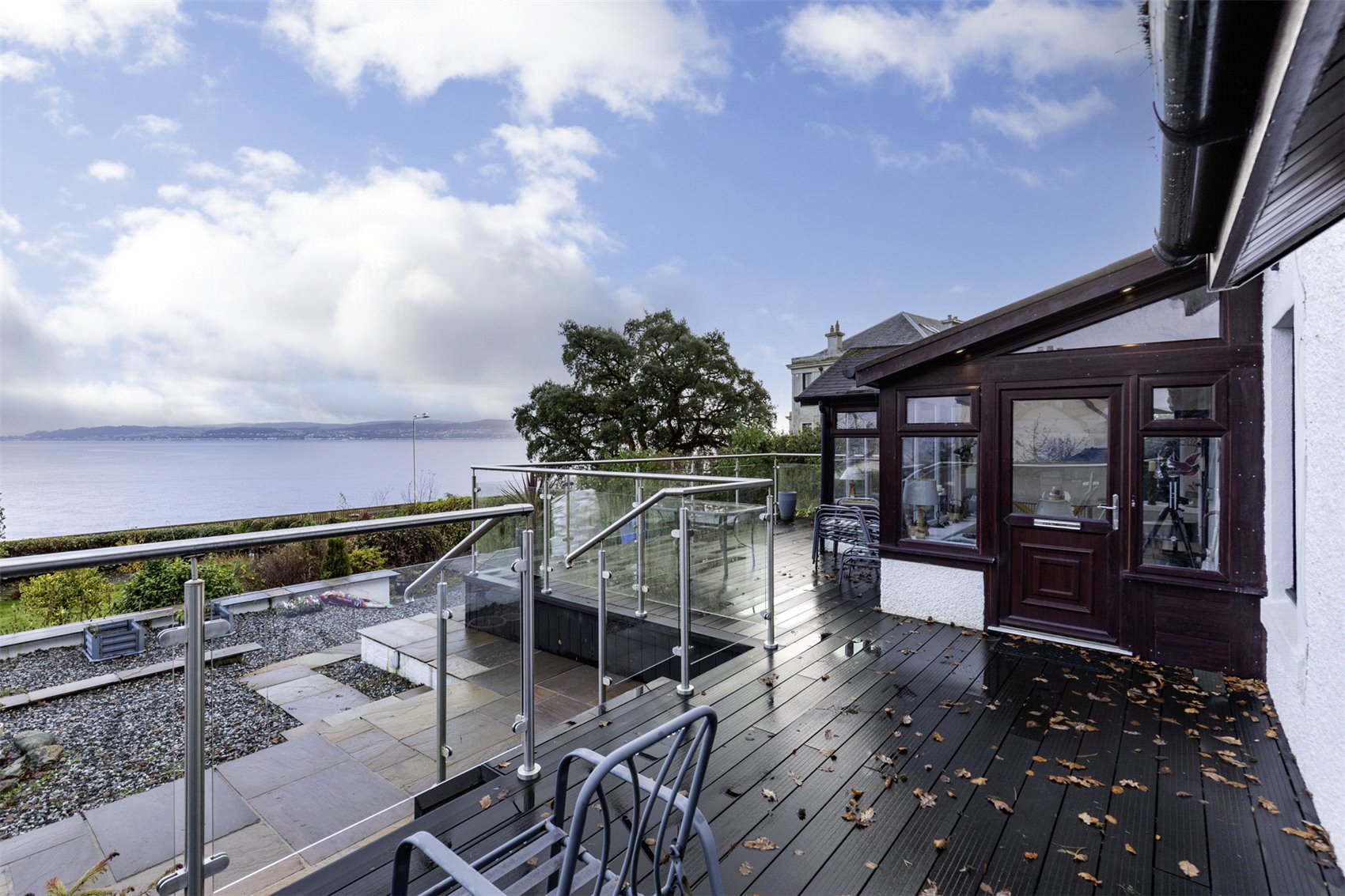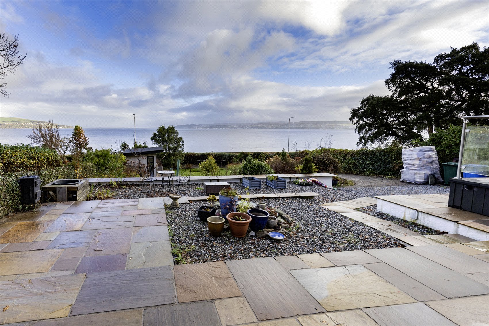 Via twin leaf gates to private tarmac driveway offering ample vehicular hard standing and parking, the driveway is flanked with gravel and planted beds to one side and bounded by a stone wall to the other. The front gardens are laid to a combination of lawn and gravel beds, with colourful flower beds and bushes. A generous patio and composite timber decking at the front of the property offers an excellent space for alfresco sitting, dining and entertaining guests and from where there are sublime views towards the Firth of Clyde. A timber personal gate at the side of the property provides access to rear gardens which are low maintenance by design and laid to a paved patio area, stone steps set into a stone wall provide access to an upper level, all of which is overgrown with mature beds and bushes.