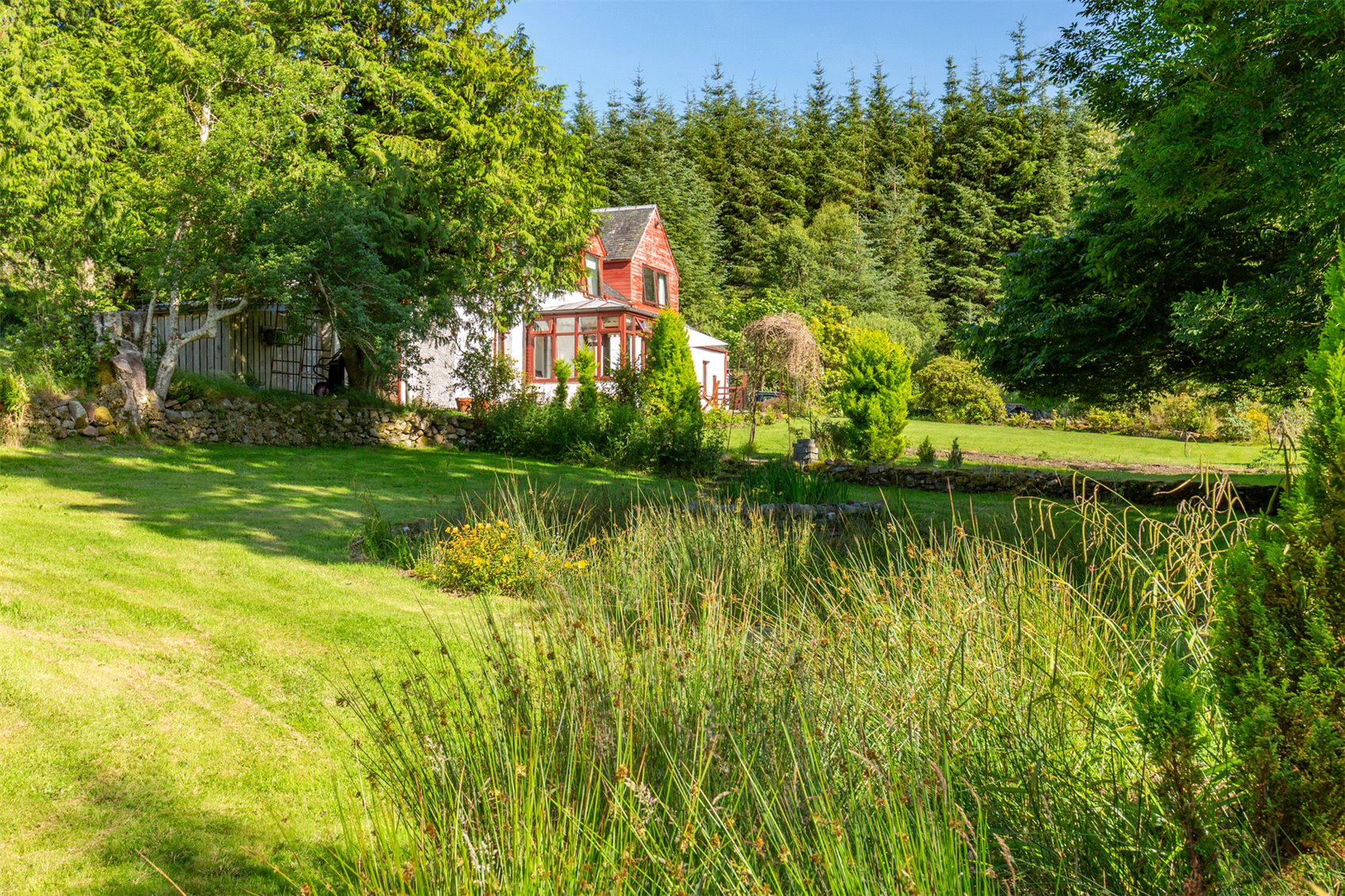 Forest track to front apron of red chips and block paving with vehicle turning and hard standing. Dry stone retaining wall, supporting country lawn with alpine borders. Block paved and concrete terrace at the front of the house, lawn with pond and terrace, Ancient sycamore and ash trees, some evergreens, rhododendrons and Pienis. A stream is at the eastern side, flagged caravan/boat hard standing, concrete pathway at rear with further dry stone wall with raised rear lawn with drying green and evergreen trees.
