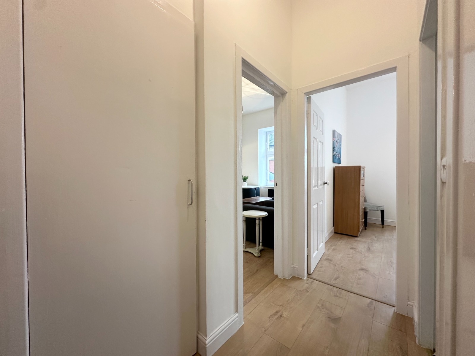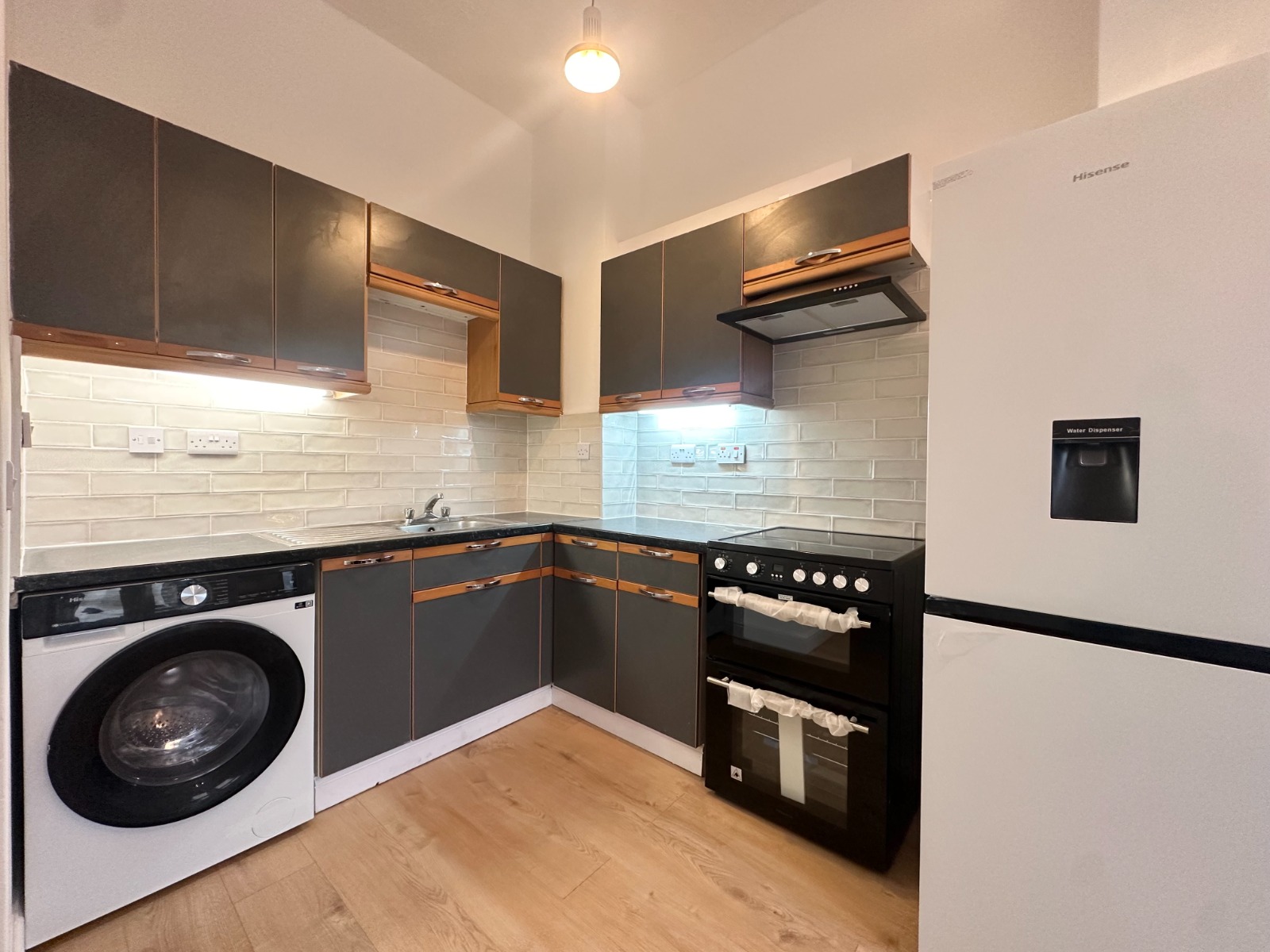 Upon entering this lovely flat, the welcoming hallway immediately draws you in and makes you feel right at home. But it's the fabulous lounge/kitchen with its bright, airy windows, stunning newly fitted kitchen with mood lighting, white goods included and modern heating that sets this home apart. The open kitchen allows for conversation to flow as you cook up a storm and is furnished to the highest standard with oven, hob & hood, fridge/freezer & washing machine.
