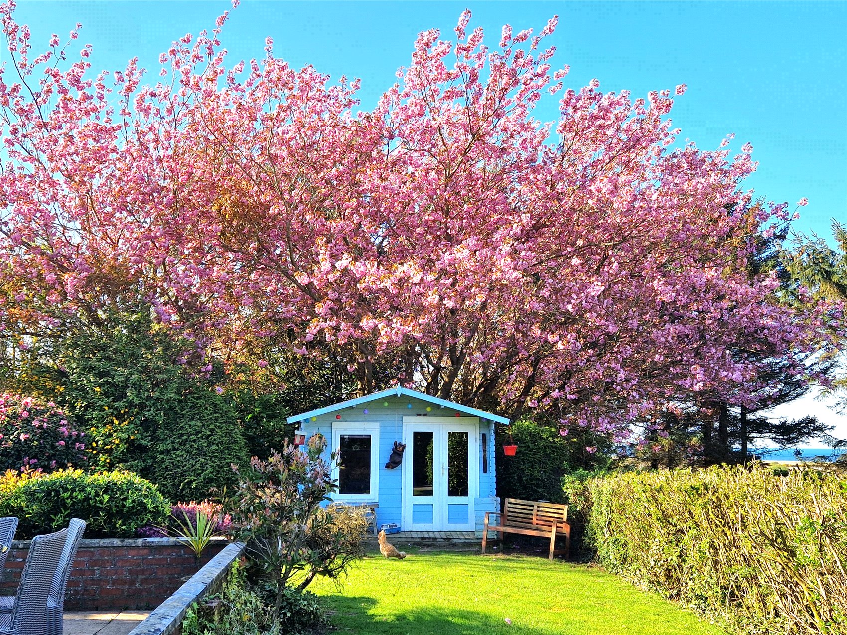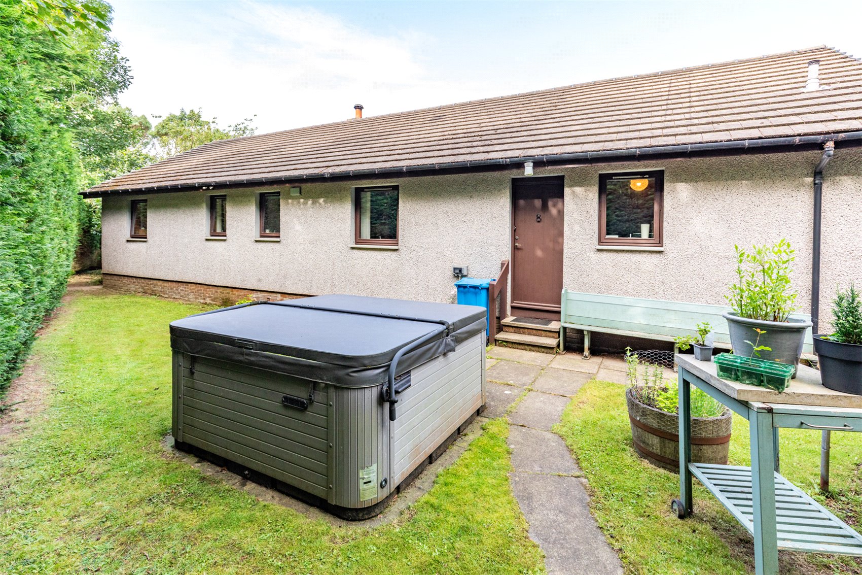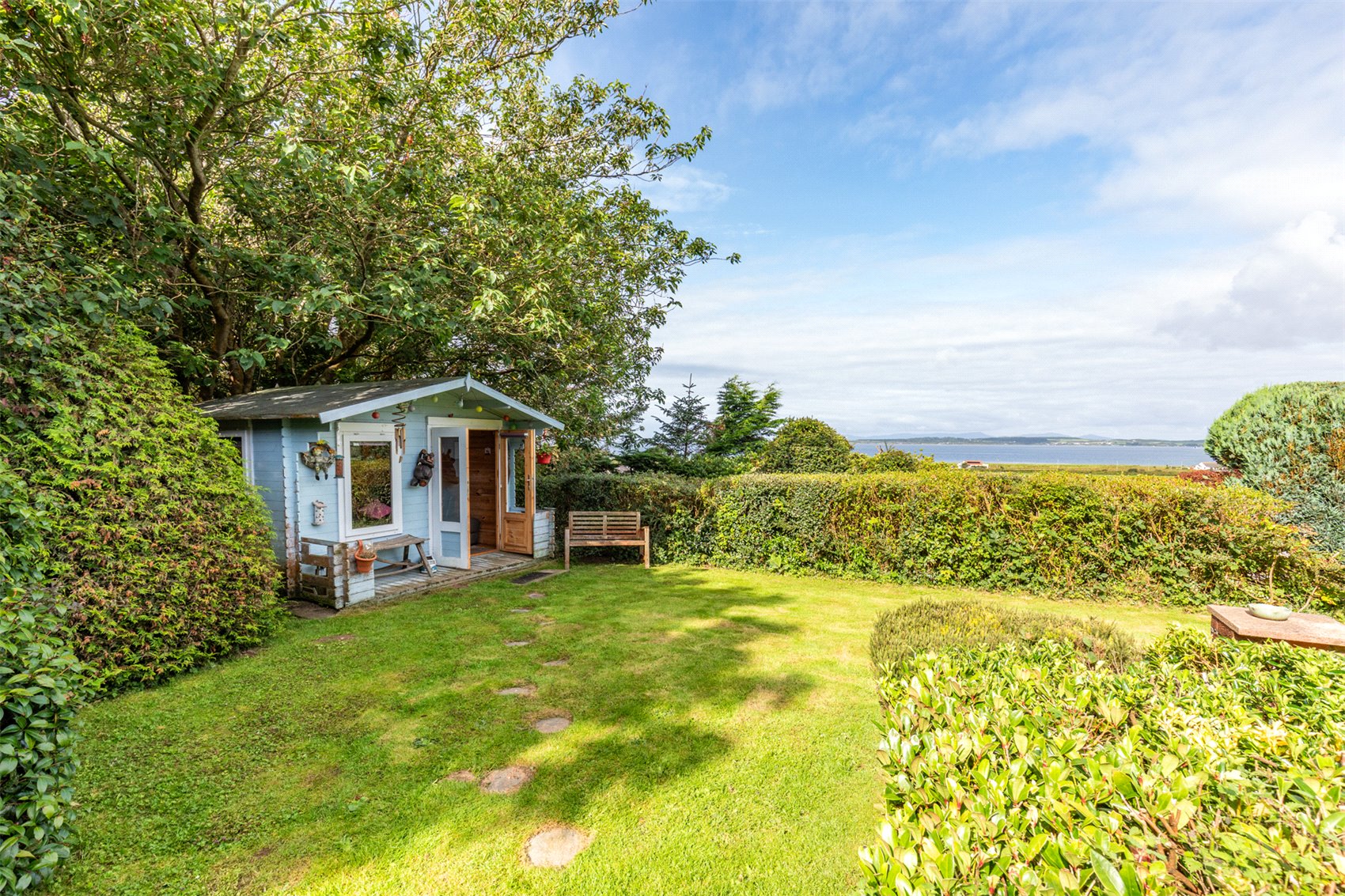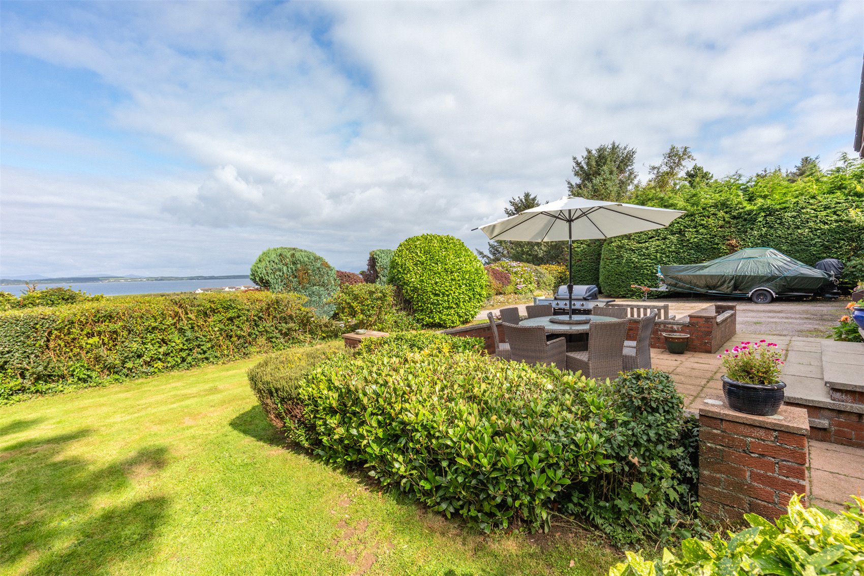 Stone bell mouth entry to driveway, which is fringed with evergreen trees, a broad eucalyptus canopy all underplanted with berberis and assorted bush plants. A drystone retaining wall is overplanted with many shrubs and bushes and the drive terminates at the house where there is a generous vehicle turning and hardstanding apron. Directly to the front of the house is a level mature lawn as well as a patio bounded by an ornamental facing brick finished dwarf wall. Flagstone pathways are around the house and lead to rear gardens to a further patio, level lawn bounded by tall evergreens providing shelter and amenity.