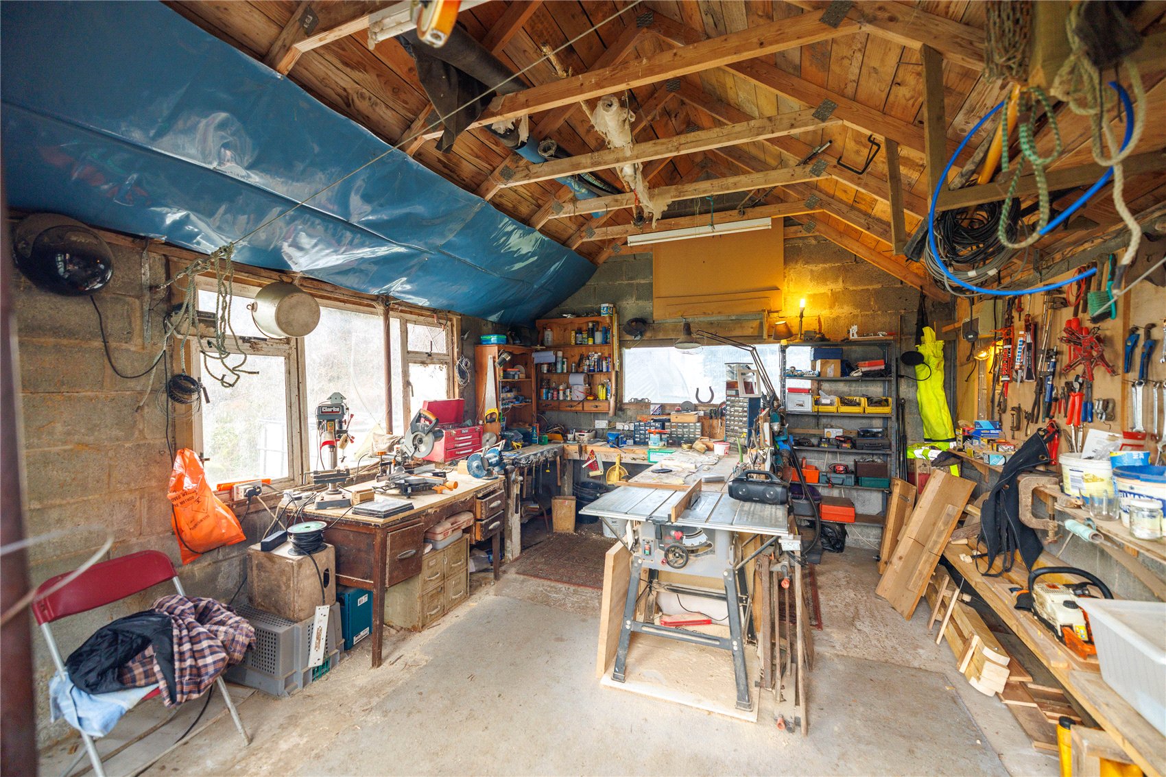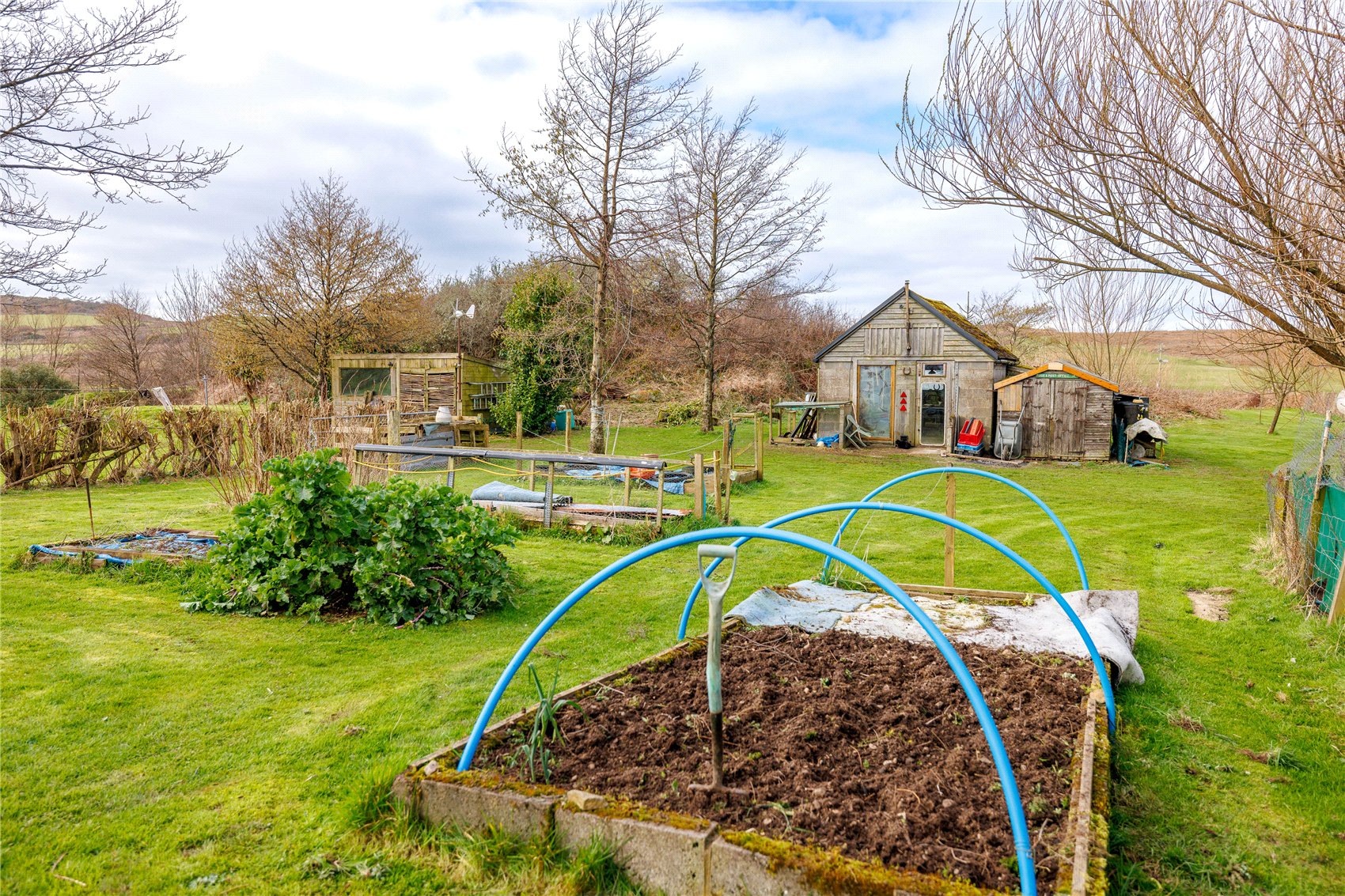 Detached timber/concrete brick-built workshop/store presented under a tiled roof. General purpose timber garden shed, detached timber log store, poultry enclosure. 6 bay poly tunnel with a solar powered automatic watering system. A 4,500L naturally harvested rainwater tank supplies the outbuildings and the gardens with water.