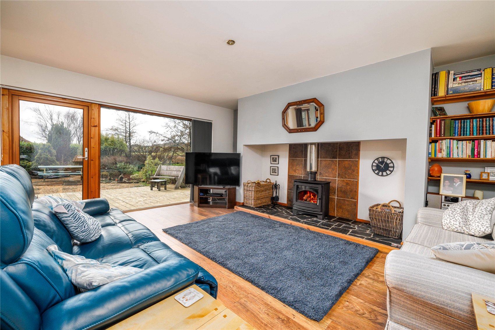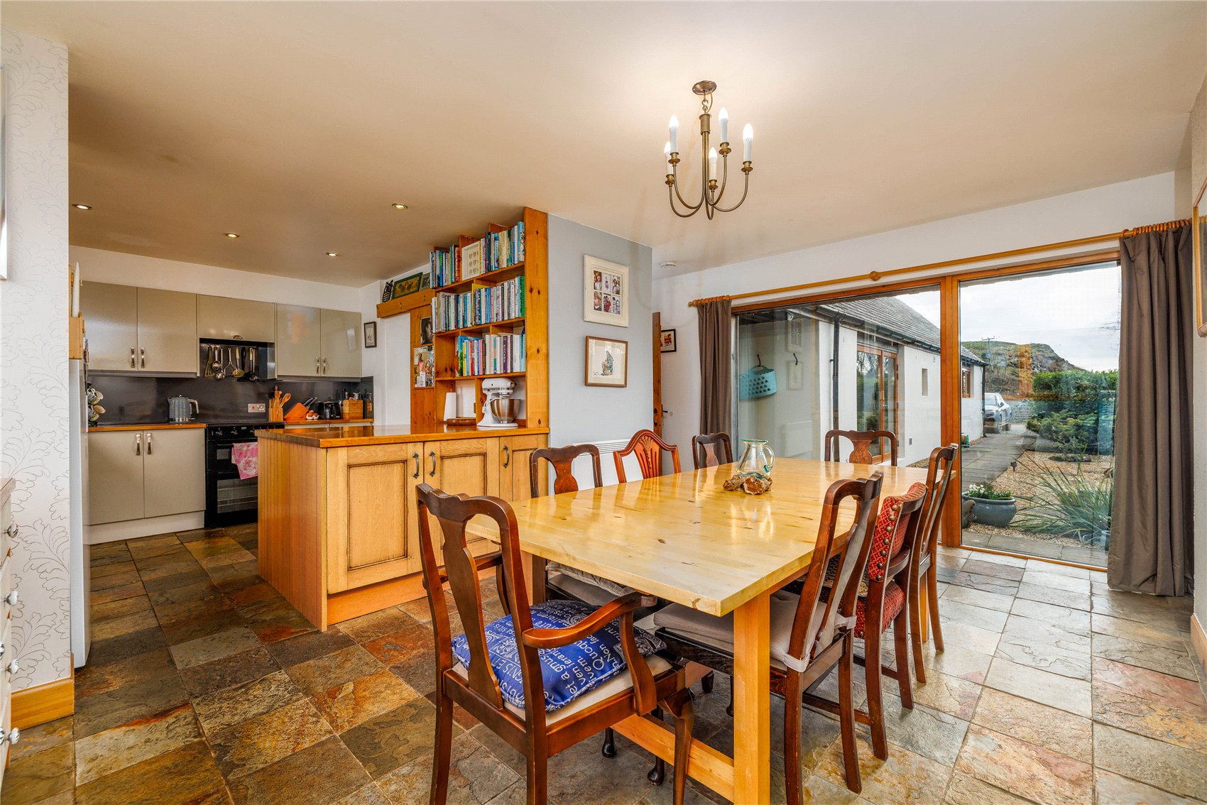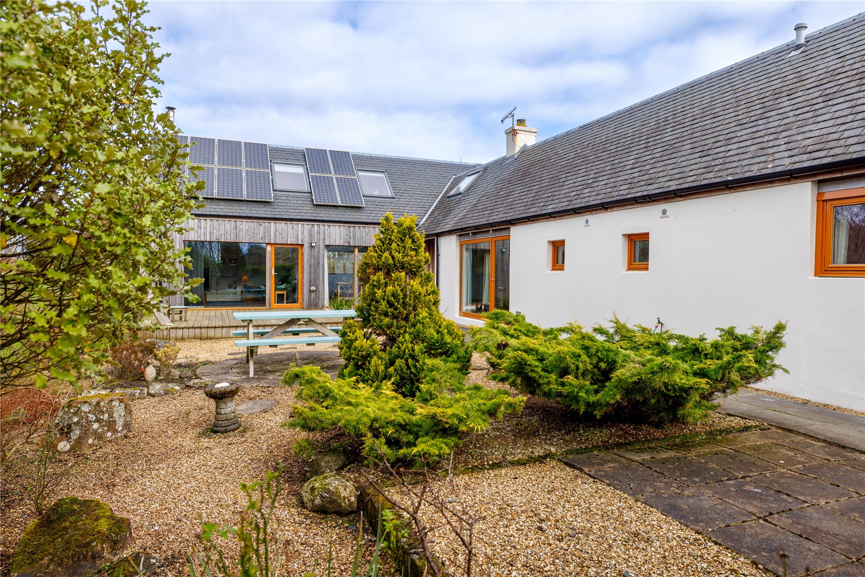 Outer front door with glass insert to welcoming entrance hall, vaulted ceiling with 2 x velux windows, Italian slate flooring and windows to gardens. Open plan formal dining cum stylish kitchen with windows to gardens, fitted utilities cupboard, under stair stores/pantry stores, formal sitting room with picture frame window and glass insert door to gardens and decking and a warming log burning stove set in a feature inglenook fireplace. Utility/laundry cupboard housing the electrical switch gear, wc with linen stores and Mega flow tank, bedroom 1 with window to gardens, en suite shower room. From the entrance hall to ‘annexe’, formal sitting room with electric imitation stove (there is a chimney for open fire or stove), picture frame window and glass insert door to gardens, kitchen, hall with cupboard housing the electrical switch gear, bathroom with spa bath, bedroom 2 and 3 with windows to gardens, door to rear gardens. (Access via ladder to fully boarded loft from a hatch in bedroom 2. Megaflow hot water for the annexe is in the loft)