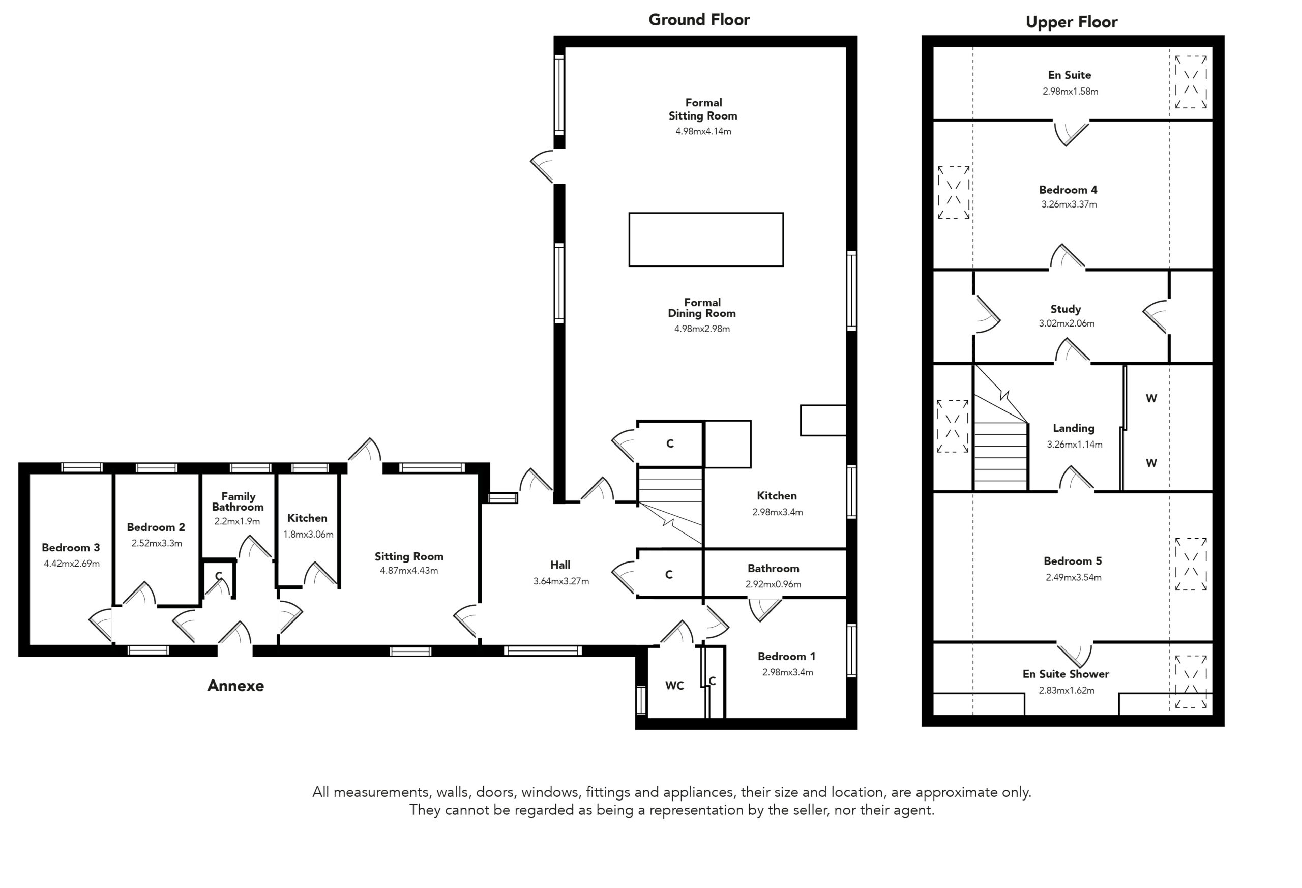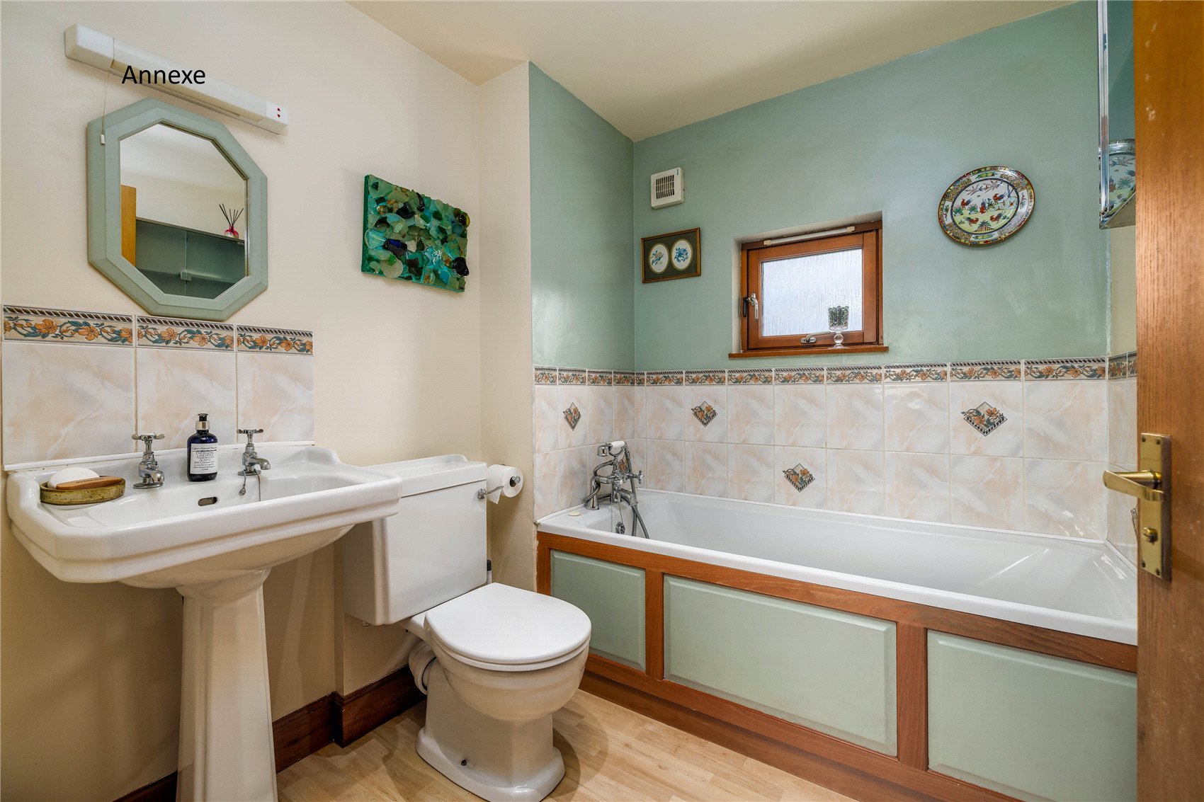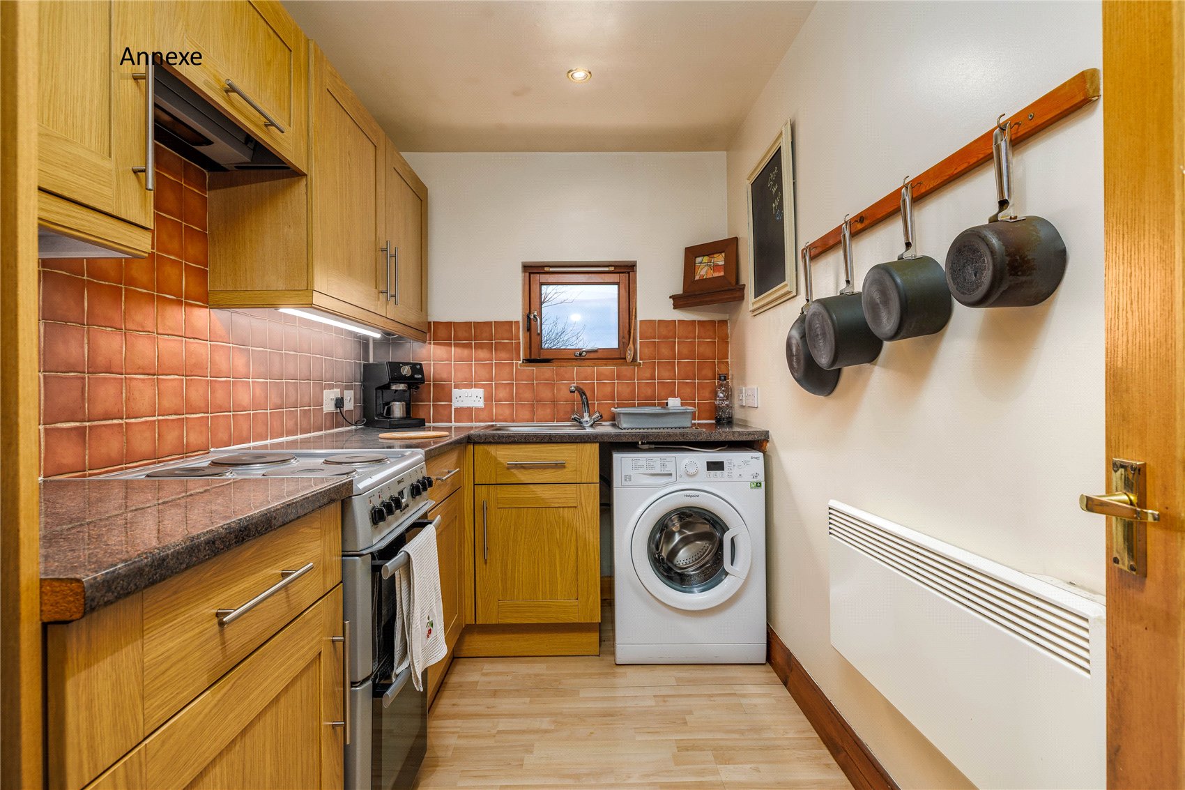 Outer front door with glass insert to welcoming entrance hall, vaulted ceiling with 2 x velux windows, Italian slate flooring and windows to gardens. Open plan formal dining cum stylish kitchen with windows to gardens, fitted utilities cupboard, under stair stores/pantry stores, formal sitting room with picture frame window and glass insert door to gardens and decking and a warming log burning stove set in a feature inglenook fireplace. Utility/laundry cupboard housing the electrical switch gear, wc with linen stores and Mega flow tank, bedroom 1 with window to gardens, en suite shower room. From the entrance hall to ‘annexe’, formal sitting room with electric imitation stove (there is a chimney for open fire or stove), picture frame window and glass insert door to gardens, kitchen, hall with cupboard housing the electrical switch gear, bathroom with spa bath, bedroom 2 and 3 with windows to gardens, door to rear gardens. (Access via ladder to fully boarded loft from a hatch in bedroom 2. Megaflow hot water for the annexe is in the loft)