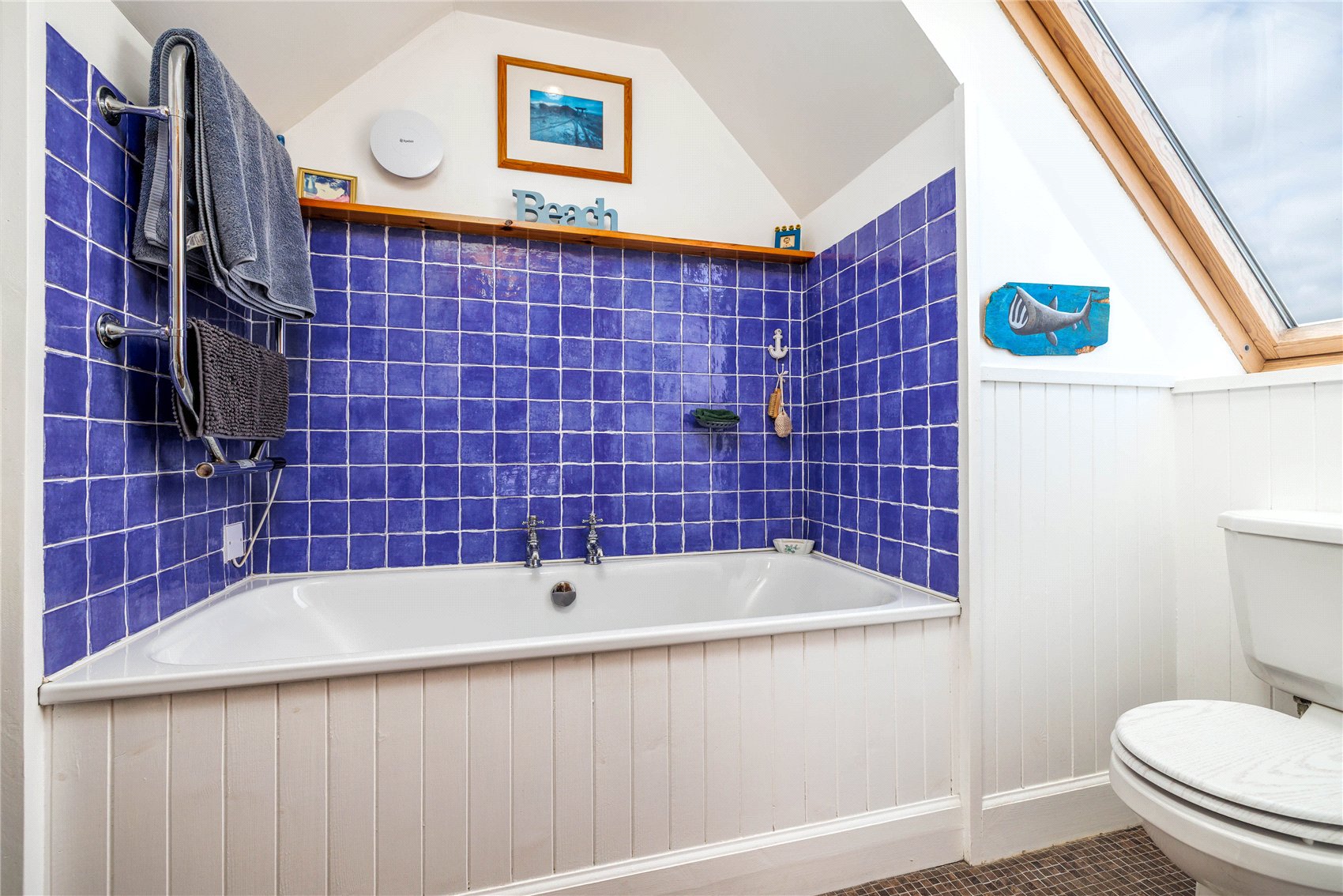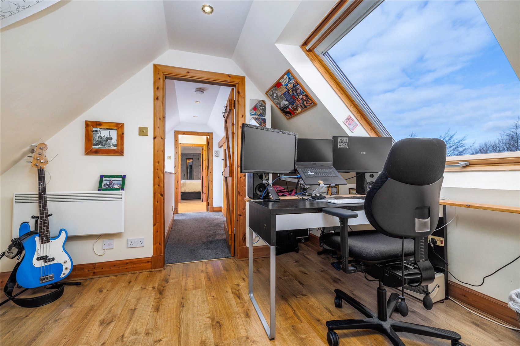 Via carpeted staircase to first floor landing, ample fitted stores, home office/study/dressing room with 1 x velux window and access to property eaves, bedroom 4 with 1 x velux window, en suite bathroom with velux window to gardens, bedroom 5 (currently set up as a study/music room) with 1 x velux window, en suite shower room.