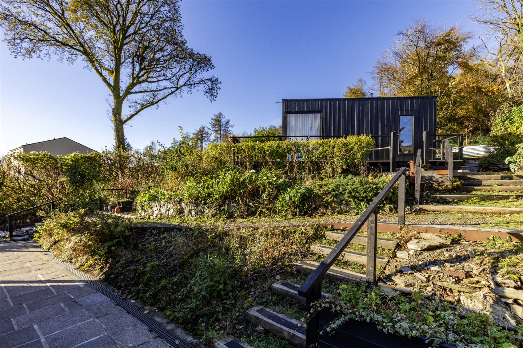 A mature woven willow hedge, maintained beds, bushes and planted flowers provide all year round interest and colour, raised soft fruit and vegetable beds bounded by tiered contemporary raised corrugated metal beds, staggered up the slope. The 10 corrugated raised beds are a bespoke solution for the local terrain. Ideal for people interested in growing their own food.