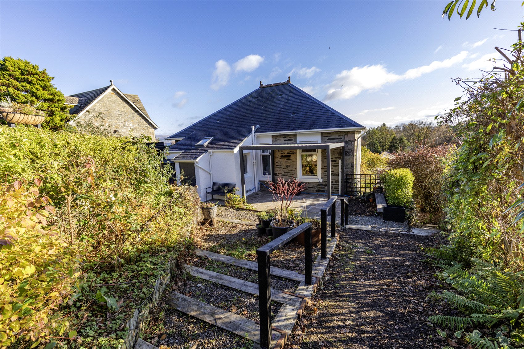 The house and its accommodation are laid out across one easily managed light and bright level with front facing rooms enjoying spectacular waterscape views. The gardens that surround the property have been beautifully landscaped and have created a wonderful nature habitat. 9 Victoria Road is completed in a combination of exposed stone and white, newly-painted stone, all of which is neatly presented under a dark grey slate roof.