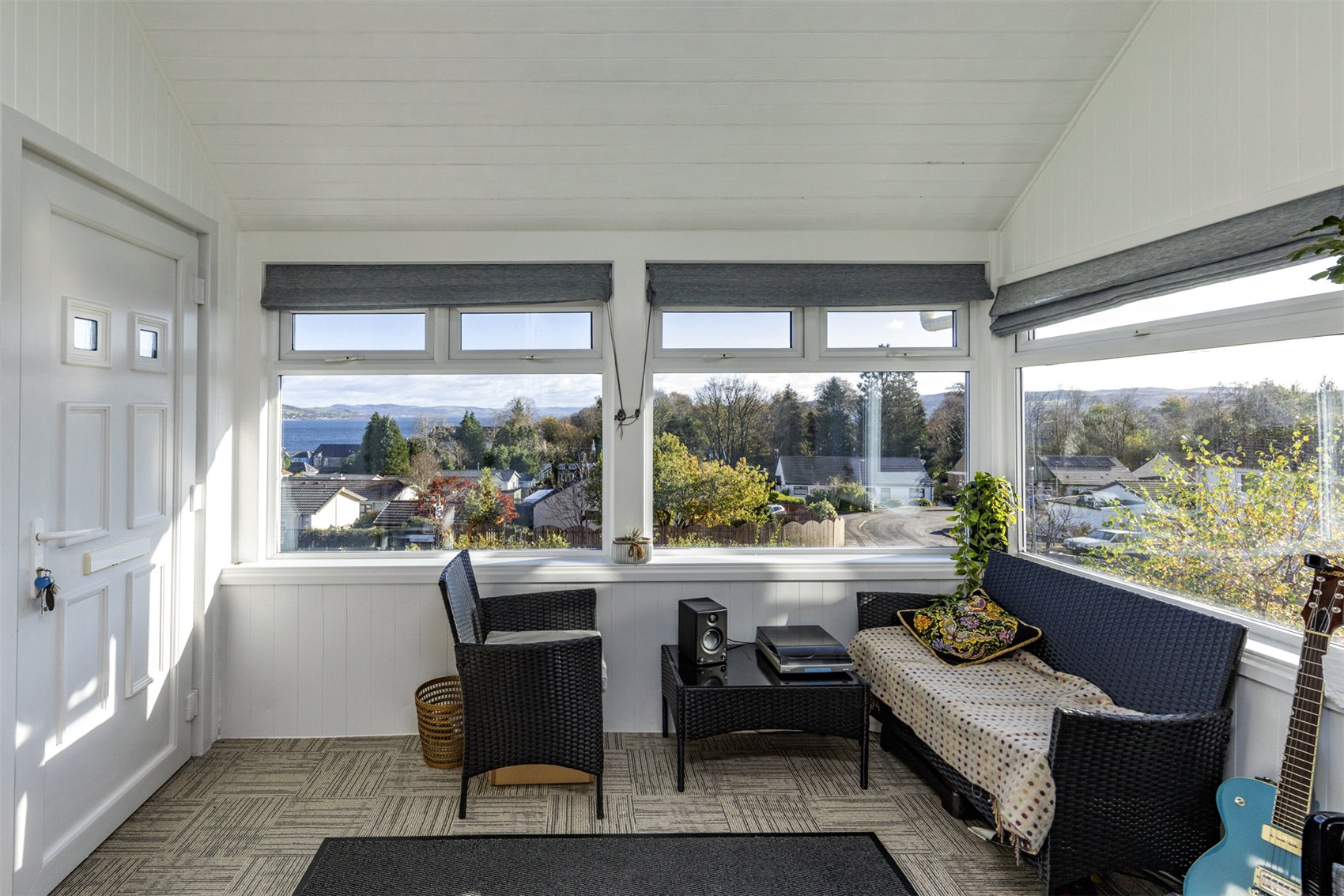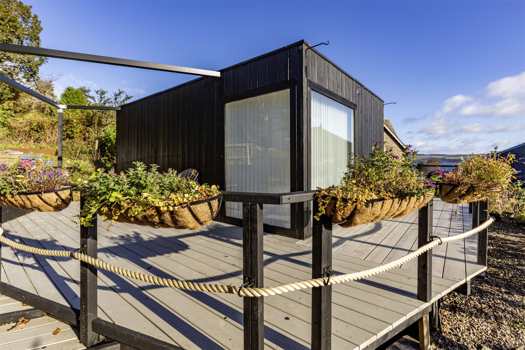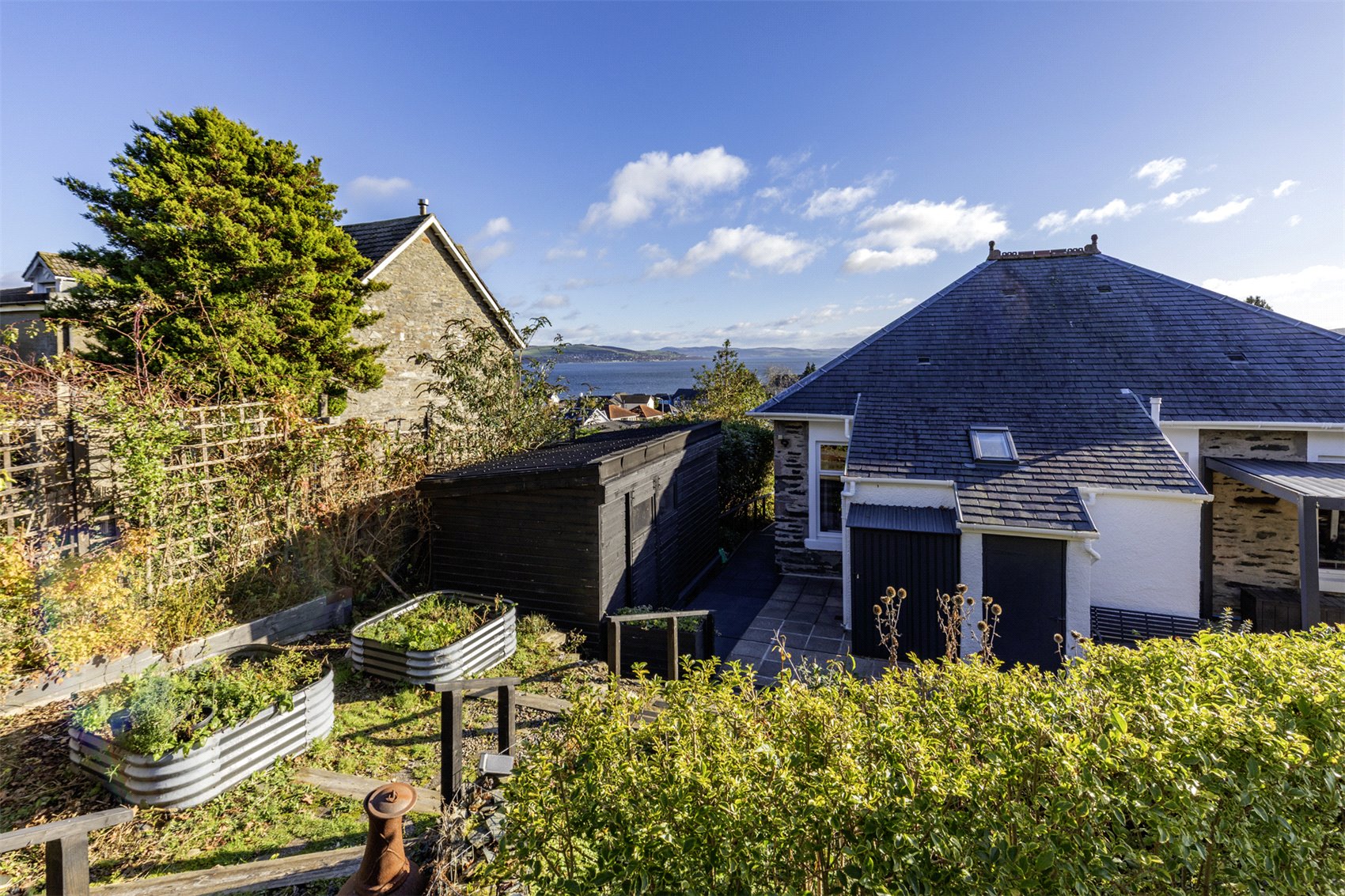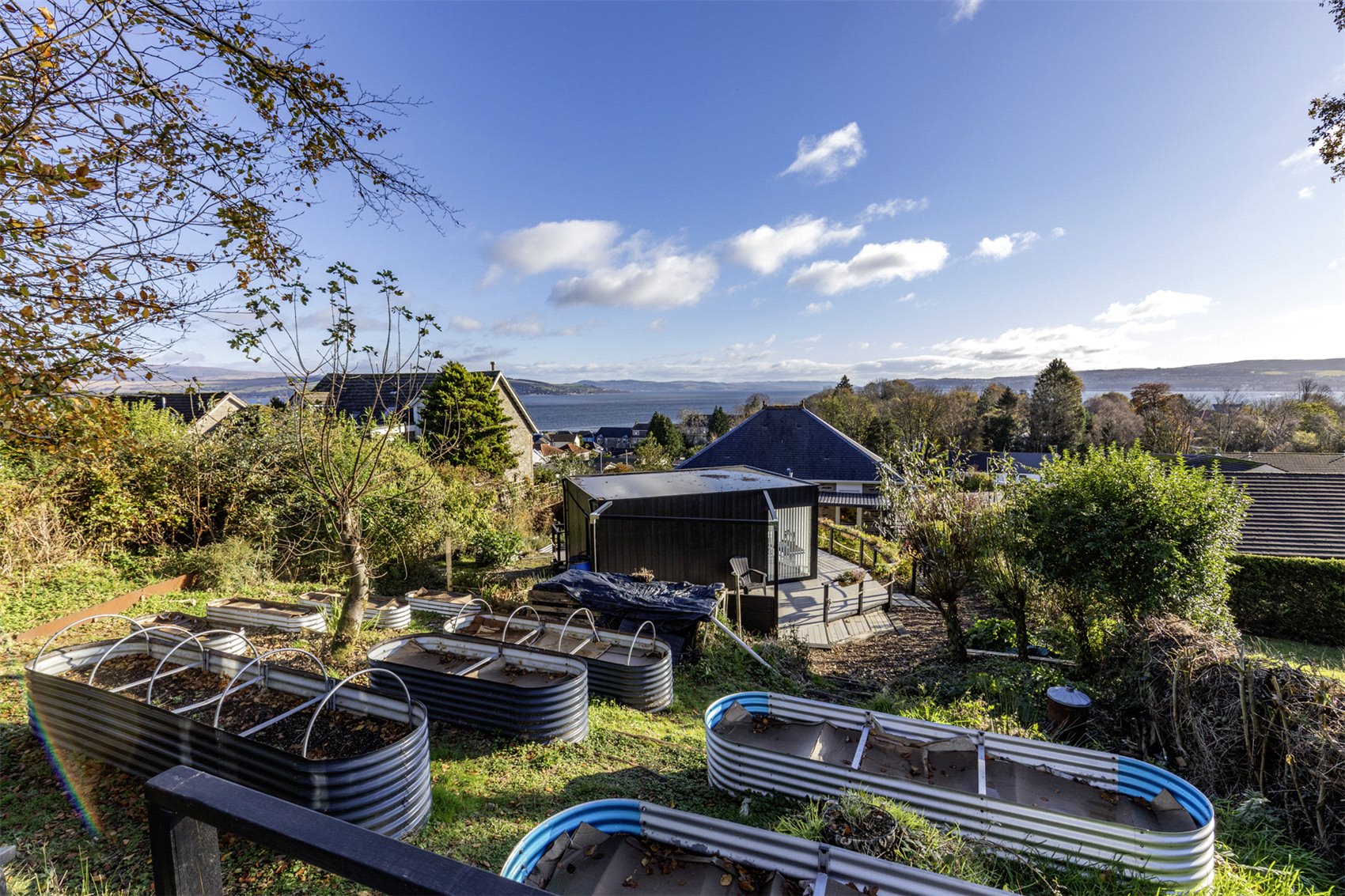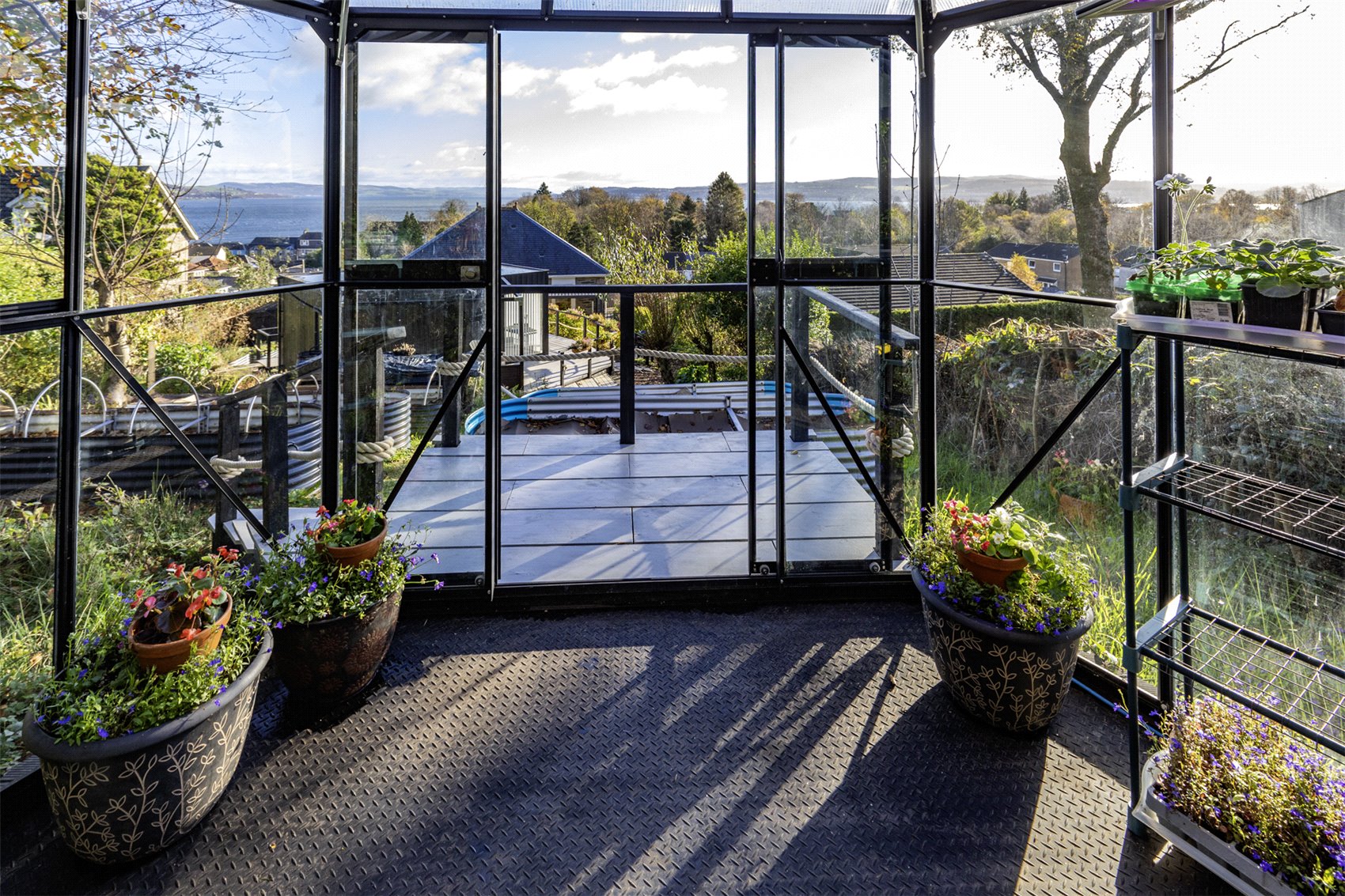 A large hexagonal glass greenhouse/summerhouse/meditation space, with viewing deck, offers fabulous wide open views to Roseneath point, the Lomond Hills and the merging of the three lochs into the Firth of Clyde.