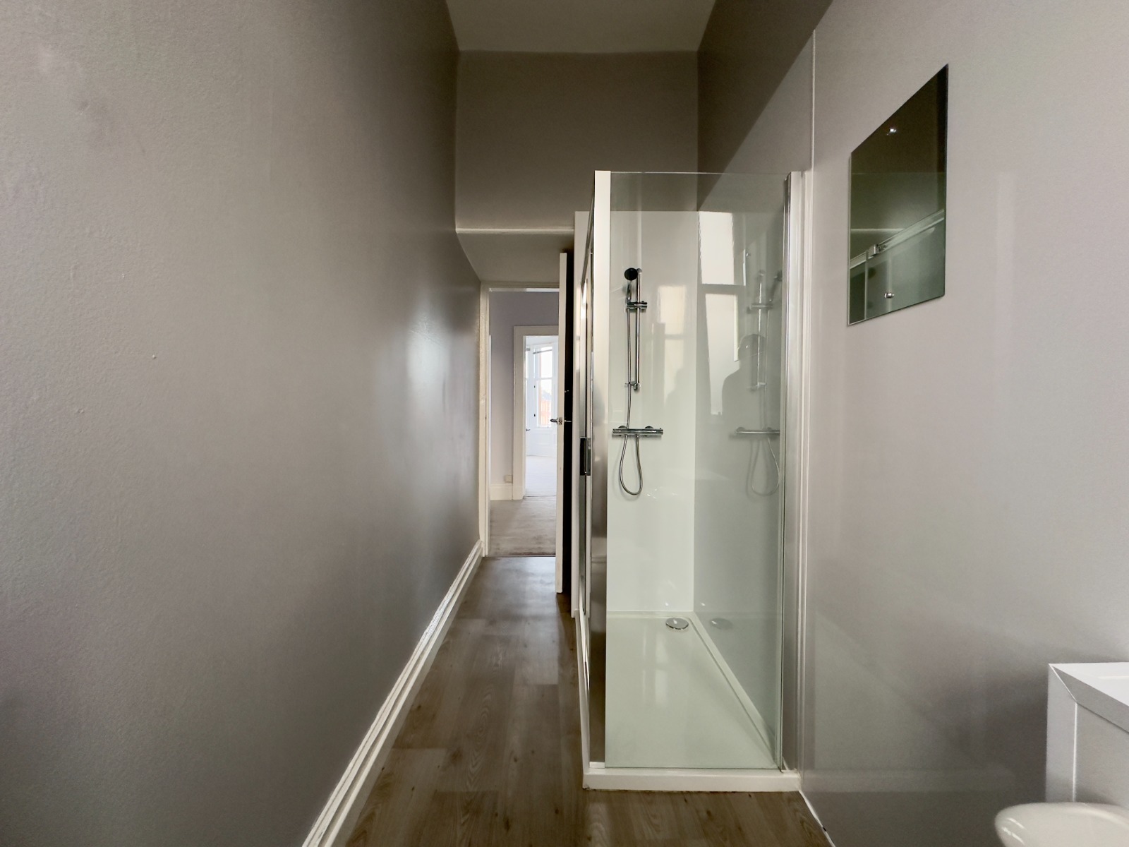The accommodation comprises of, bright entrance hallway with two storage cupboards, bright and spacious lounge with bay window and walk in cloakroom, large front facing double bedroom with walk in wardrobe and smaller double bedroom to the rear. The newly installed fitted kitchen is modern and spacious with white gloss units housing integrated appliances including washing machine, dishwasher, fridge freezer, oven, hob and cooker hood to one end and space for a dining area at the other end. The shower room comprises of double walk in shower, sink & wc.