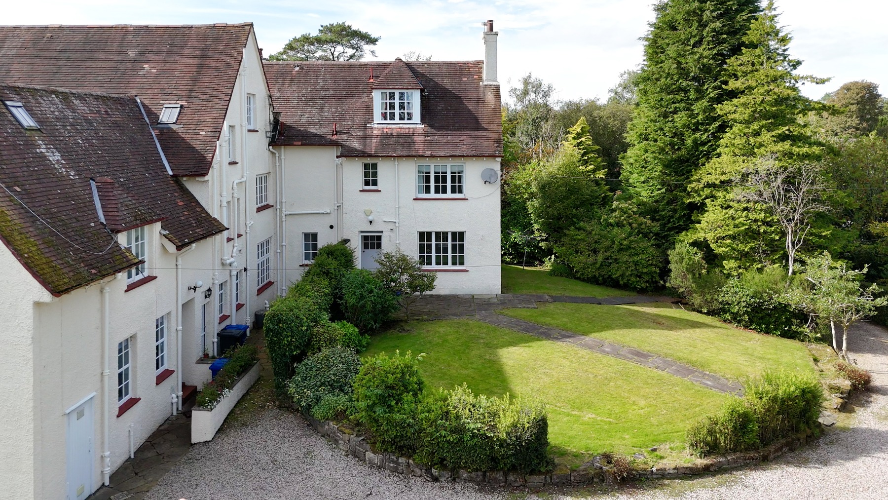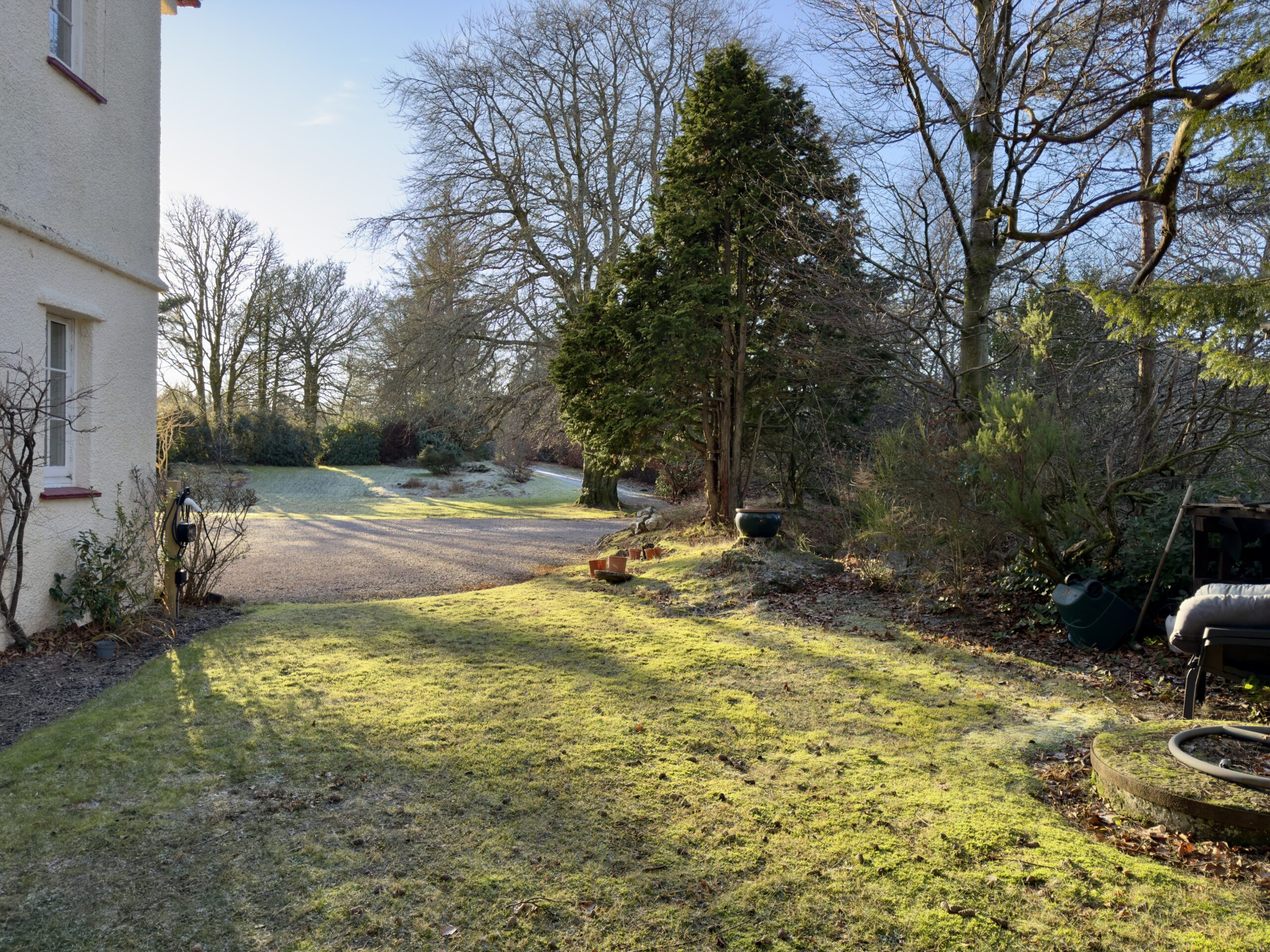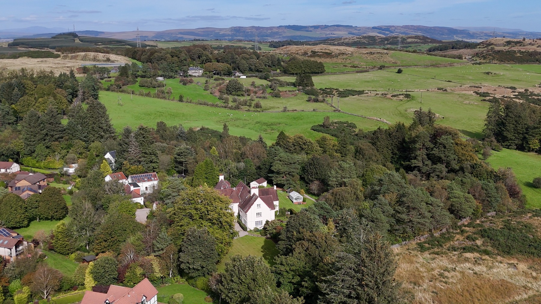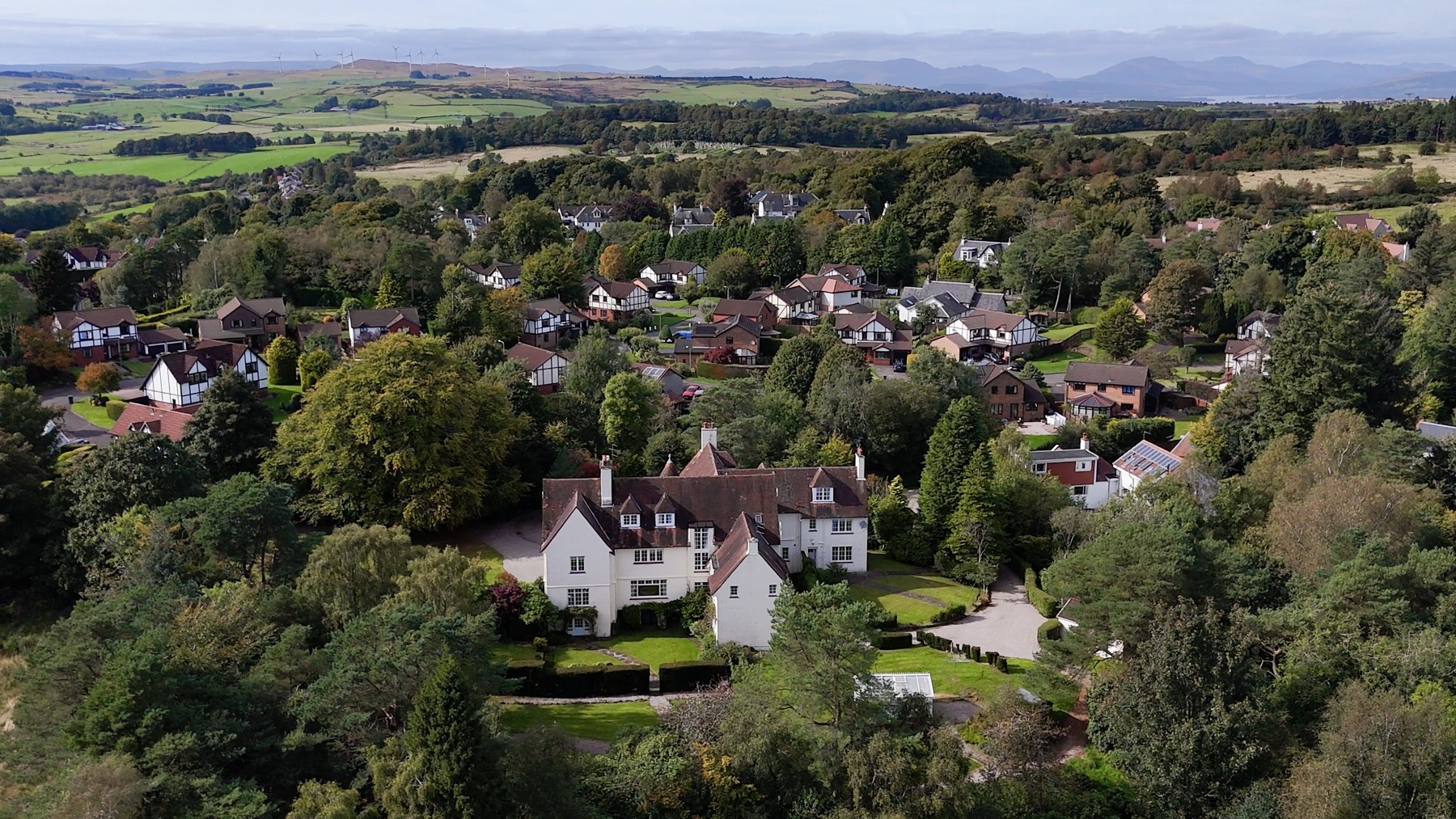 Overton Hall enjoys an enviable position on the upper fringe of Kilmacolm, one of Inverclyde’s most desirable and well-regarded villages, renowned for its strong sense of community, excellent schooling and picturesque surroundings. The property is approached via a private driveway, set within parkland-style grounds, offering a peaceful and secluded setting with a countryside feel.