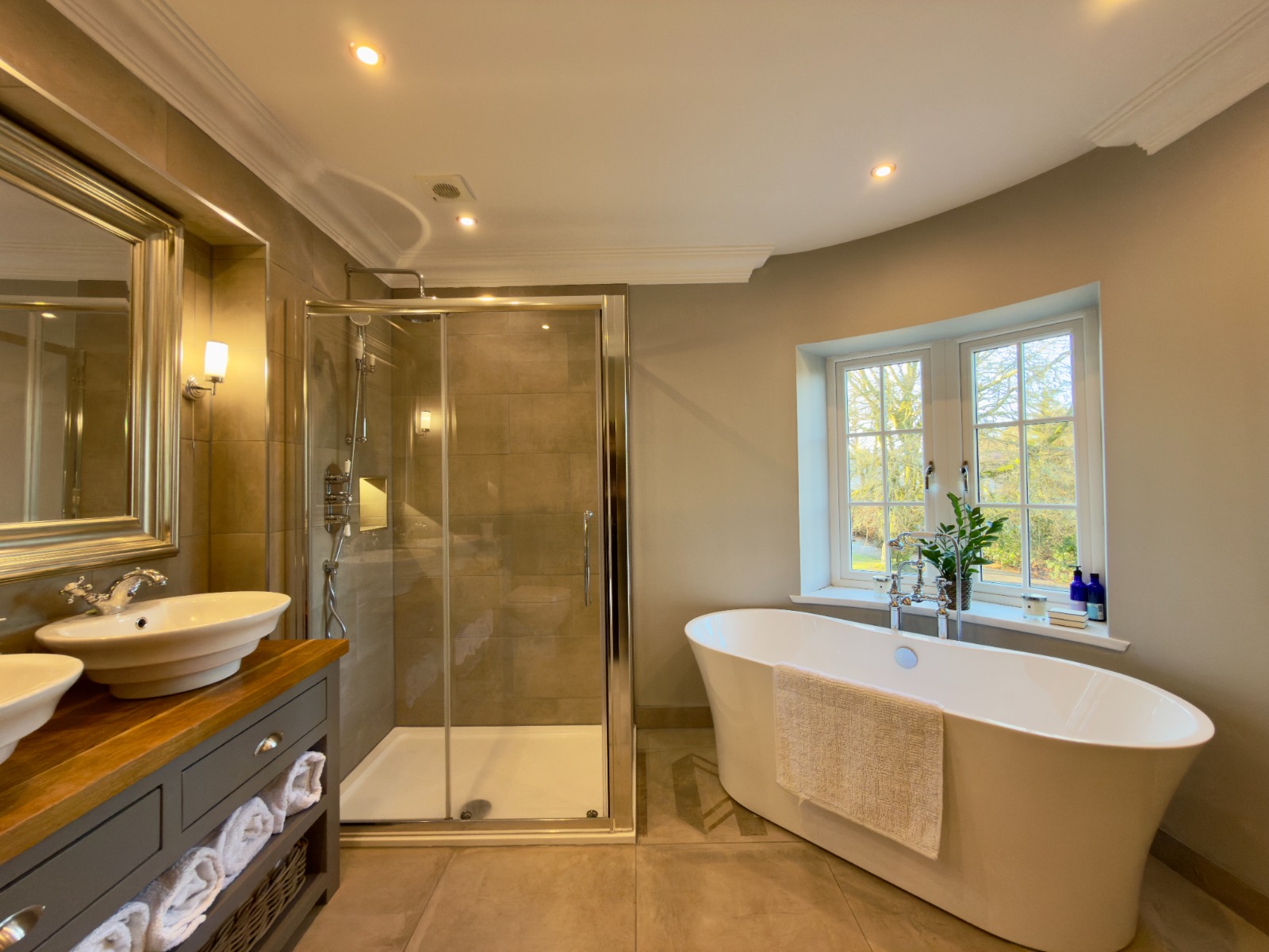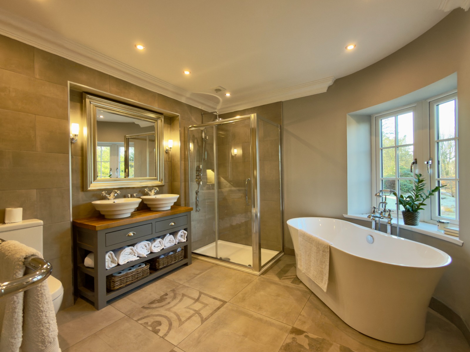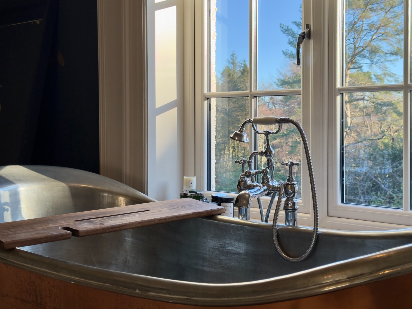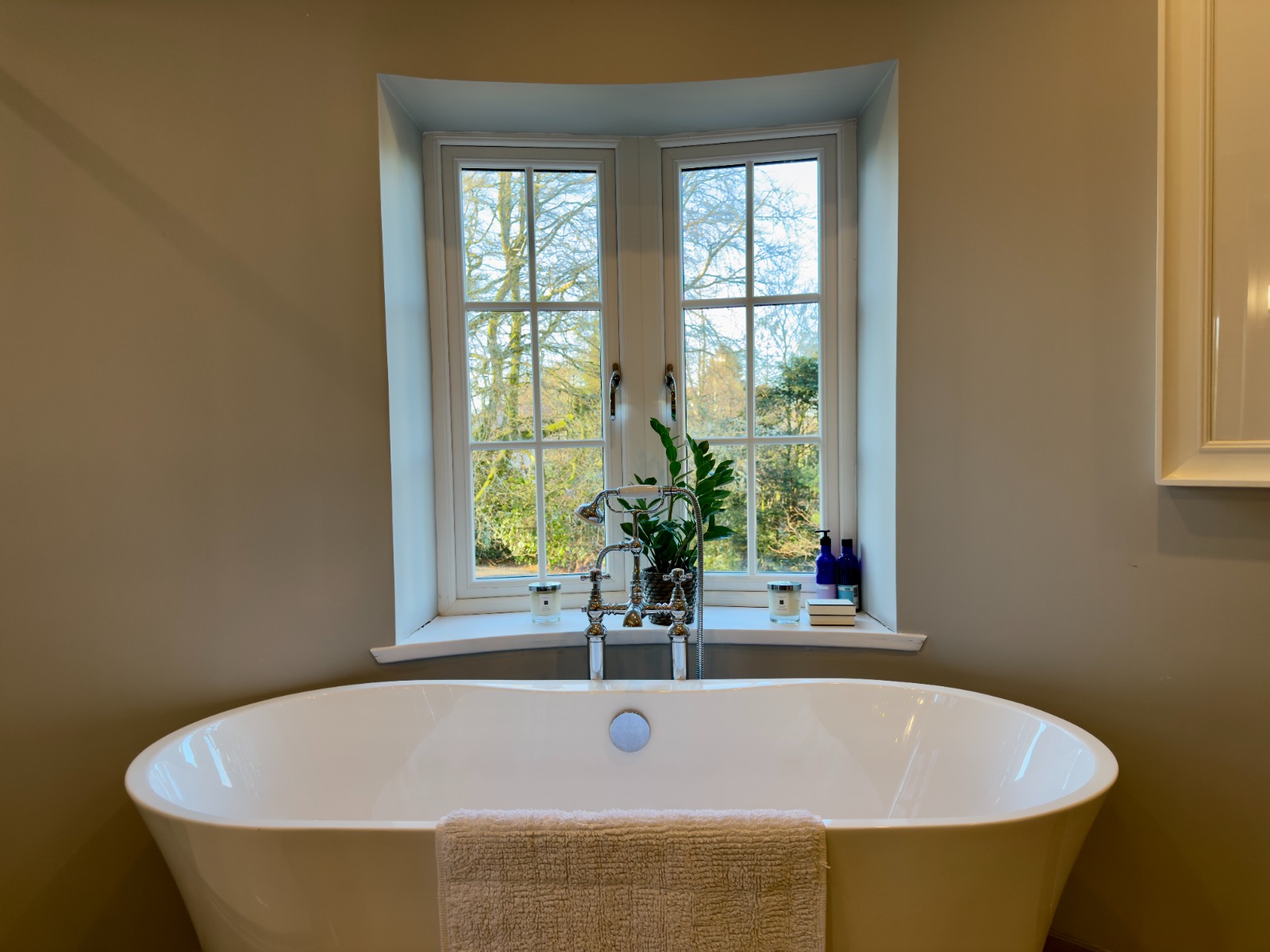 The property offers four generous double bedrooms, each beautifully presented. The principal bedroom is particularly impressive, featuring a freestanding luxurious copper bath positioned by the window, allowing one to enjoy elevated views while bathing, a standout and rarely found feature in rental property.
