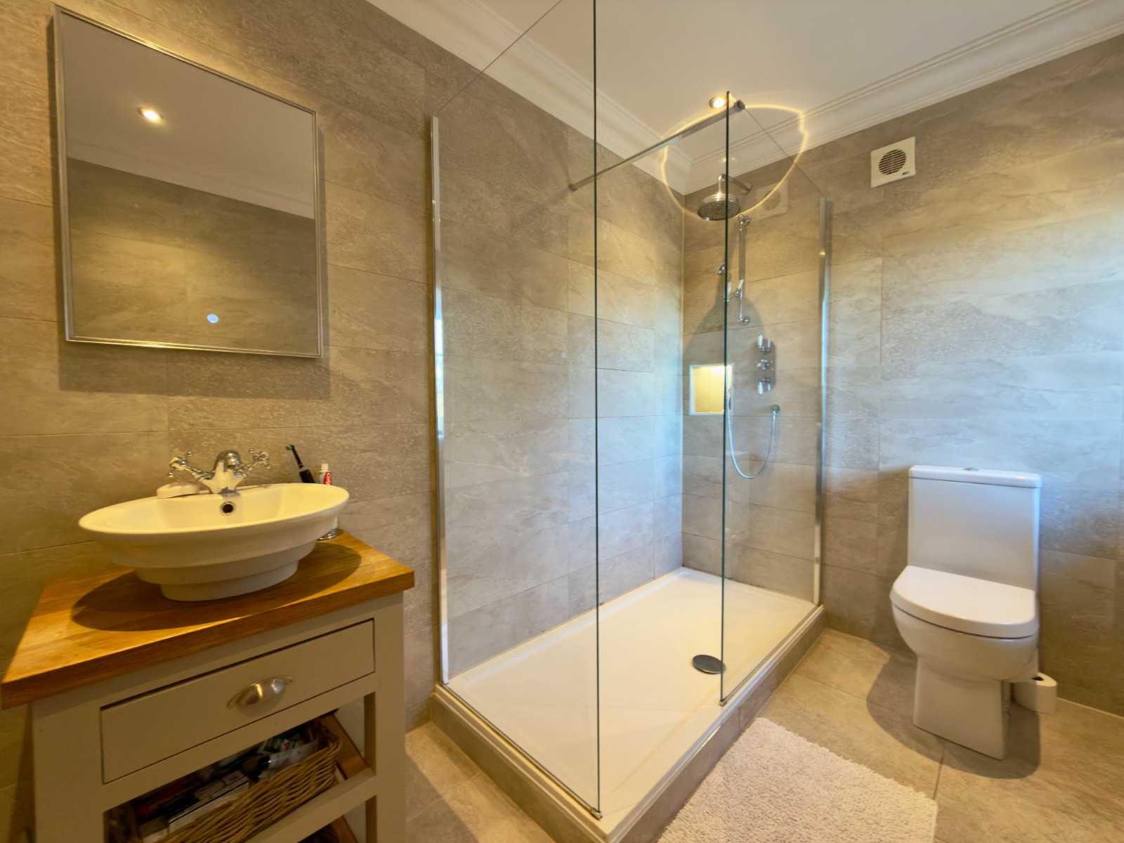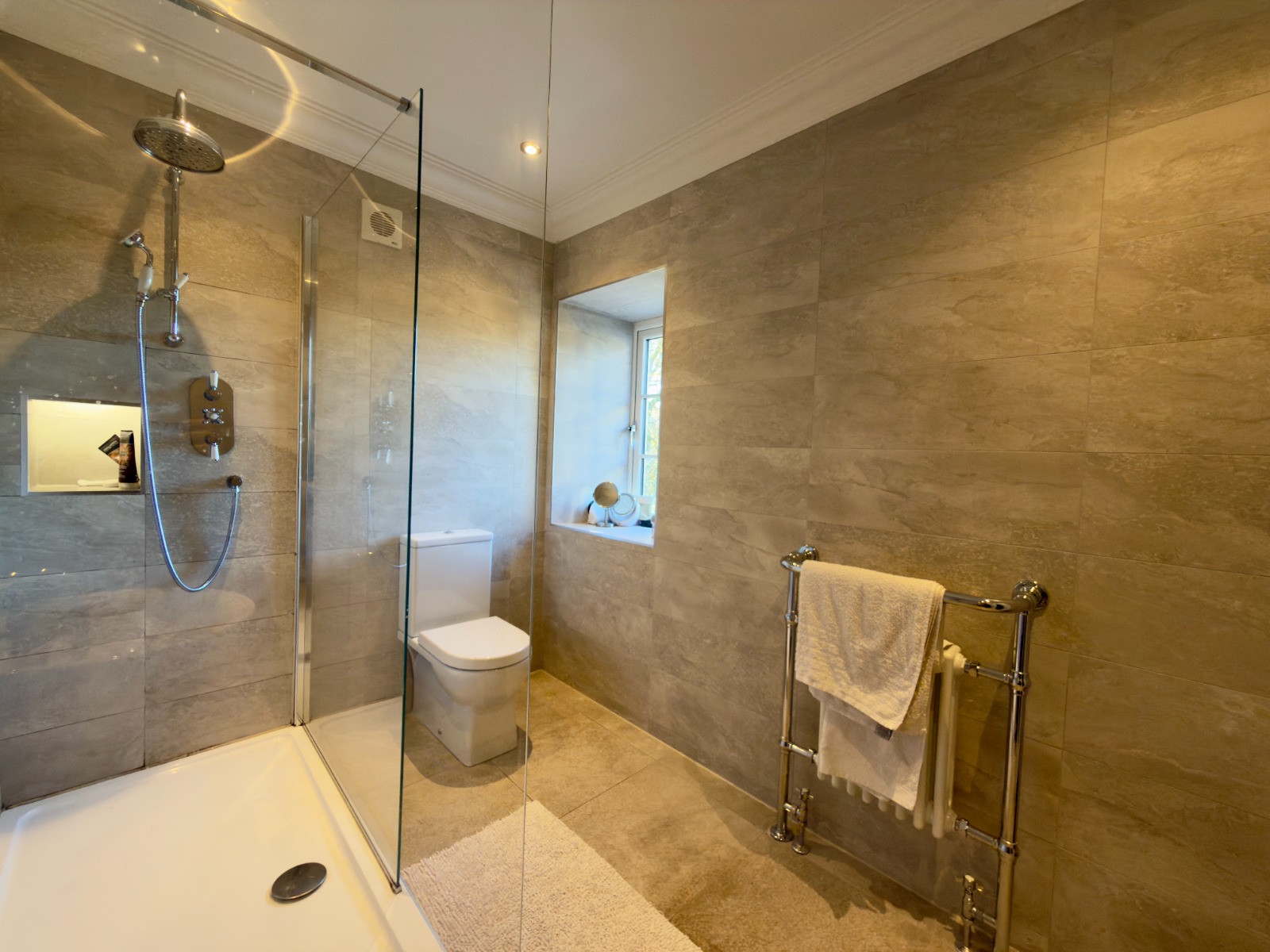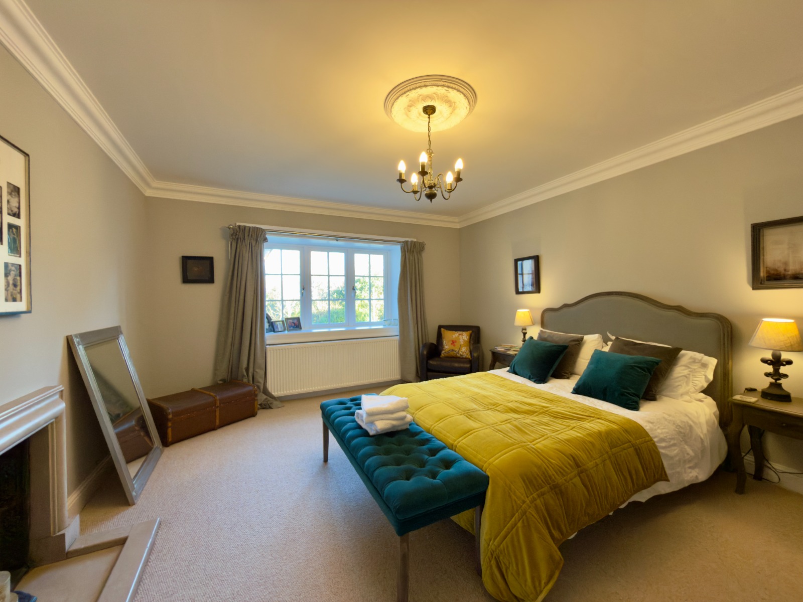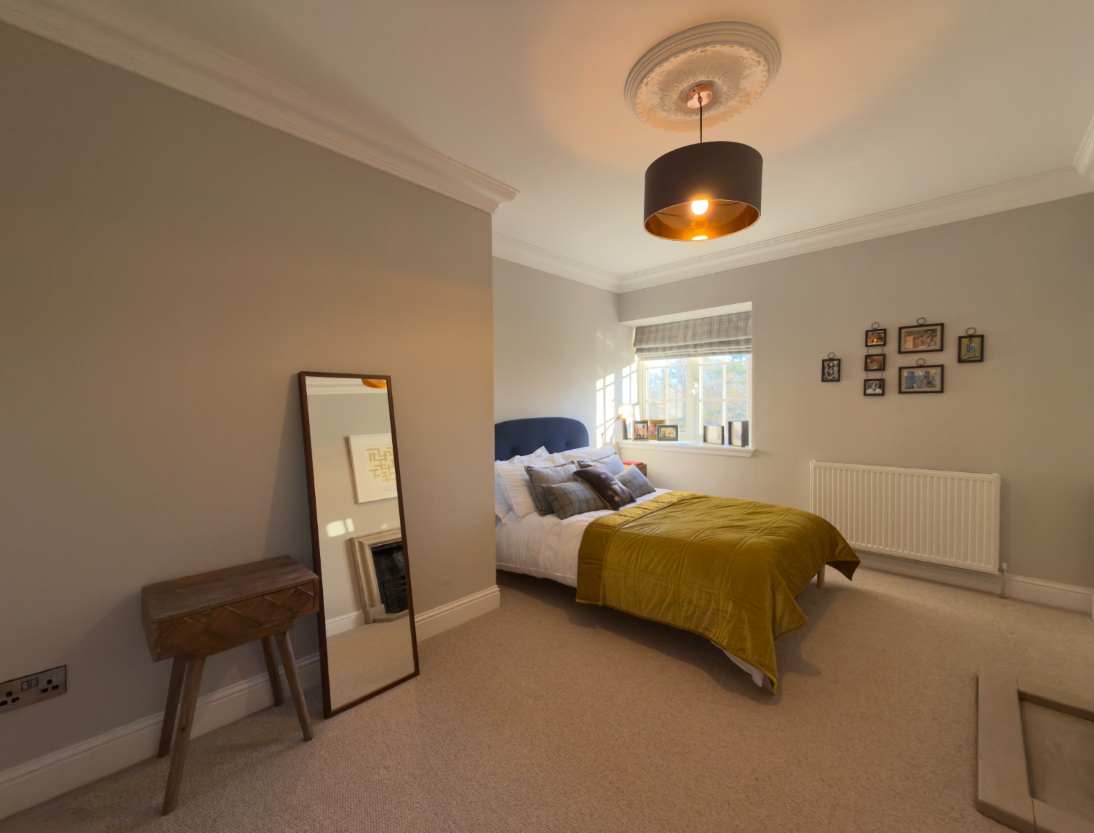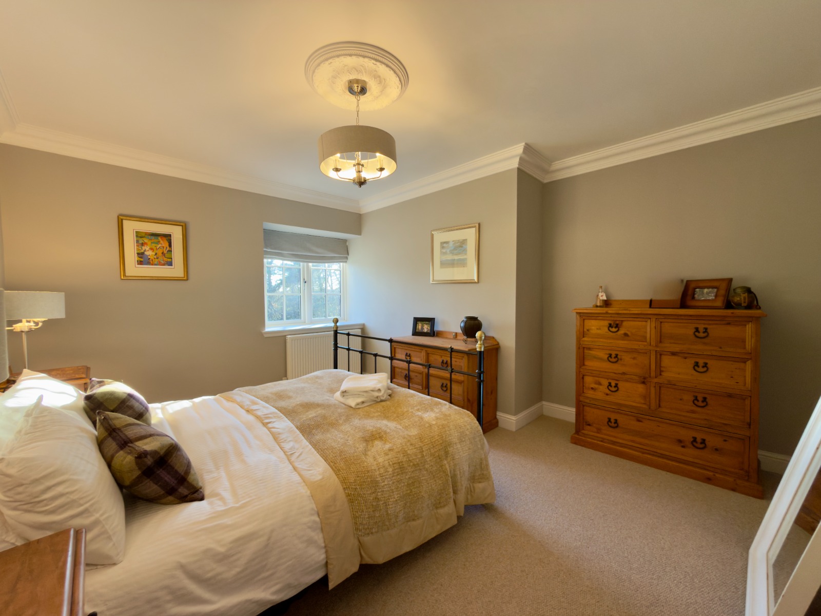 The property offers four generous double bedrooms, each beautifully presented. The principal bedroom is particularly impressive, featuring a freestanding luxurious copper bath positioned by the window, allowing one to enjoy elevated views while bathing, a standout and rarely found feature in rental property.