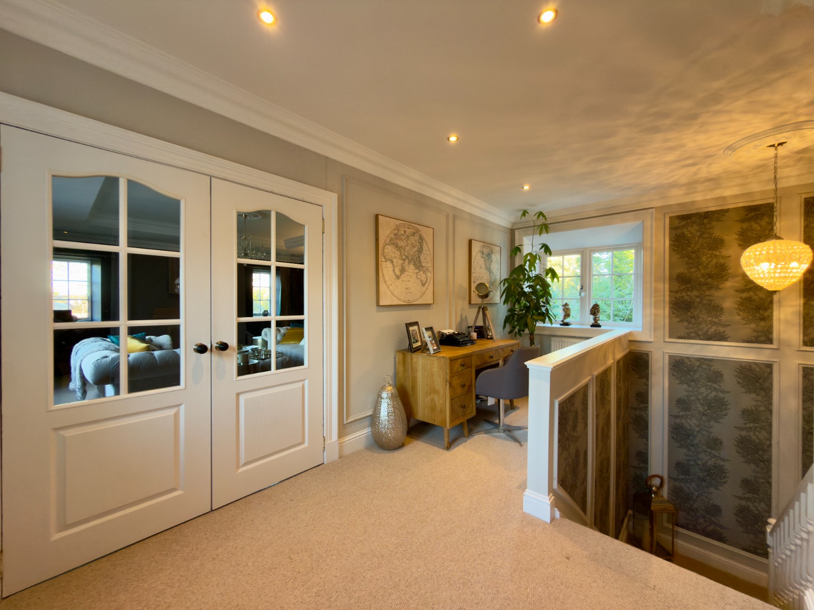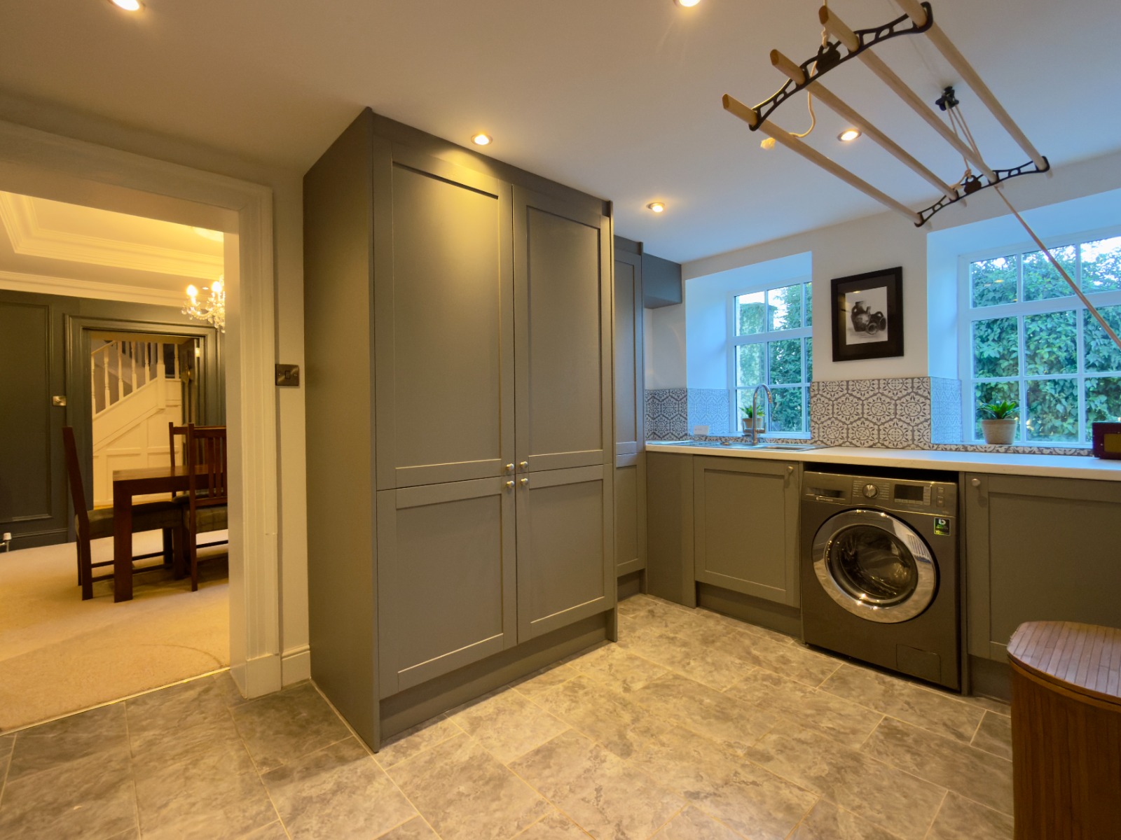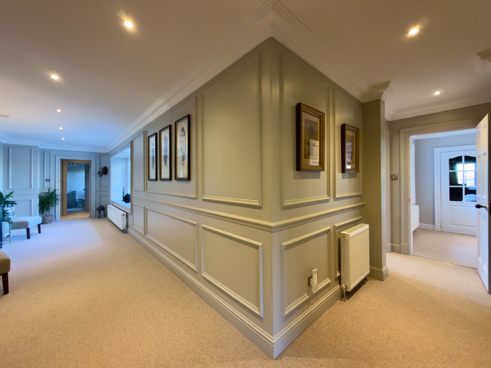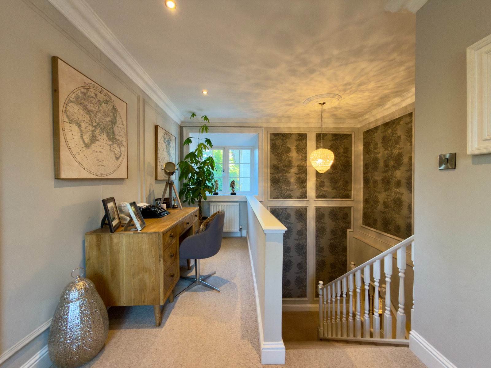 Further accommodation includes a well-appointed utility room, extensive storage throughout the house including a large dedicated storage room, airing cupboard and a spacious stair landing currently utilised as a home office, demonstrating the flexibility of the layout for modern working-from-home requirements.