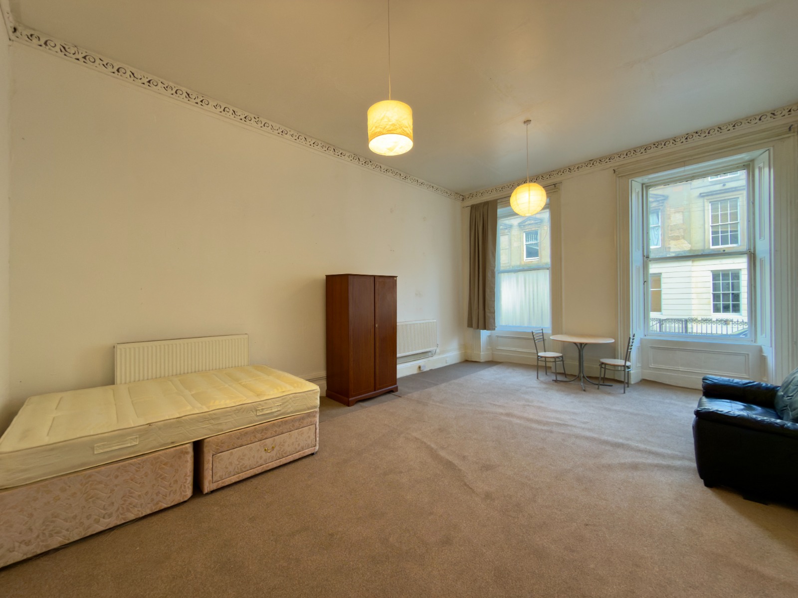 Modestly furnished and presented very large 2 bedroomed flat offering superb sized accommodation. No common lounge. Good sized dining kitchen with white goods to include, washing machine, fridge freezer and cooking facilities with oven. ******* check if cooker or oven & hob***** Bathroom with over the bath shower. Gas central heating. Whilst the flat is modest in appearance that has been reflected within the pricing.. Viewing is essential to fully appreciated the value for money in todays market.